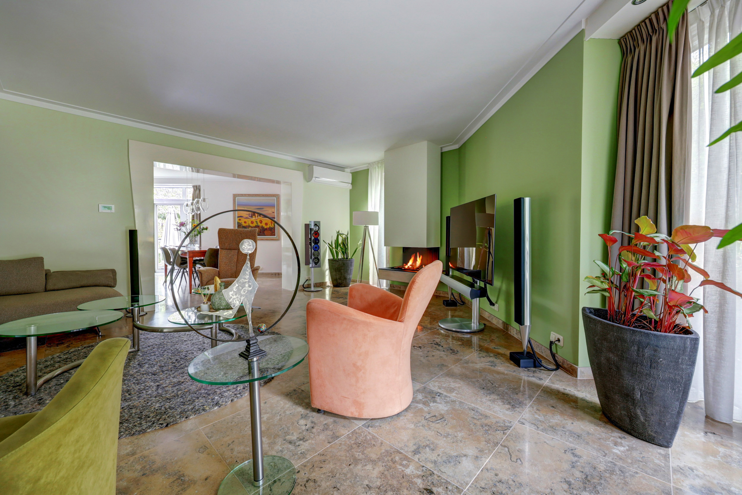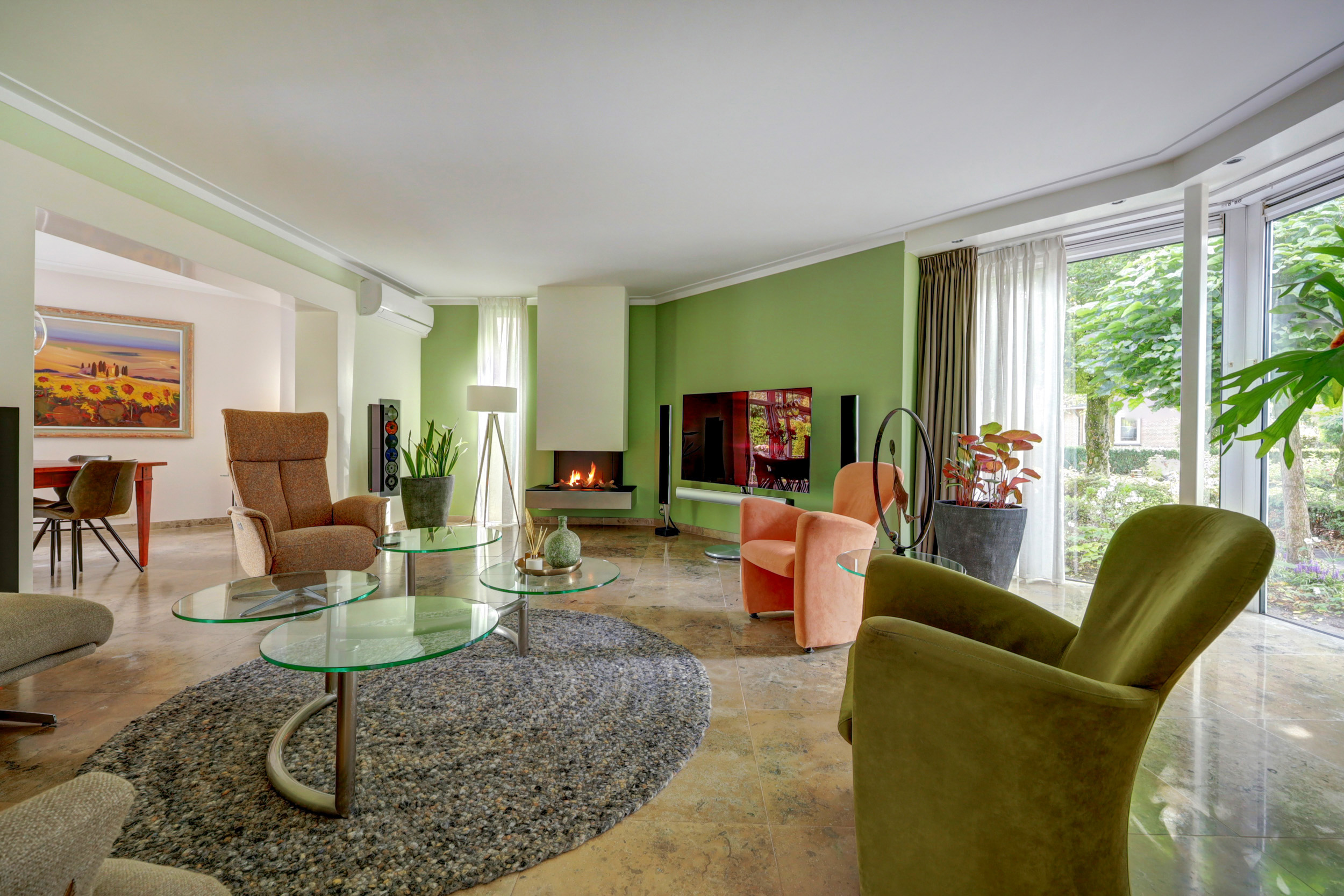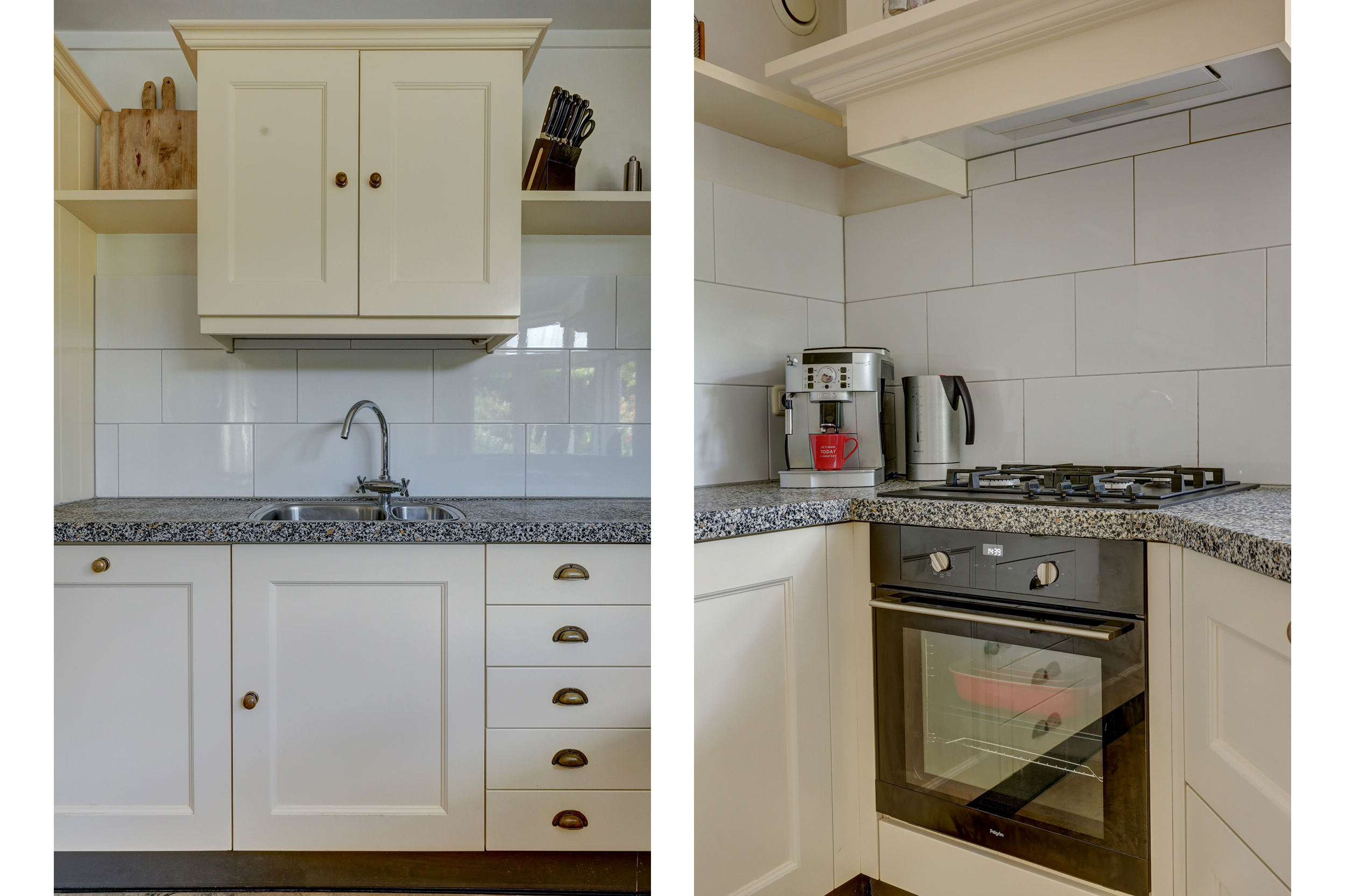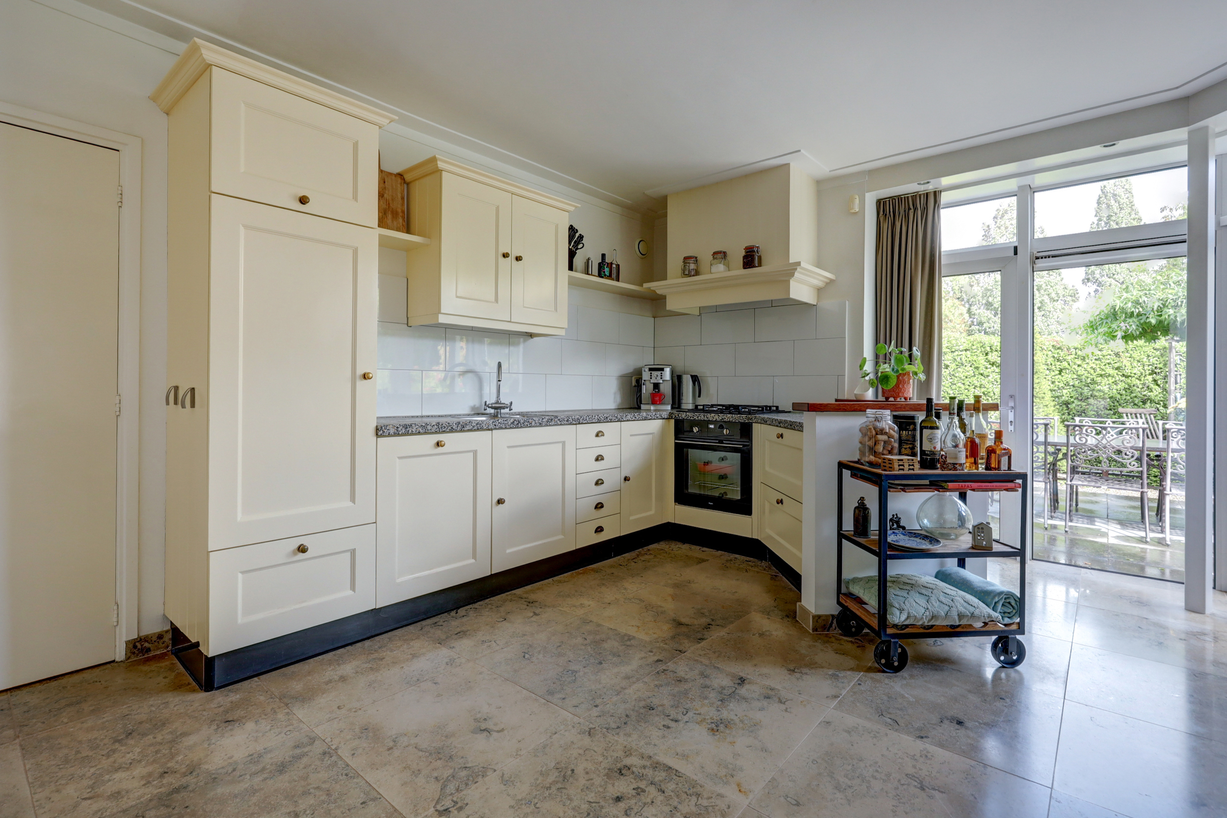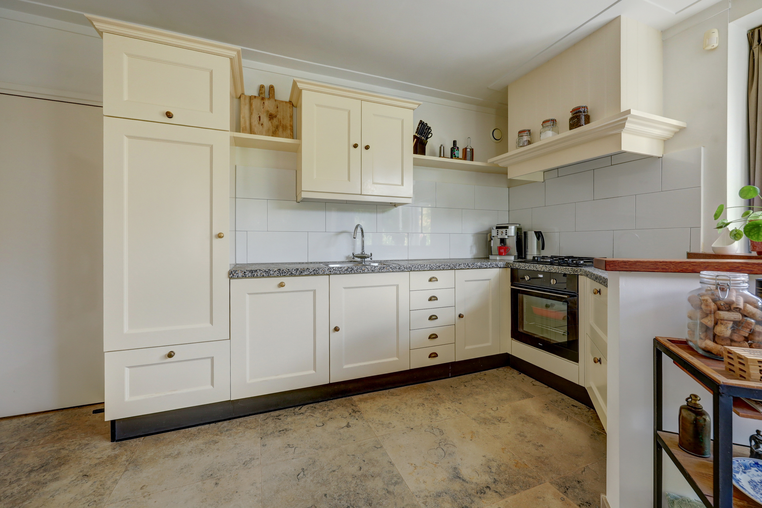 De royale woonkamer is een heerlijke leefruimte, voorzien van een sfeervolle gashaard en airconditioning. De open verbinding naar de woonkeuken maakt dit het hart van het huis. De landelijke keuken beschikt over een schiereiland, een 4-pits gasfornuis, afzuigkap, oven, koelkast en vaatwasser. Dankzij de grote tuingerichte pui valt het licht rijkelijk binnen en is er ruimte genoeg voor een royale eethoek.