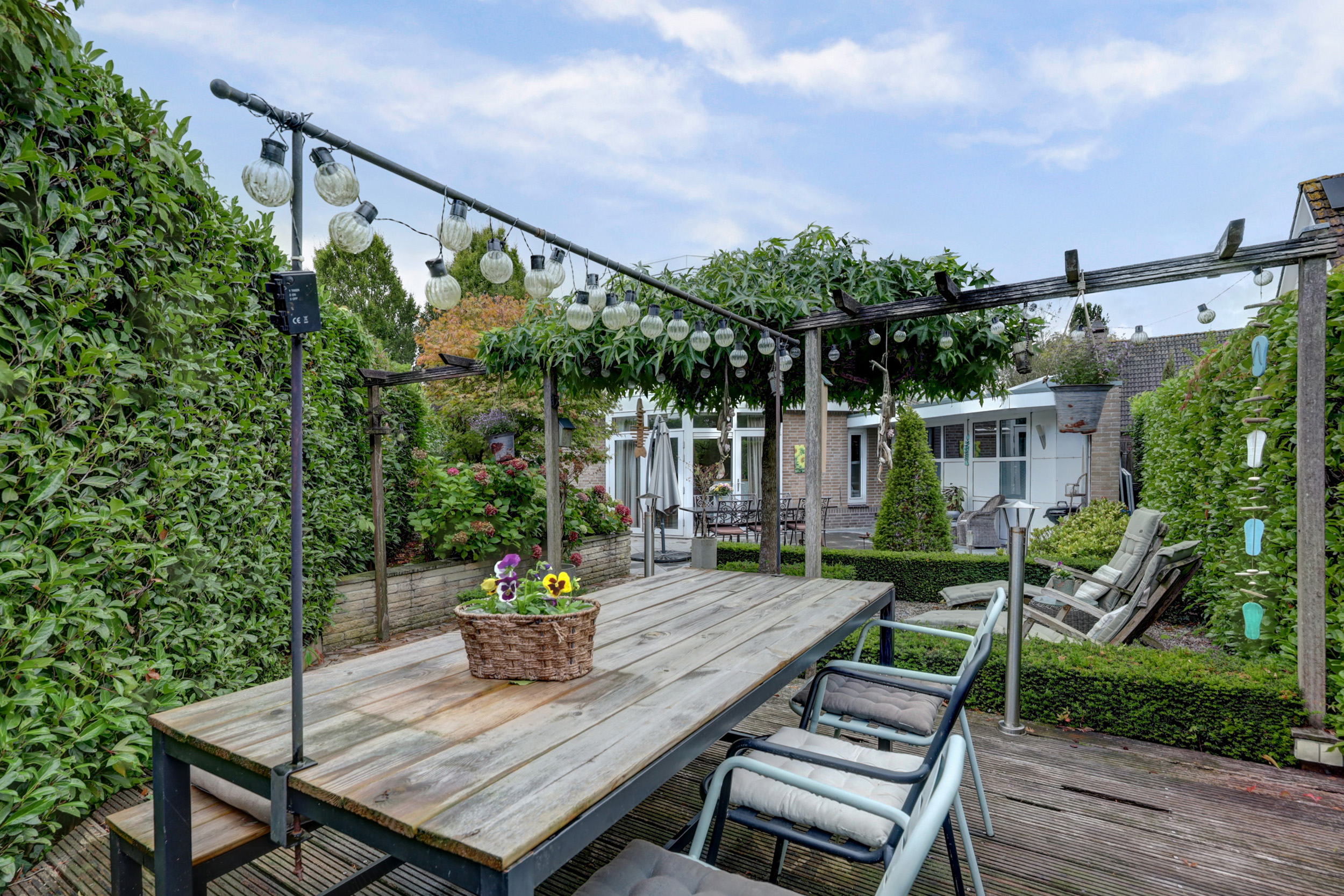 De achtertuin is oostelijk georiënteerd, waardoor u geniet van veel zonuren. De tuin is verzorgd aangelegd met een luxe terras, groen aan de achterzijde met struiken en bomen en een sfeervolle vlonder. Aan de voorzijde beschikt de woning over een oprit met plaats voor twee auto's.