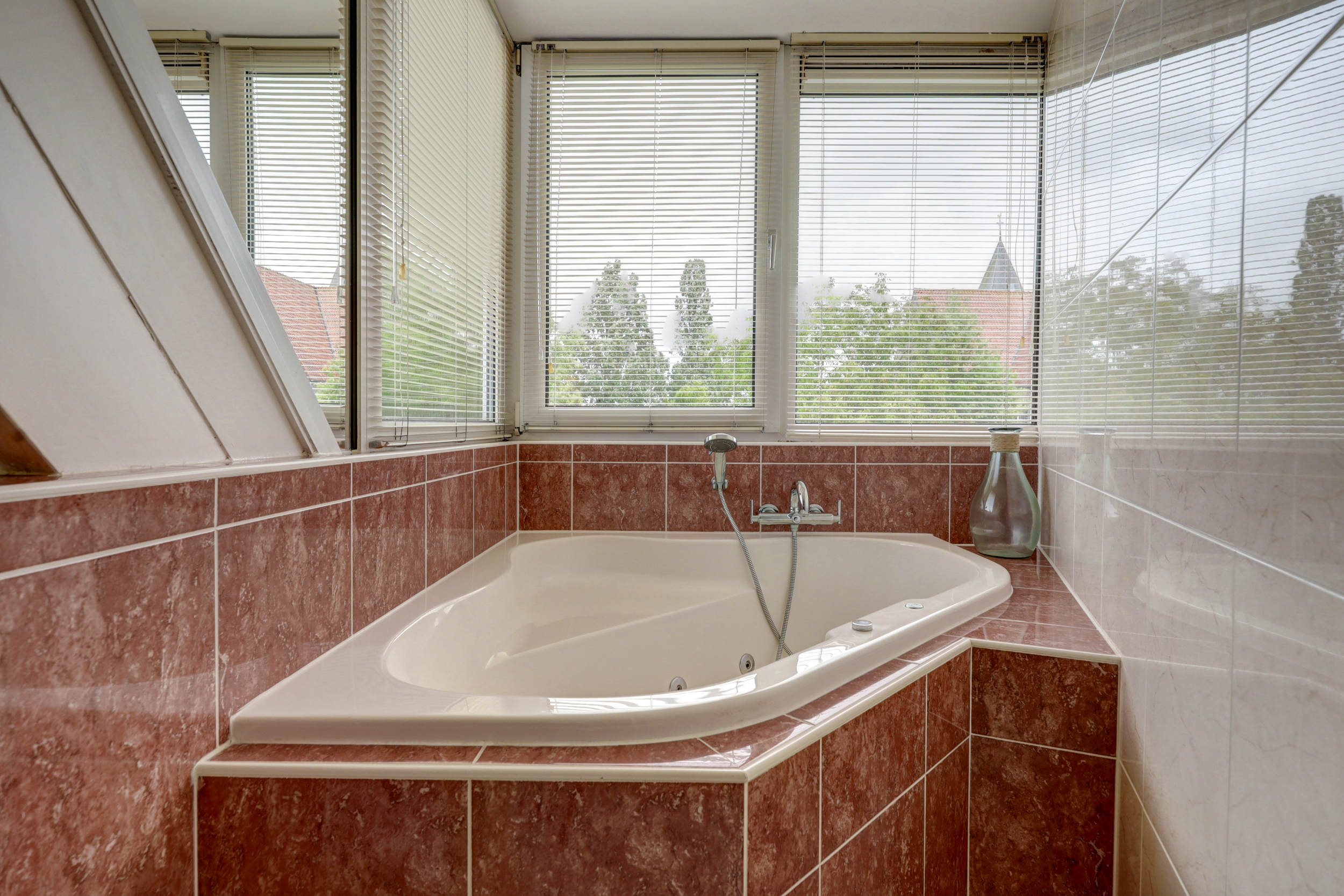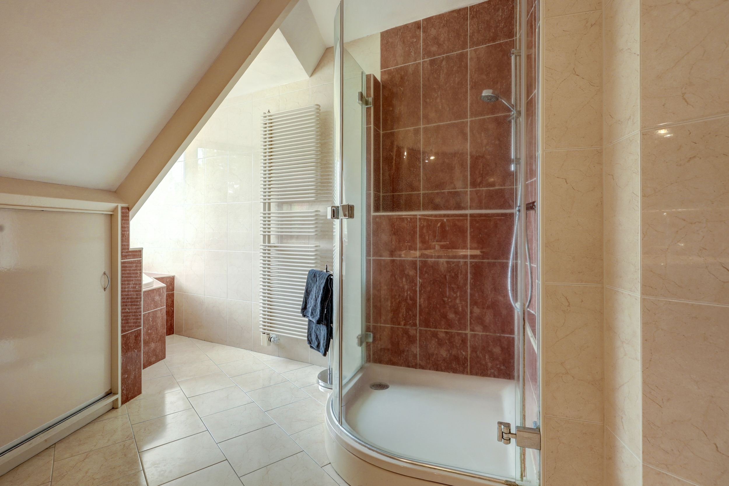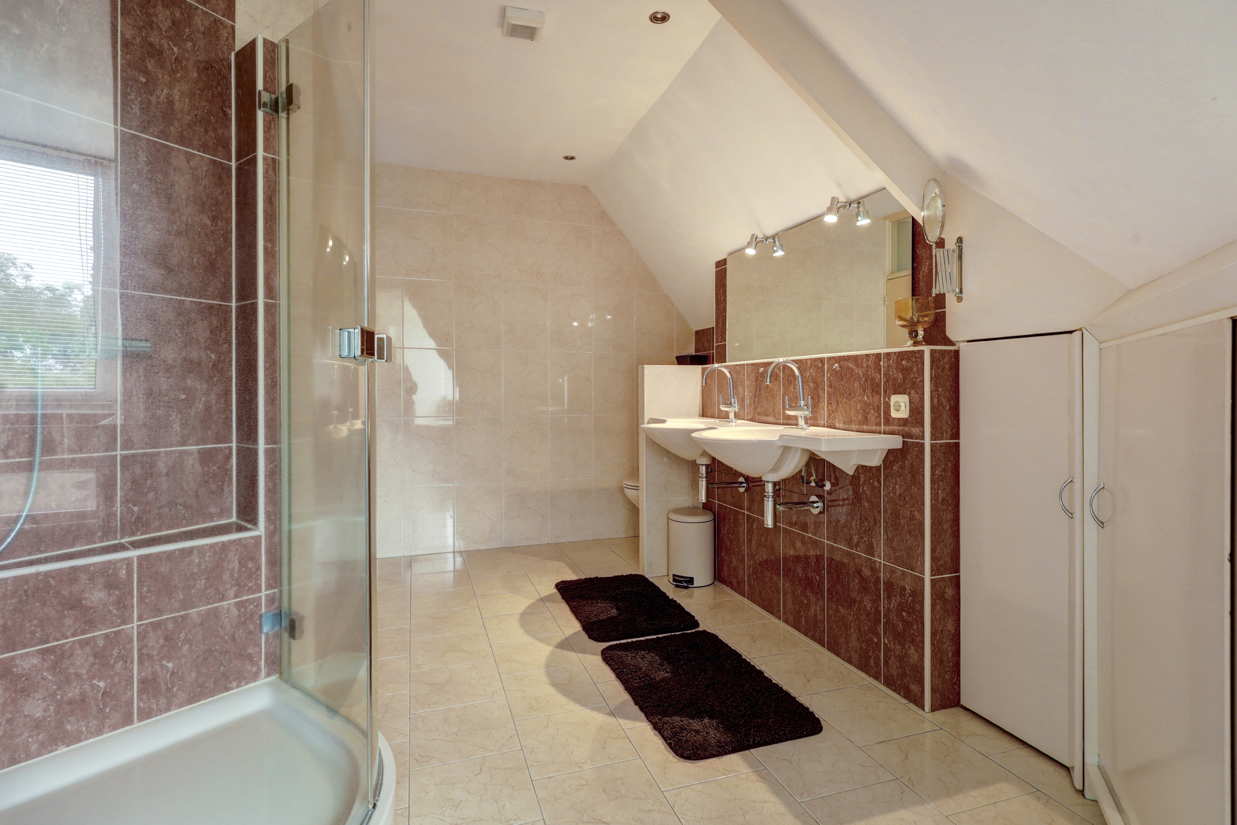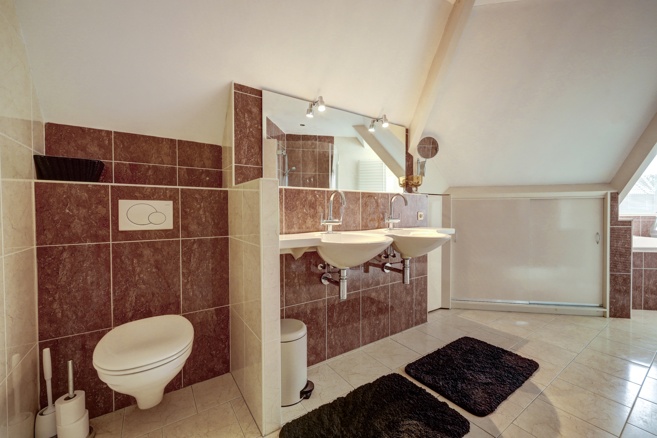 - Ligbad, toilet, douche en dubbele wastafel