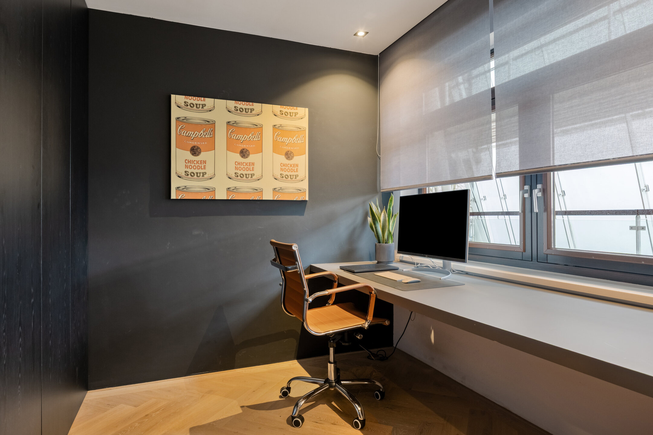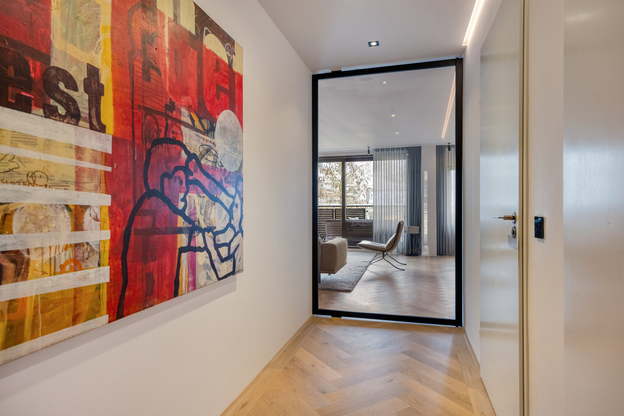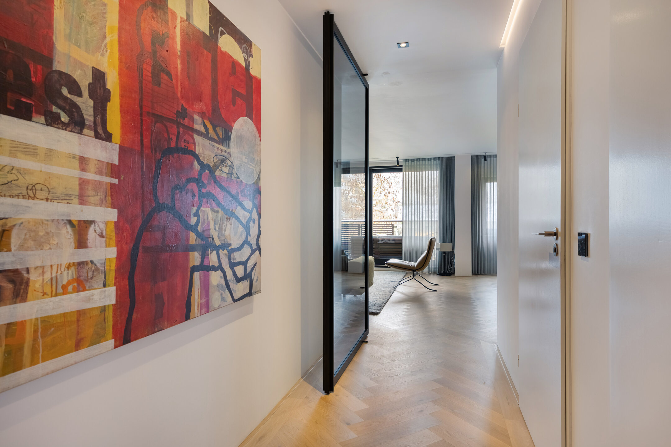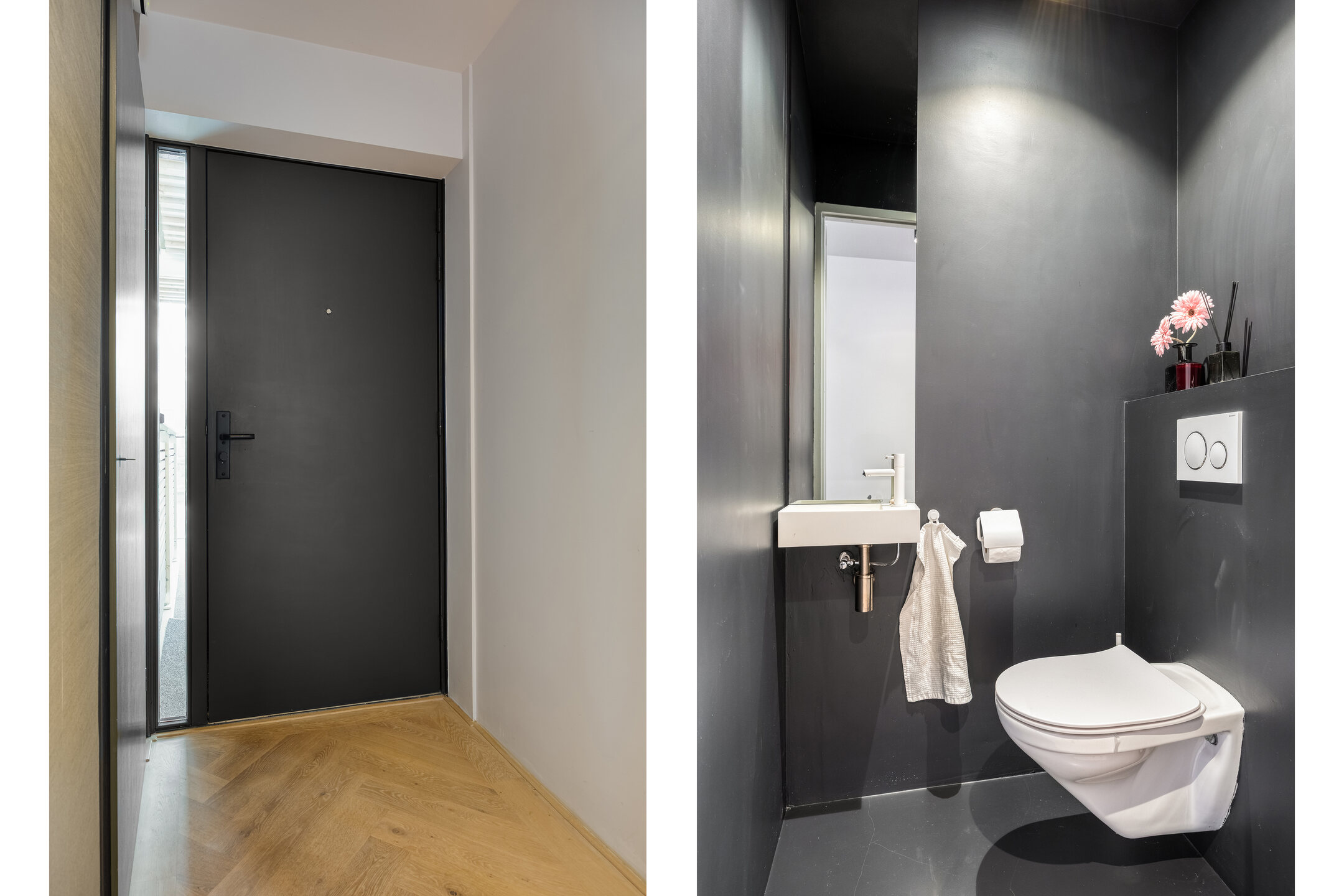 De hal is strak afgewerkt en biedt toegang tot alle vertrekken. Vanuit de hal bereikt u tevens het separate, moderne toilet met wandcloset en fonteintje. Het gehele appartement is voorzien van vloerverwarming, per ruimte regelbaar, wat zorgt voor een aangenaam comfort.