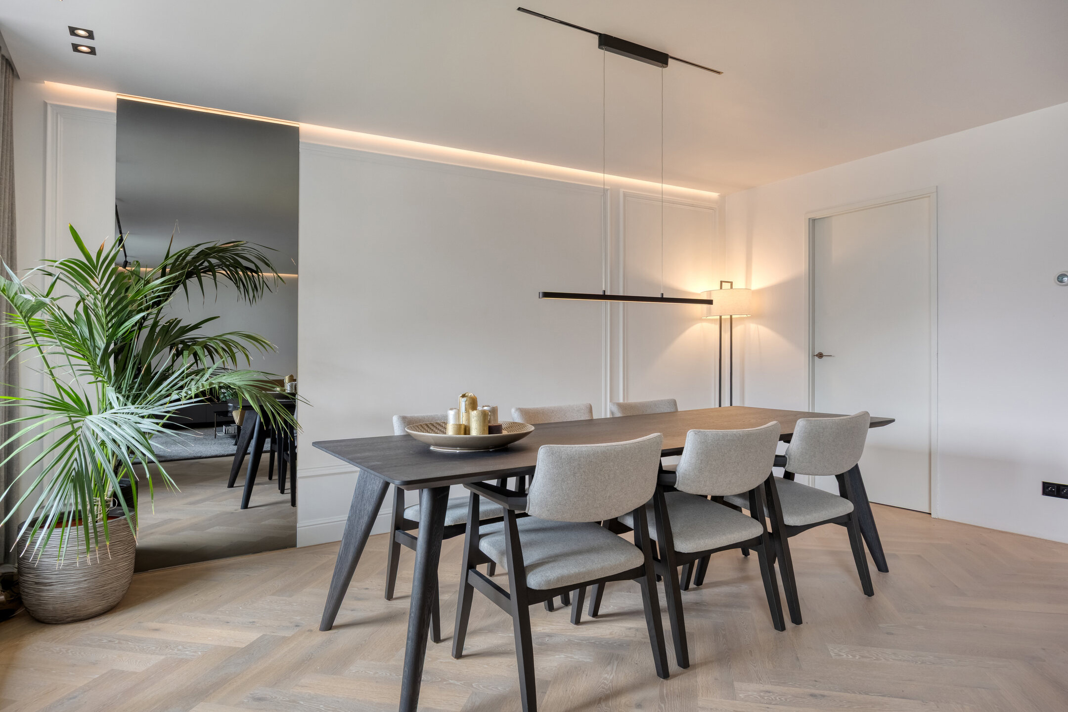 De royale woonkamer is bereikbaar via de fraaie taatsdeur en is licht en sfeervol en kenmerkt zich door een speelse, open indeling met meerdere gebruiksmogelijkheden. Grote raampartijen zorgen voor een prettige lichtinval en een mooie verbinding met buiten. De hoogwaardige vloerafwerking in visgraatmotief, de strakke wandafwerking en het zorgvuldig aangelegde lichtplan dragen bij aan de rustige, luxe uitstraling van de ruimte.