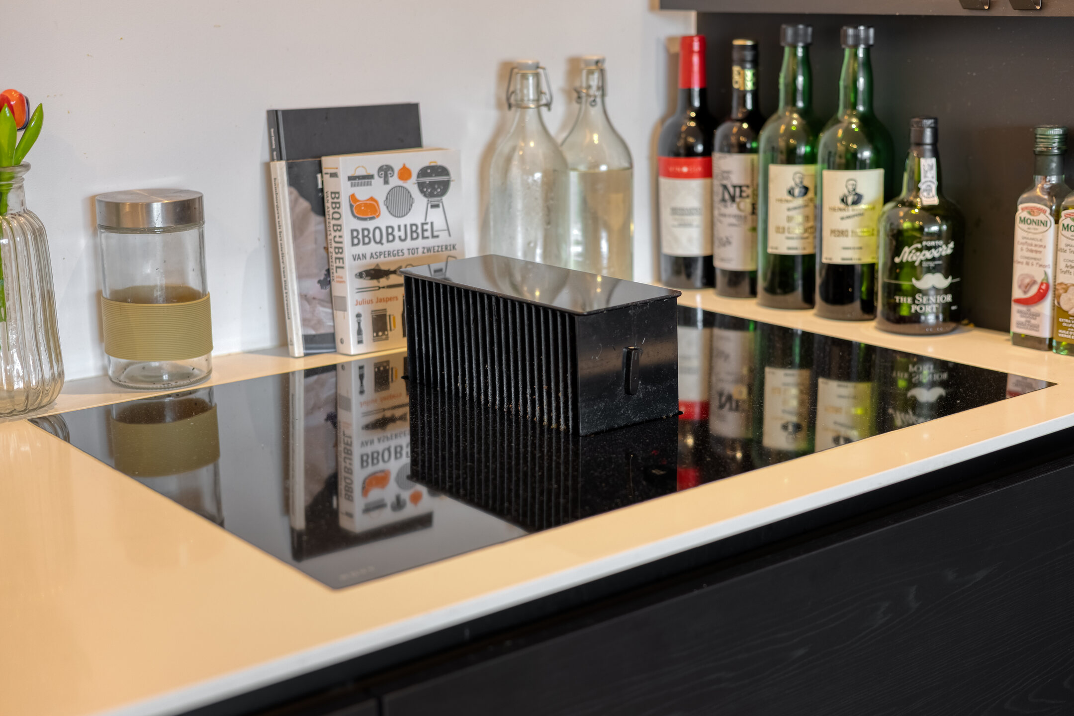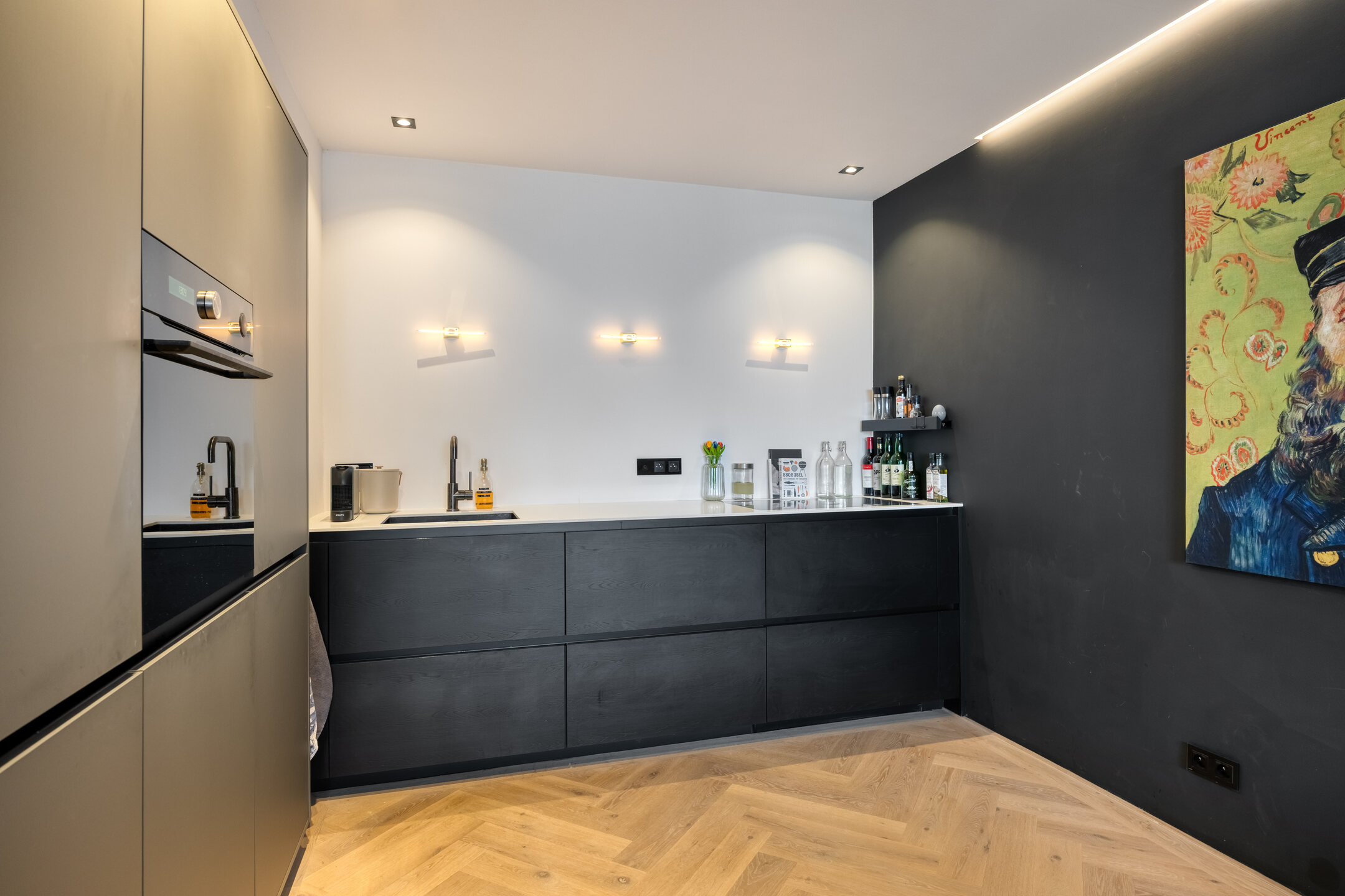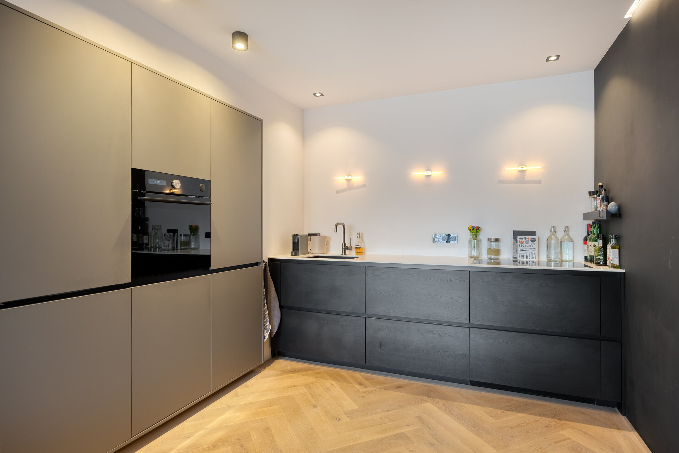 De open keuken sluit naadloos aan op de woonkamer en is uitgevoerd in een moderne, tijdloze stijl. De keuken is voorzien van diverse inbouwapparatuur, waaronder een inductiekookplaat, stoomoven, vaatwasser en koelkast. Het werkblad in combinatie met de greeploze kasten zorgt voor een strak en elegant geheel en maakt de keuken zowel praktisch als esthetisch aantrekkelijk.