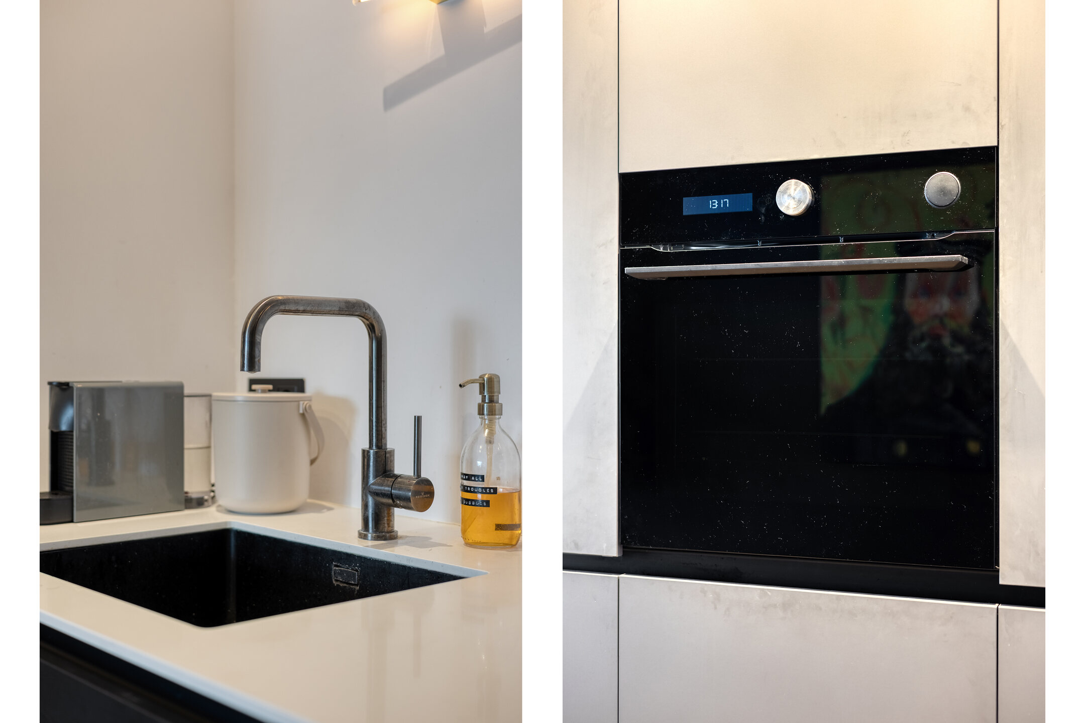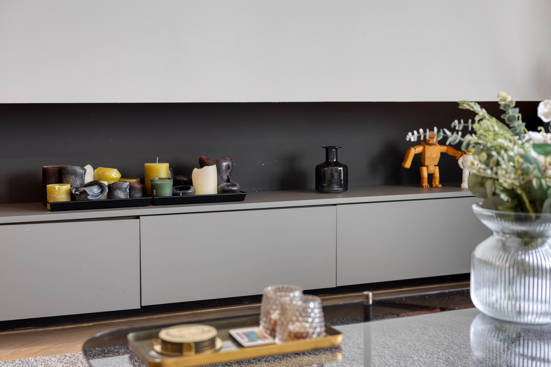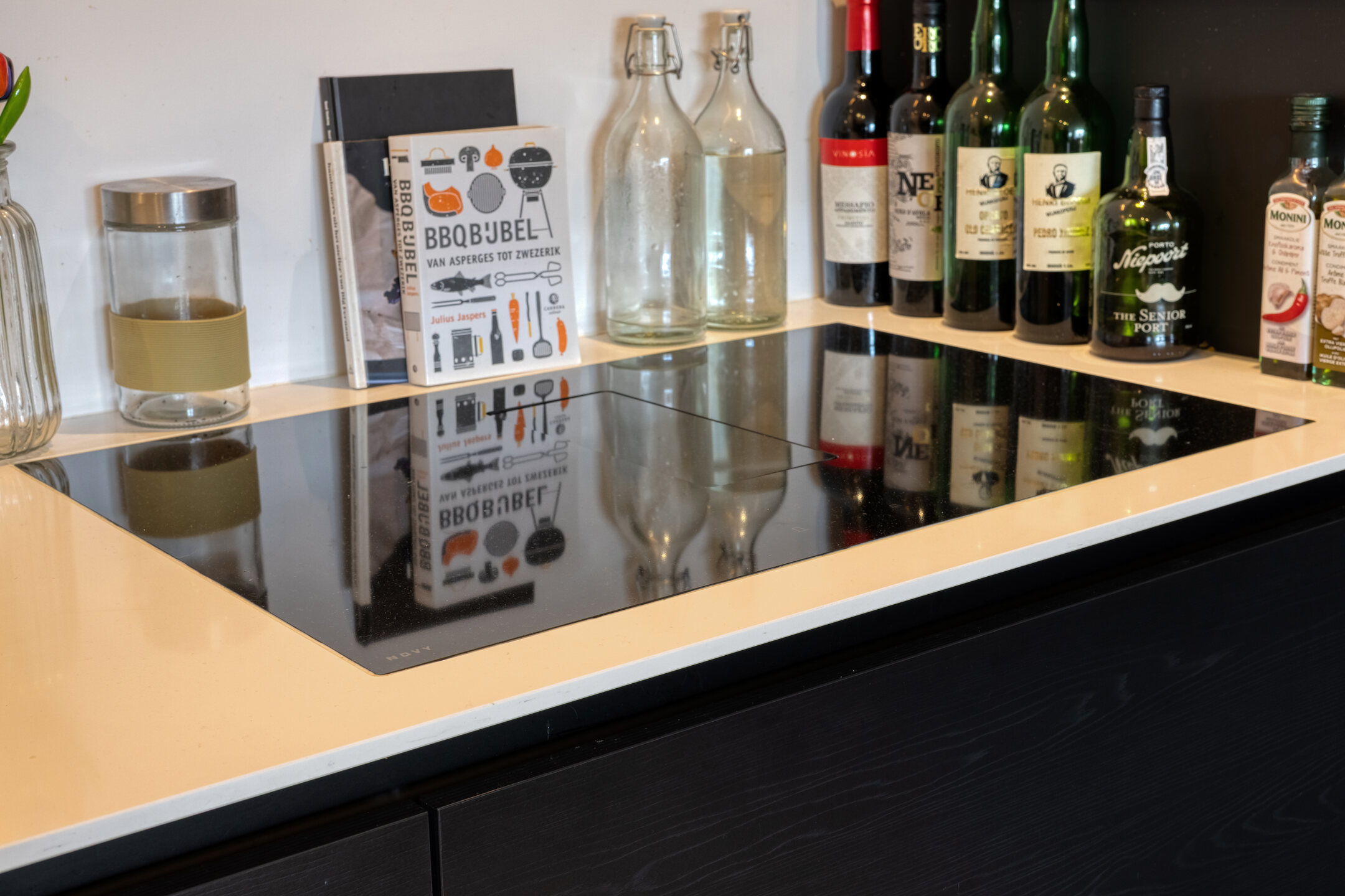 De open keuken sluit naadloos aan op de woonkamer en is uitgevoerd in een moderne, tijdloze stijl. De keuken is voorzien van diverse inbouwapparatuur, waaronder een inductiekookplaat, stoomoven, vaatwasser en koelkast. Het werkblad in combinatie met de greeploze kasten zorgt voor een strak en elegant geheel en maakt de keuken zowel praktisch als esthetisch aantrekkelijk.
