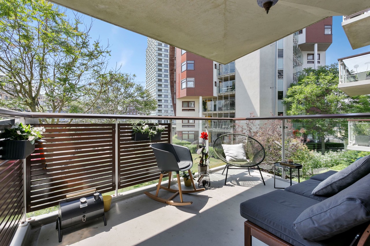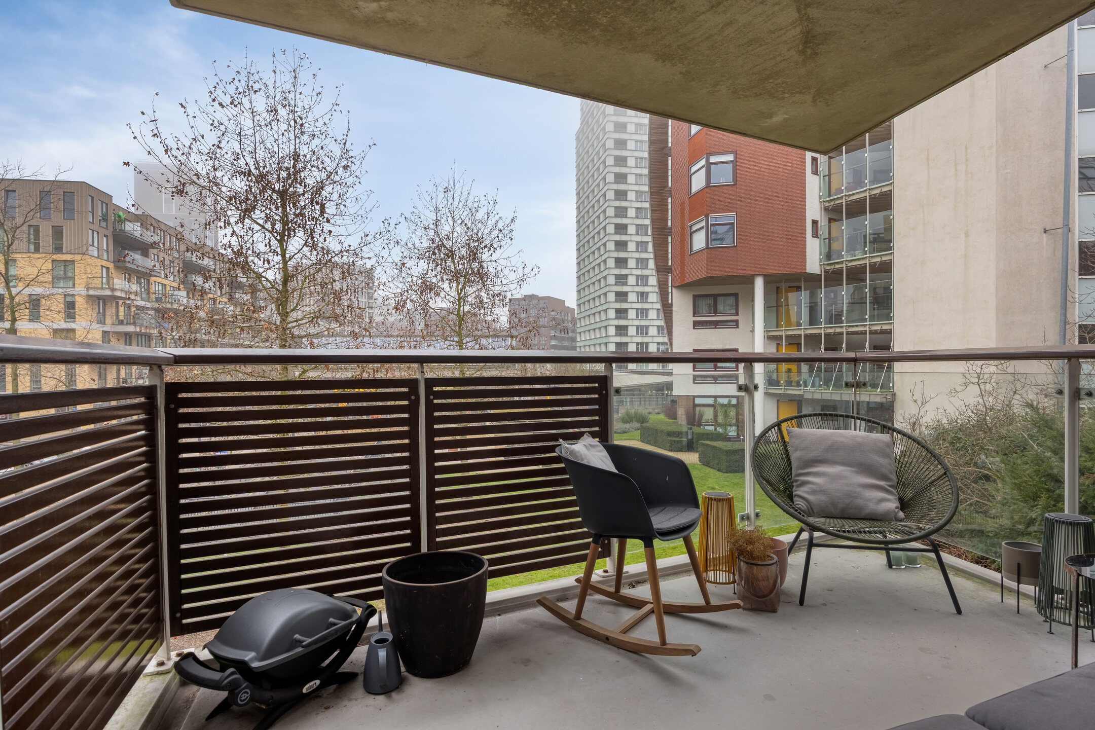 Vanuit de woonkamer is er directe toegang tot het zonnige balkon, waar u beschut kunt genieten van de groene en waterrijke omgeving.