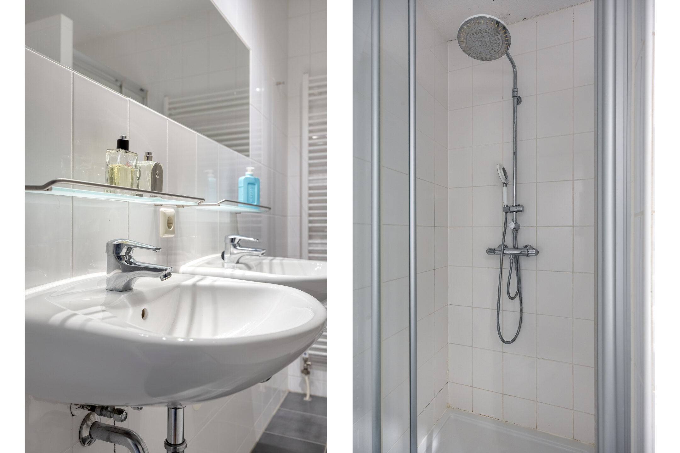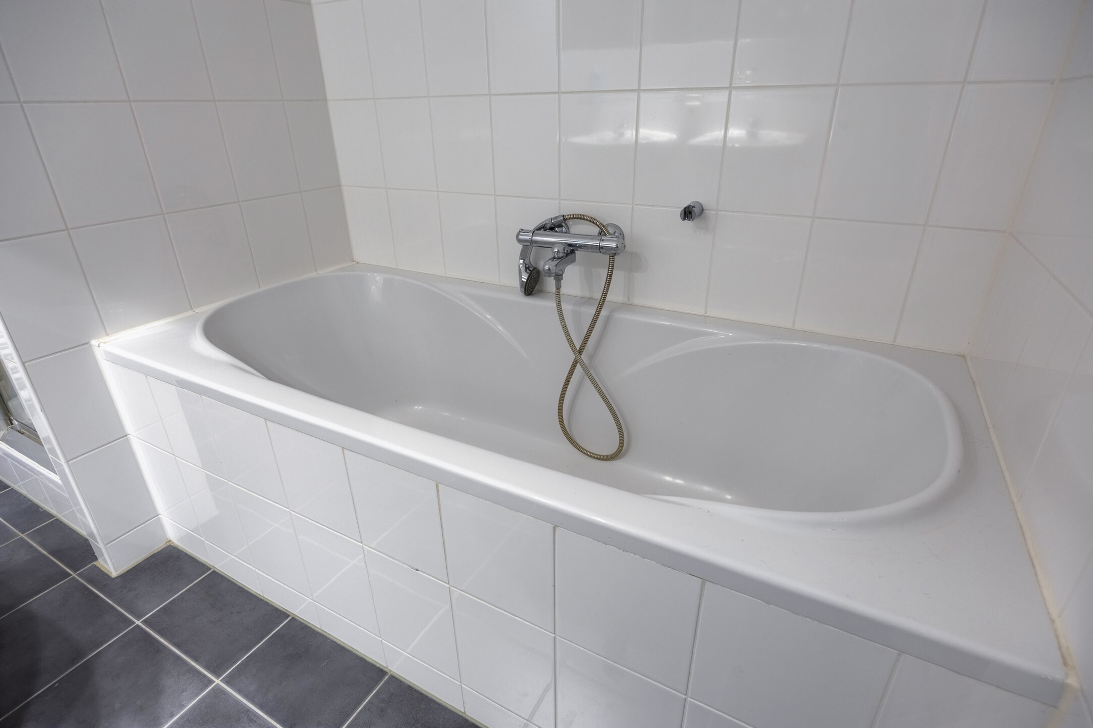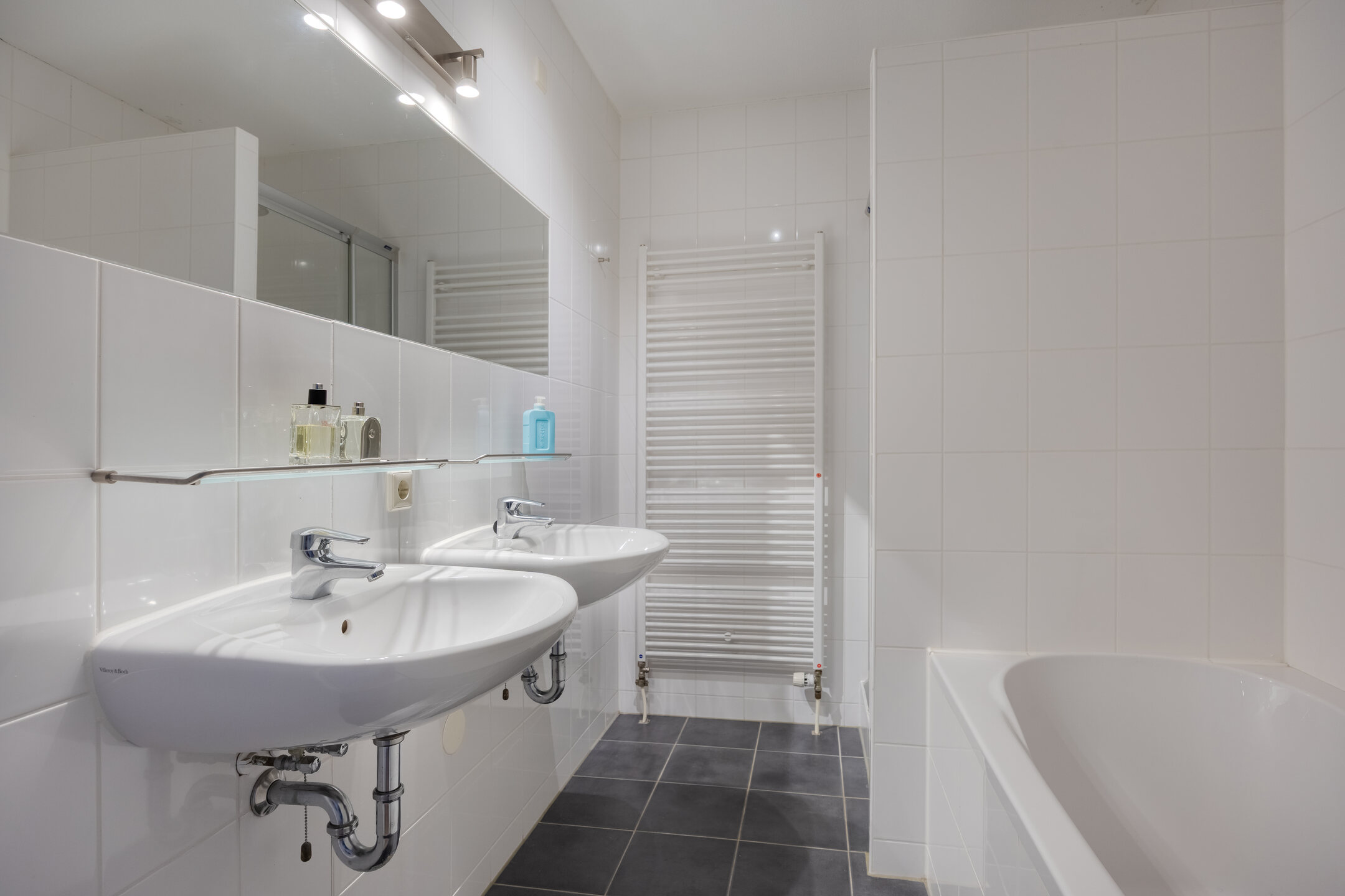De badkamer is netjes onderhouden en functioneel ingericht. De ruimte is volledig betegeld in een lichte kleurstelling en voorzien van een ligbad, separate douche, dubbele wastafel en een handdoekradiator.