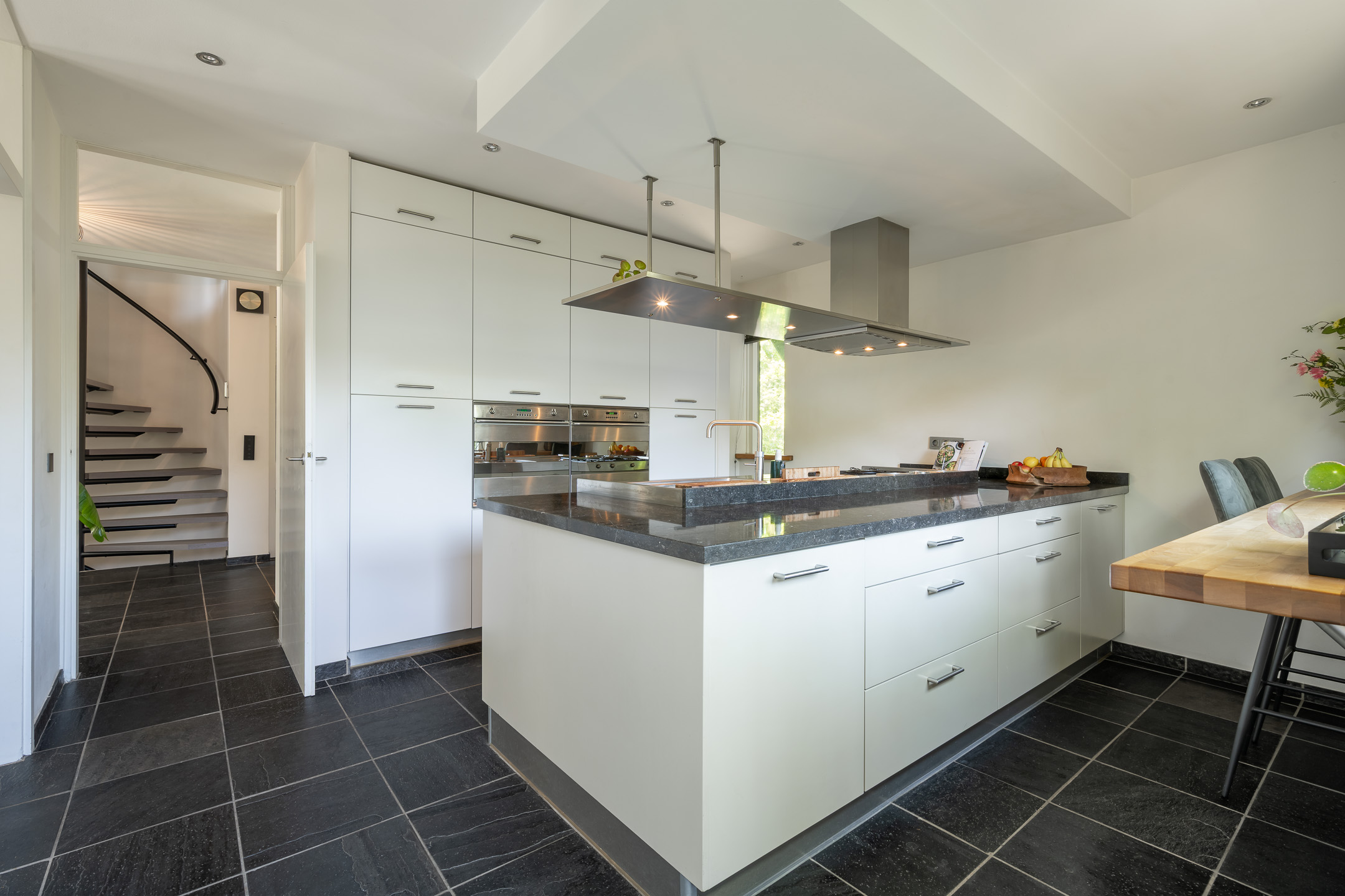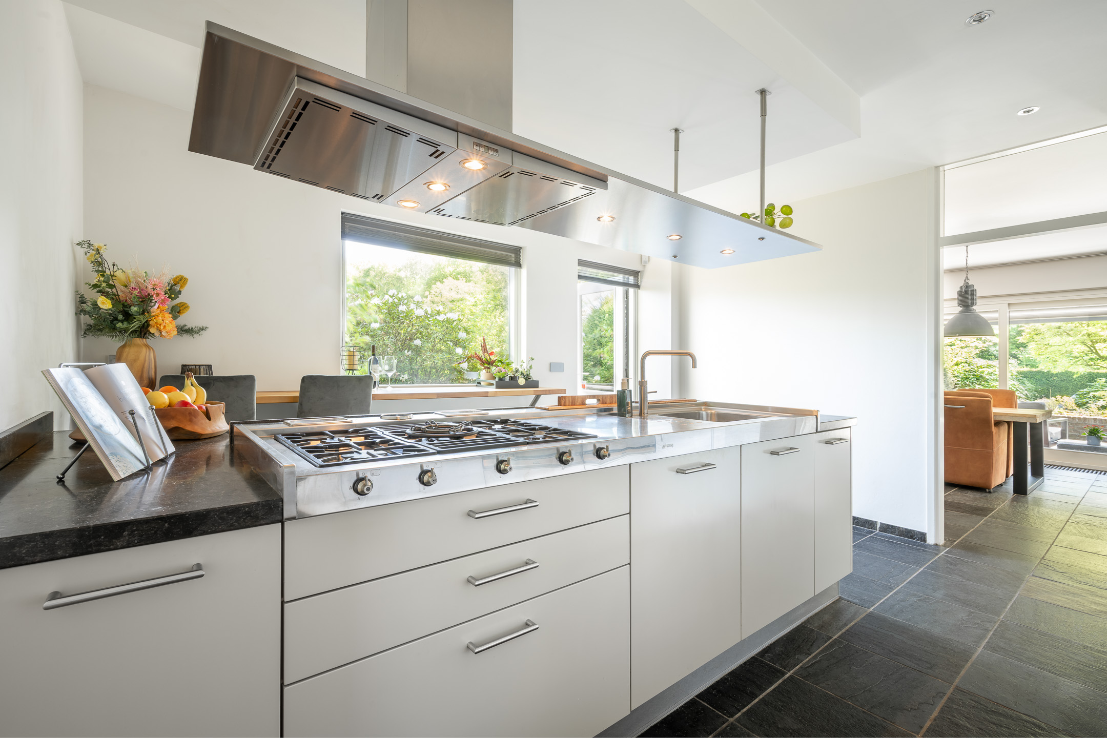 Via de ruime oprit, waar je gemakkelijk meerdere auto's kunt parkeren, bereik je het huis. Na de overdekte entree word je welkom geheten in een royale entreehal met een directe doorkijk op de fraai aangelegde tuin. Deze hal biedt toegang tot de woonkamer, de keuken, het aparte toilet met fonteintje, de meterkast en de recent vernieuwde trappen naar zowel de eerste verdieping als naar het souterrain. De woonkamer is bijzonder ruim en ingedeeld met meerdere gezellige leefgedeeltes. Wat direct opvalt zijn de grote raampartijen op het zuiden die zorgen voor een overvloed aan natuurlijk licht en een prachtig uitzicht bieden op de achtertuin. Het eetgedeelte biedt genoeg ruimte voor een grote eettafel waar het hele gezin of een flink gezelschap comfortabel kan aanschuiven. In het zitgedeelte zorgt een sfeervolle houthaard voor extra warmte en gezelligheid op de koudere dagen. Zowel het eetgedeelte als het zitgedeelte zijn voorzien van schuifpuien die toegang geven tot het aansluitende terras en de tuin. Hierdoor haal je op zonnige dagen moeiteloos buiten naar binnen, perfect voor etentjes of feestjes. De huidige bewoners gebruiken het tussengedeelte als extra zitruimte vanwege het zicht op de tuin. De leefkeuken is voorzien van alles wat je nodig hebt zoals een kookeiland en hoogwaardige inbouwapparatuur. Denk aan een dubbele oven, 5-pits gaskookplaat met design afzuiging, vaatwasser, koelkast, vriezer en een Quooker-kraan. Of je nu uitgebreid wilt koken of een snelle kop thee wilt zetten, hier kan het allemaal.