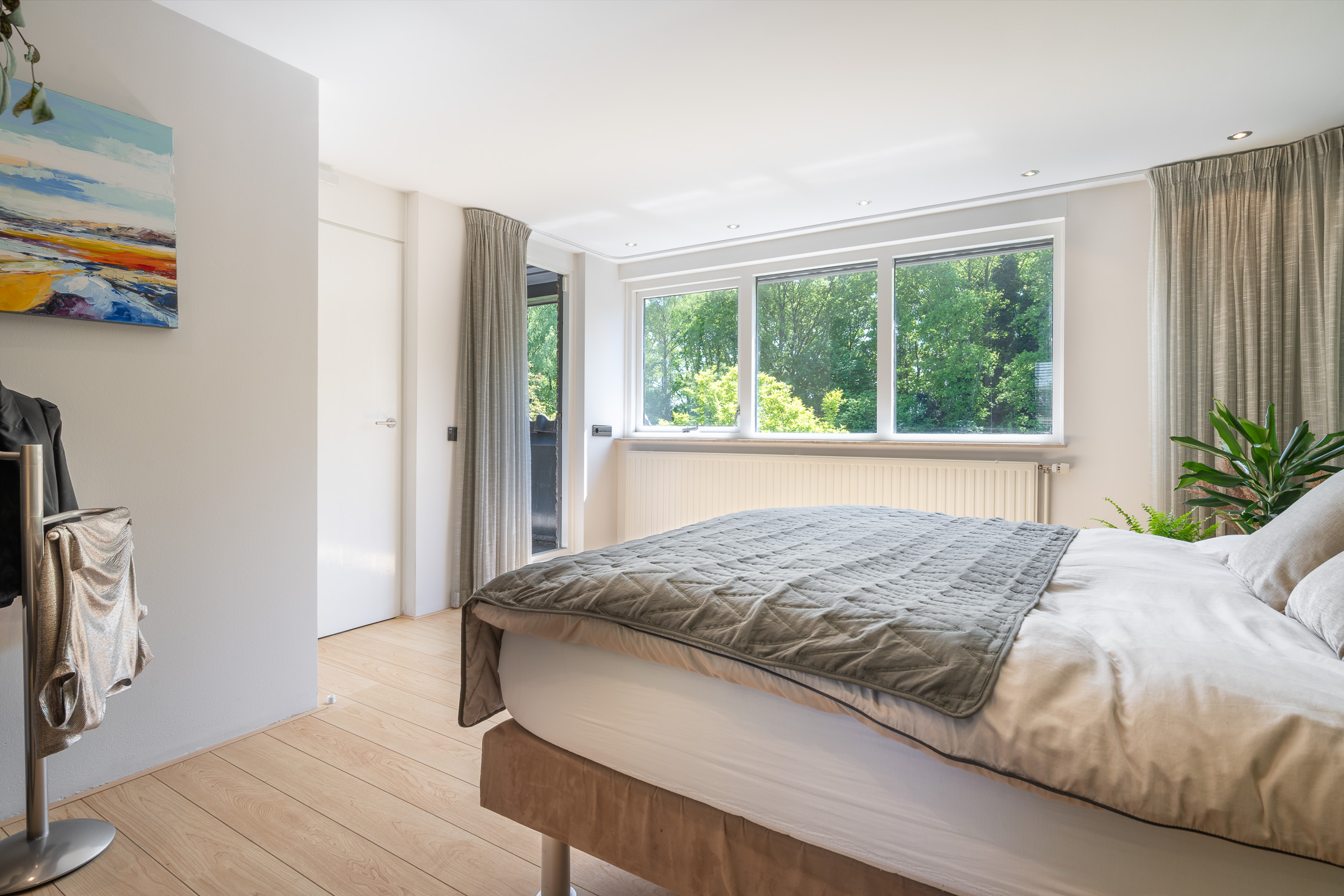 De eerste verdieping bereik je via de trap die uitkomt op een ruime overloop. Vanaf hier heb je direct toegang tot drie slaapkamers, de tweede badkamer, het aparte toilet en het zonnige balkon. De hoofdslaapkamer is royaal van formaat met prachtig uitzicht op de groene tuin. Dankzij de ingebouwde kasten is er volop opbergruimte, terwijl de en-suite badkamer aanvoelt als een luxe hotelbadkamer. Deze privébadkamer is voorzien van vloerverwarming, een ligbad, inloopdouche, dubbele wastafel met stijlvolmeubel en handdoekradiator. De andere twee slaapkamers op deze verdieping zijn eveneens ruim opgezet. Beiden bieden moeiteloos plaats aan een tweepersoonsbed, kledingkast en eventueel een bureau of speelhoek. Perfect als kinderkamer, logeerkamer of thuiswerkplek. Voor algemeen gebruik is er een tweede badkamer, voorzien van inloopdouche, wastafel met wastafelmeubel en handdoekradiator. Het aparte toilet met fonteintje ligt er direct naast, wat zorgt voor extra gemak. Het balkon is gelegen op het zuiden met uitzicht over de tuin. Hier kun je in alle rust je eerste kop koffie drinken, genieten van de avondzon of simpelweg even ontsnappen aan de drukte van de dag.