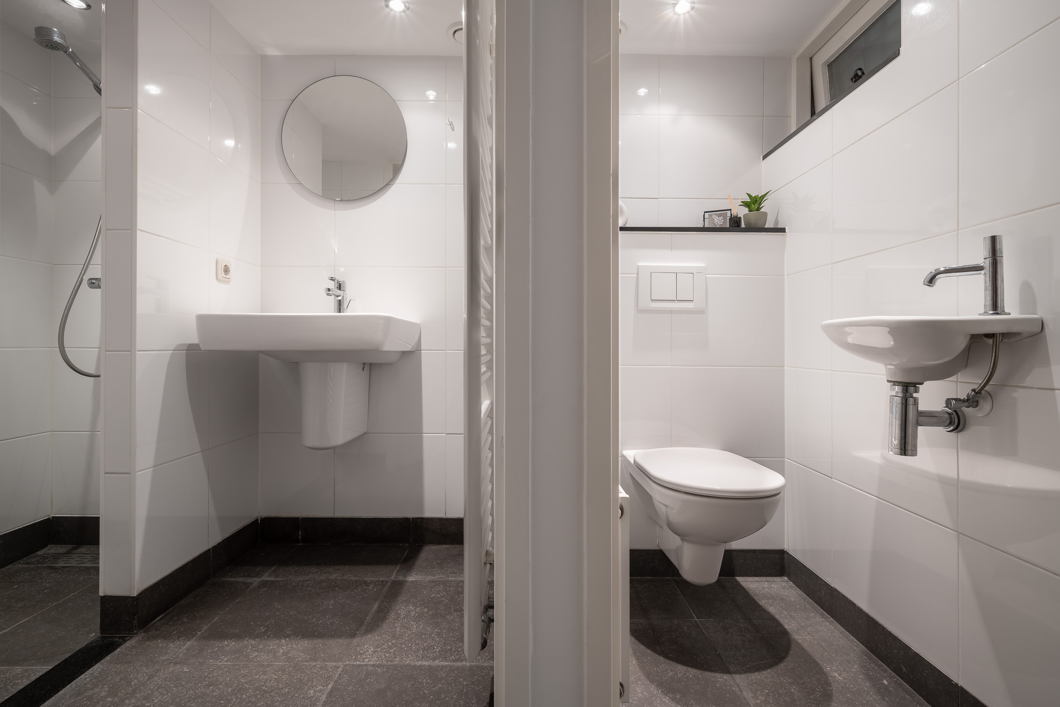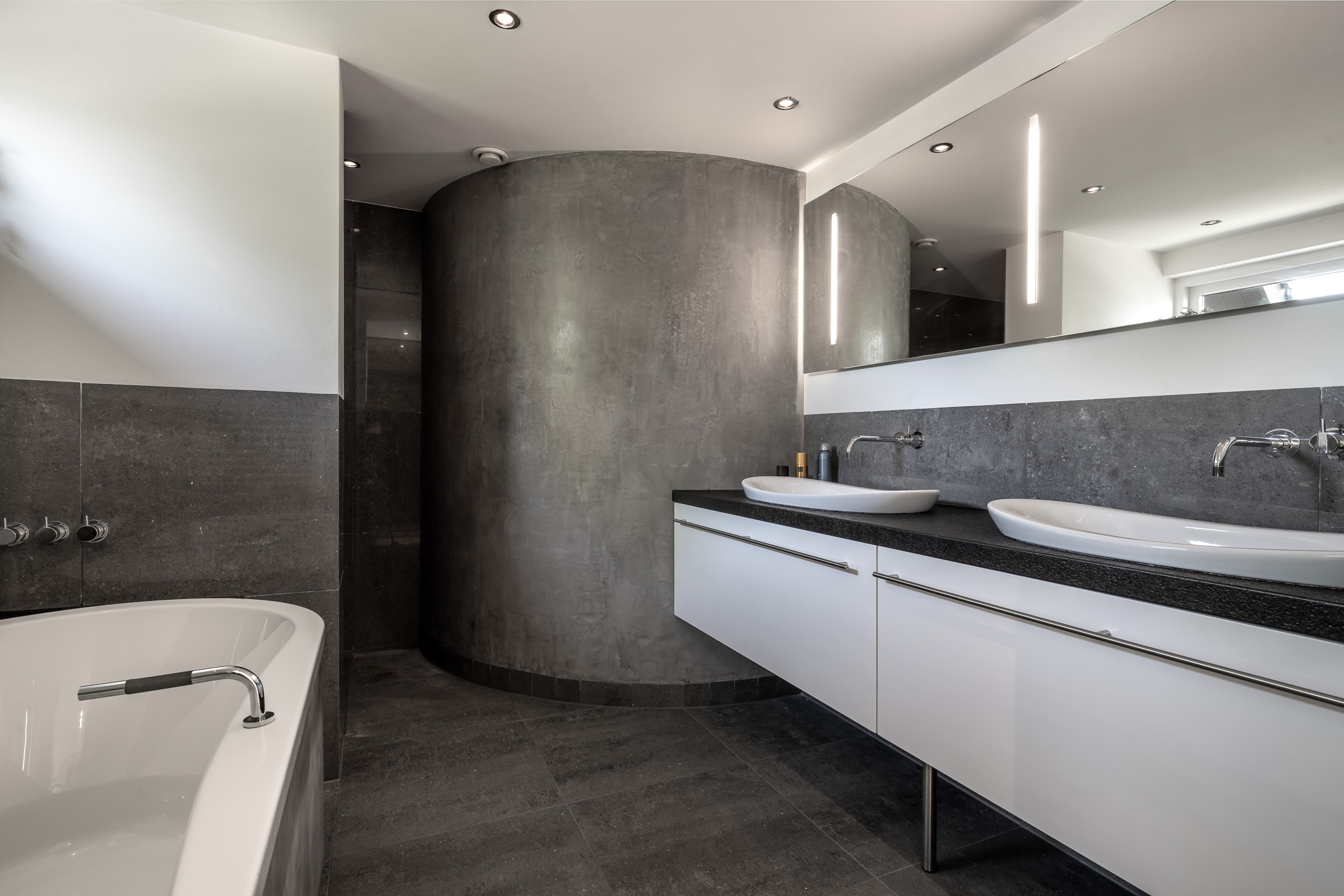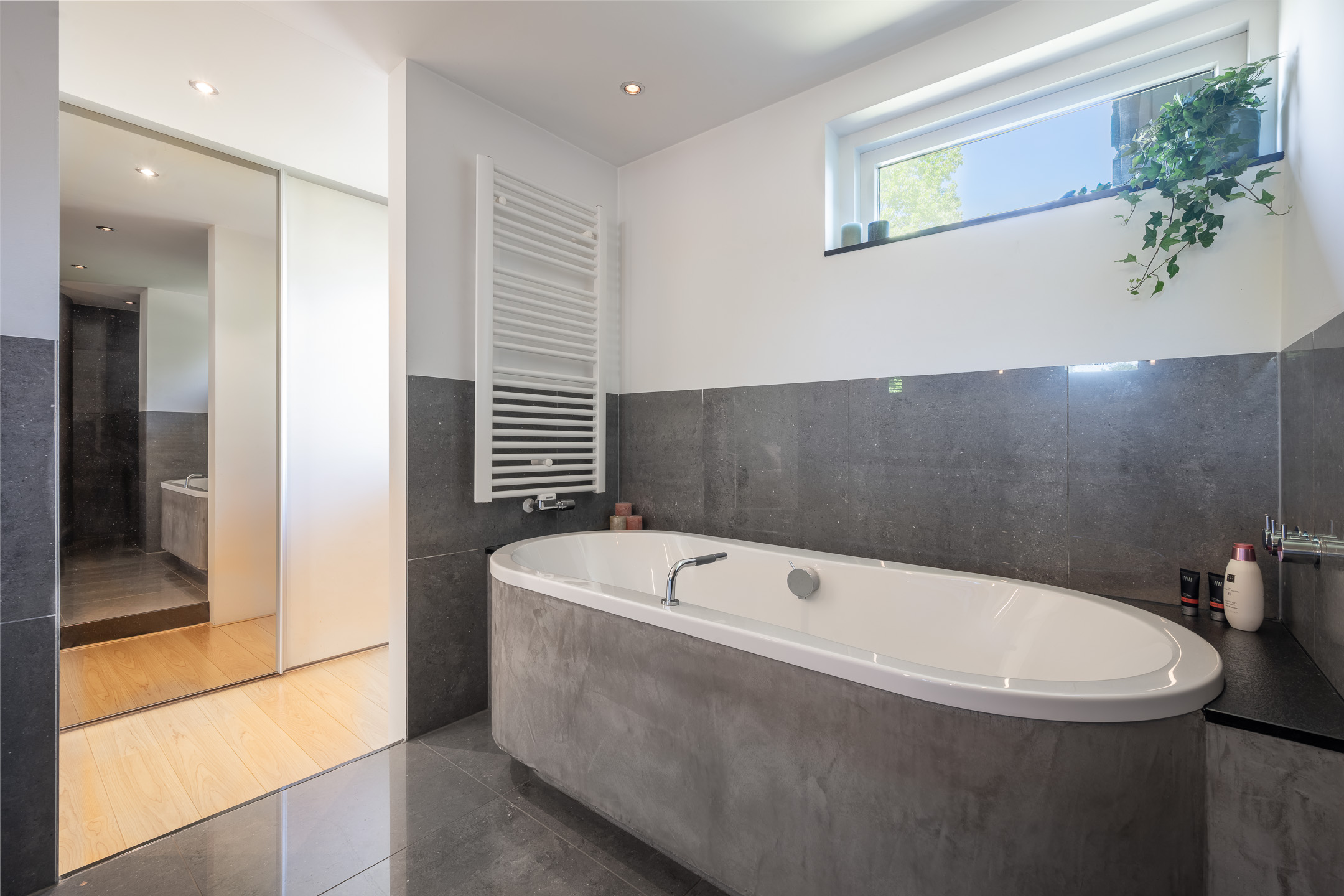 - Ligbad, dubbele wastafel, wastafelmeubel, inloopdouche, vloerverwarming en wastafel
