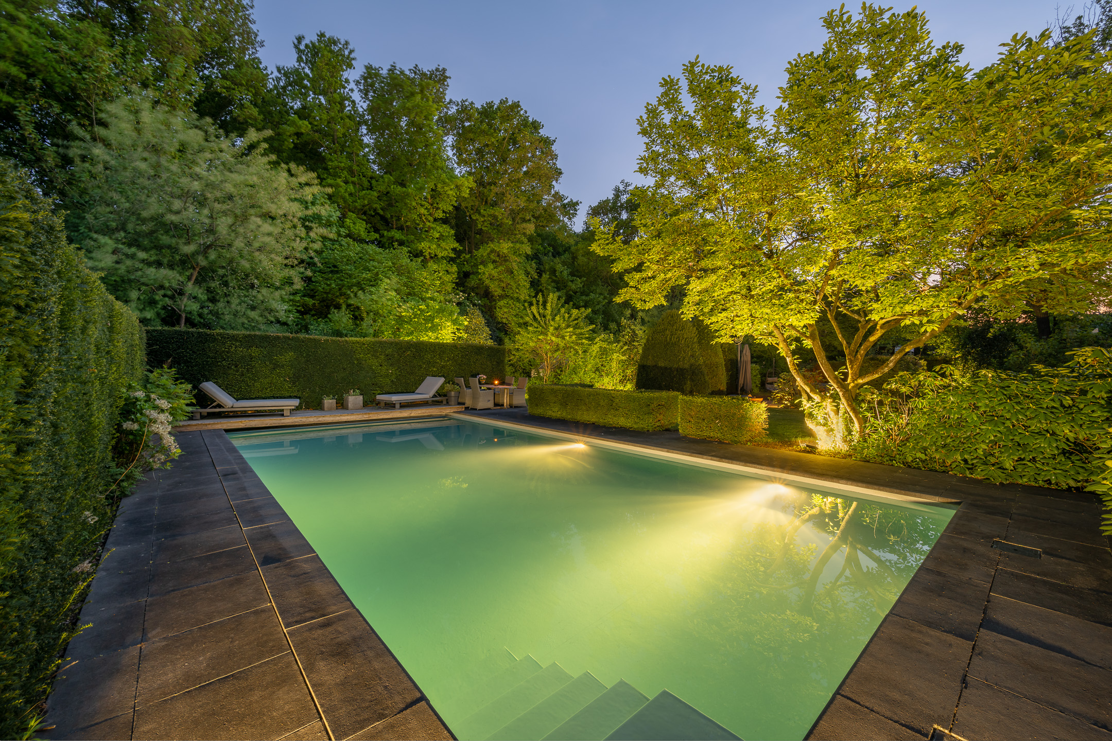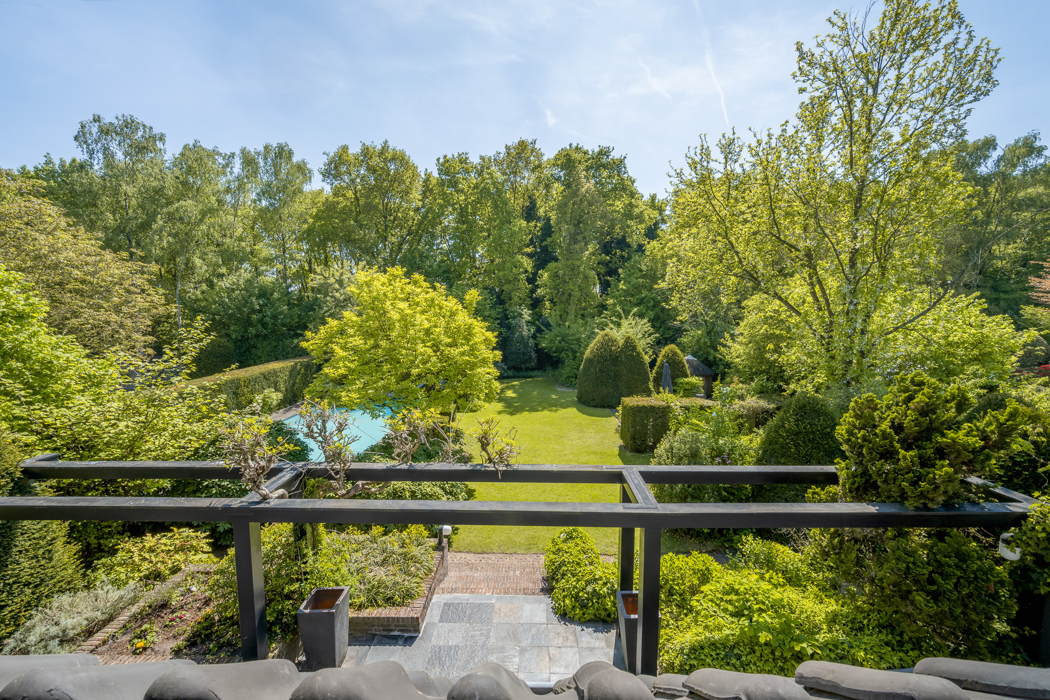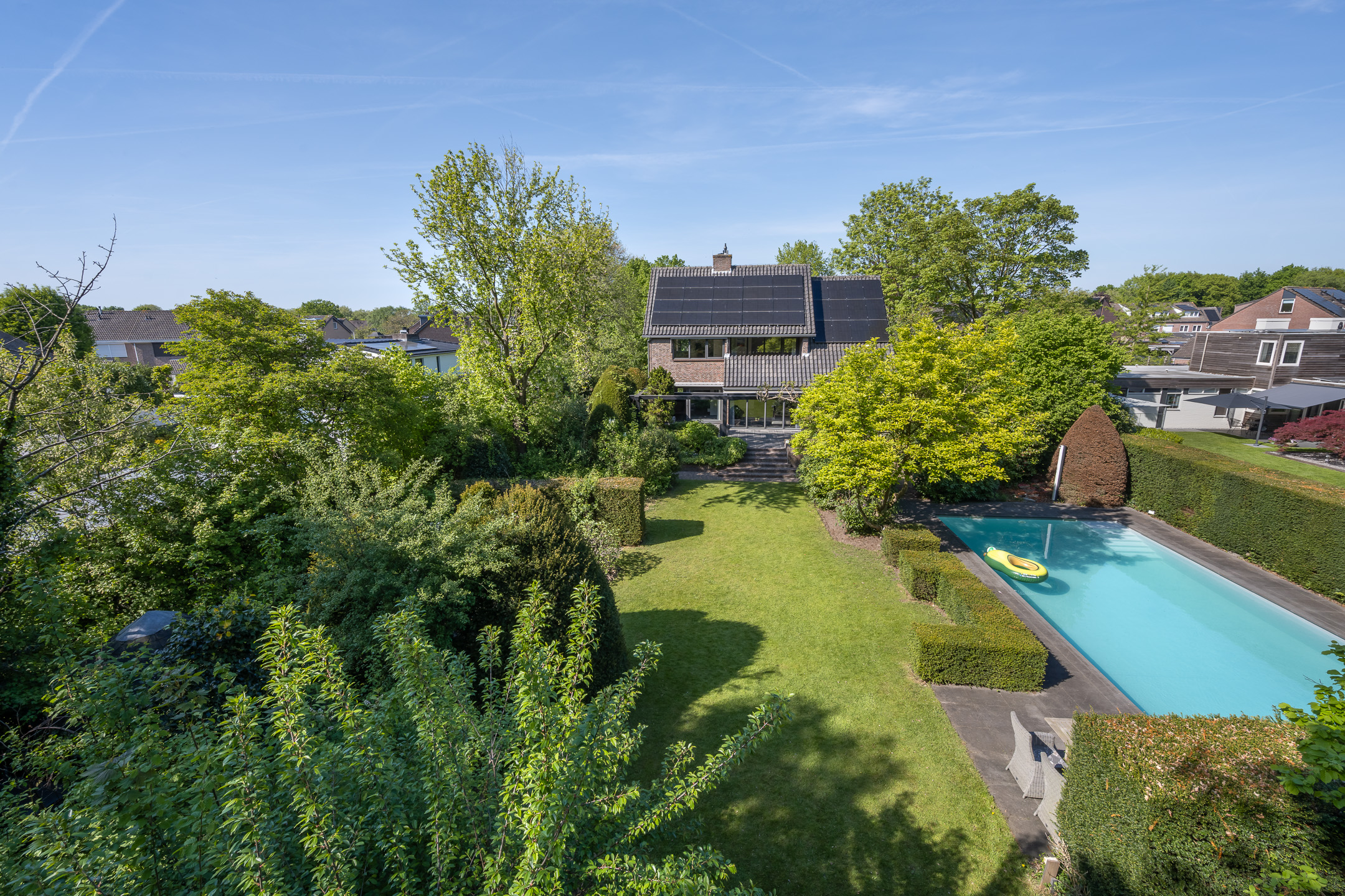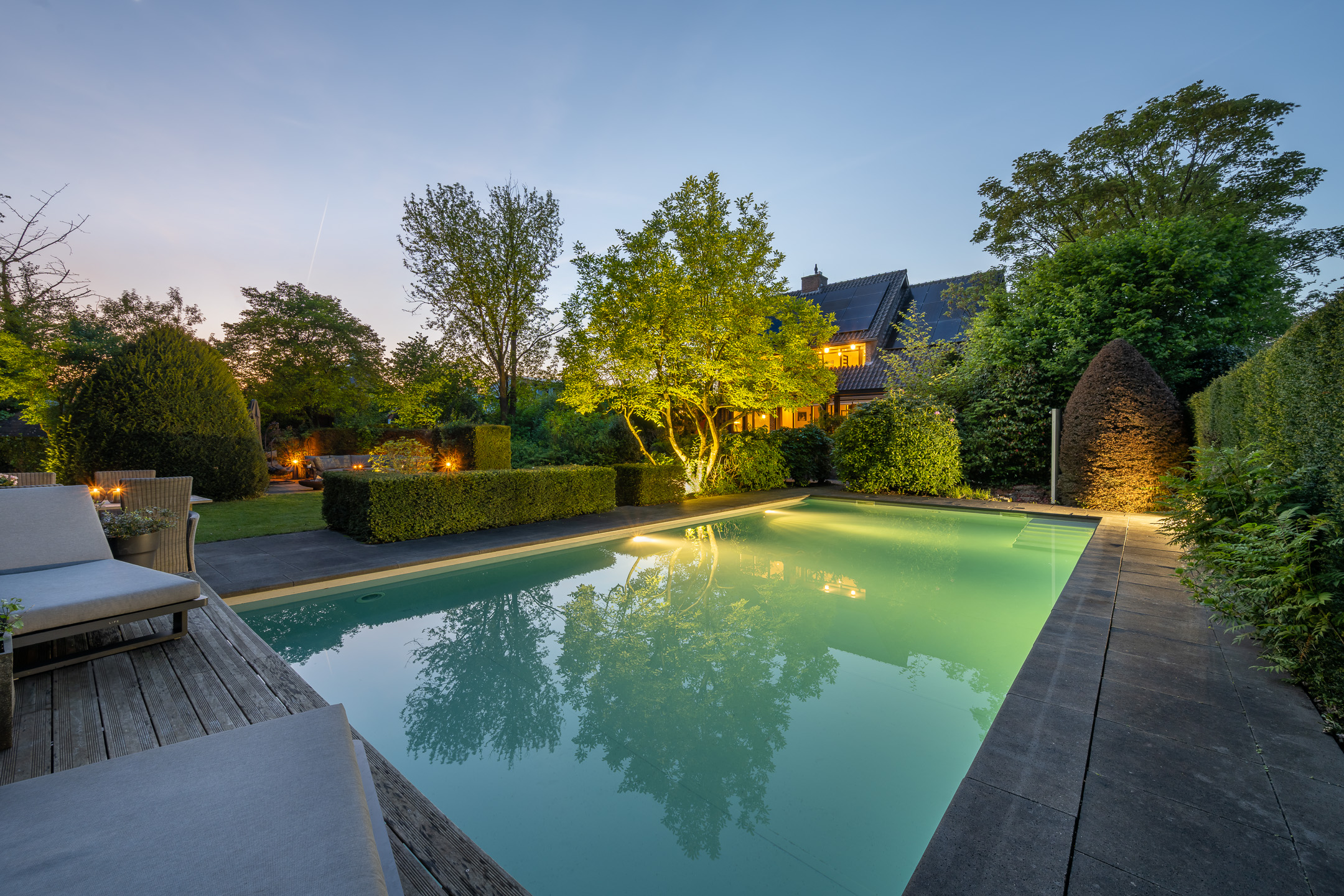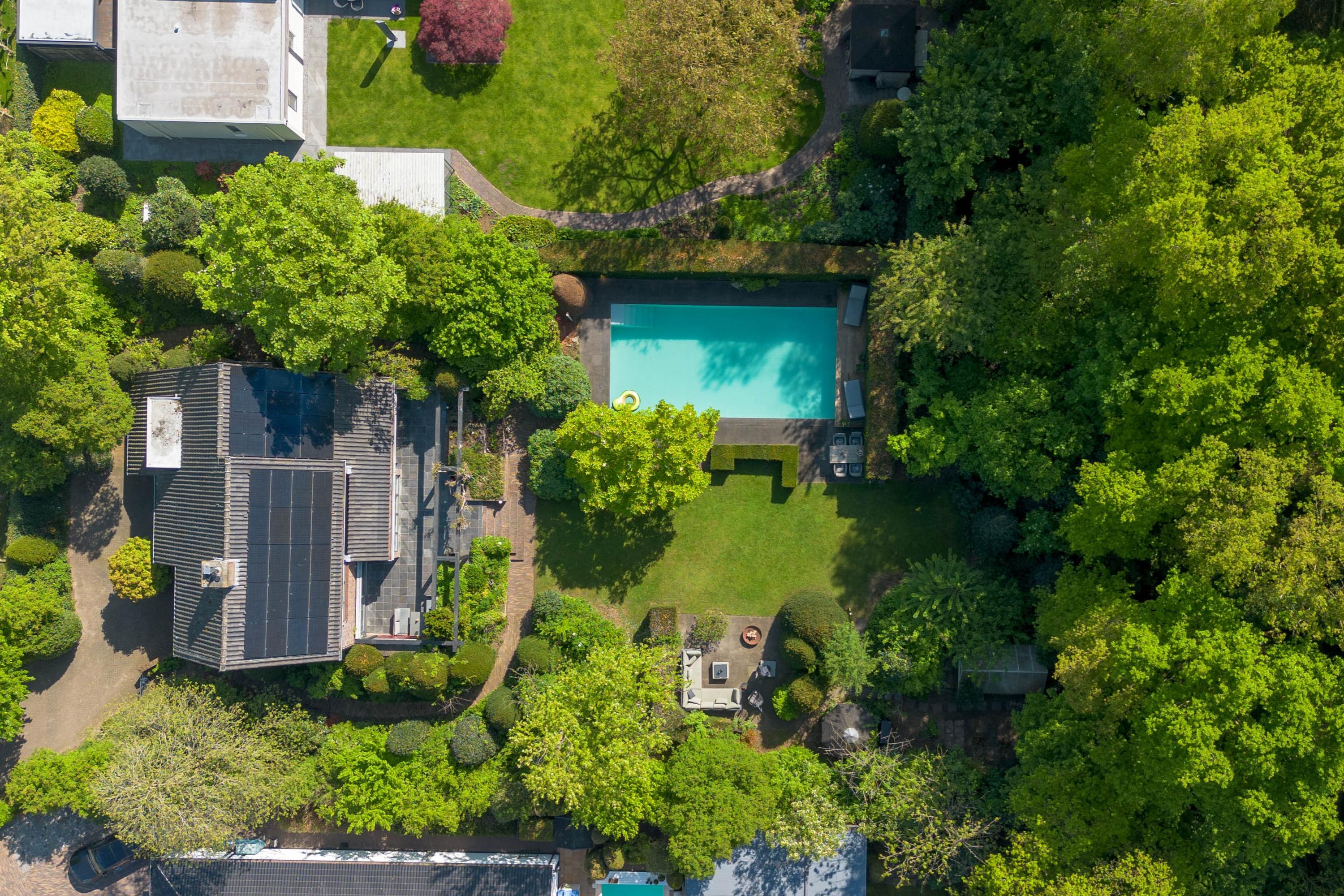De tuin rondom deze villa is niet zomaar een tuin. Het is je eigen groene paradijs waar luxe, gemak en privacy samenkomen. Doordat de tuin volledig om het huis heen ligt is hij vanuit meerdere kanten te betreden. Daarbij is de volledige omheining ideaal voor wie houdt van rust en veiligheid. De tuin is voorzien van een sproei-installatie op alle hoeken en kanten. Geen gesjouw met tuinslangen, alles wordt moeiteloos voor je geregeld. De nieuw gelegde tuinverlichting brengt sfeer zodra de zon ondergaat, zodat je heel het jaar door ook 's avonds volop kunt genieten van de tuin. Dankzij de ligging op het zuiden baadt de tuin in zonlicht, van de vroege ochtend tot de late avond. Met meerdere zitgedeeltes in de tuin vind je elk moment van de dag een fijn plekje om te relaxen. Aan de achterzijde van de woning bevindt zich ook een royaal terras, overdekt door luifels die de hele breedte van de woning beslaat. En dan het absolute pronkstuk: het zwembad. Gerenoveerd in 2021 en voorzien van low salt elektrolyse, solarlamellen en warmtepomp staat het garant voor urenlang zwemplezier. Daarnaast is het zwembad volledig geautomatiseerd en via wifi te bedienen, dus ook als je niet thuis bent heb je alles onder controle. Tot slot vind je in de tuin nog een kas voor je eigen moestuin en een apart huisje waarin alle zwembadinstallaties netjes en overzichtelijk zijn ondergebracht.