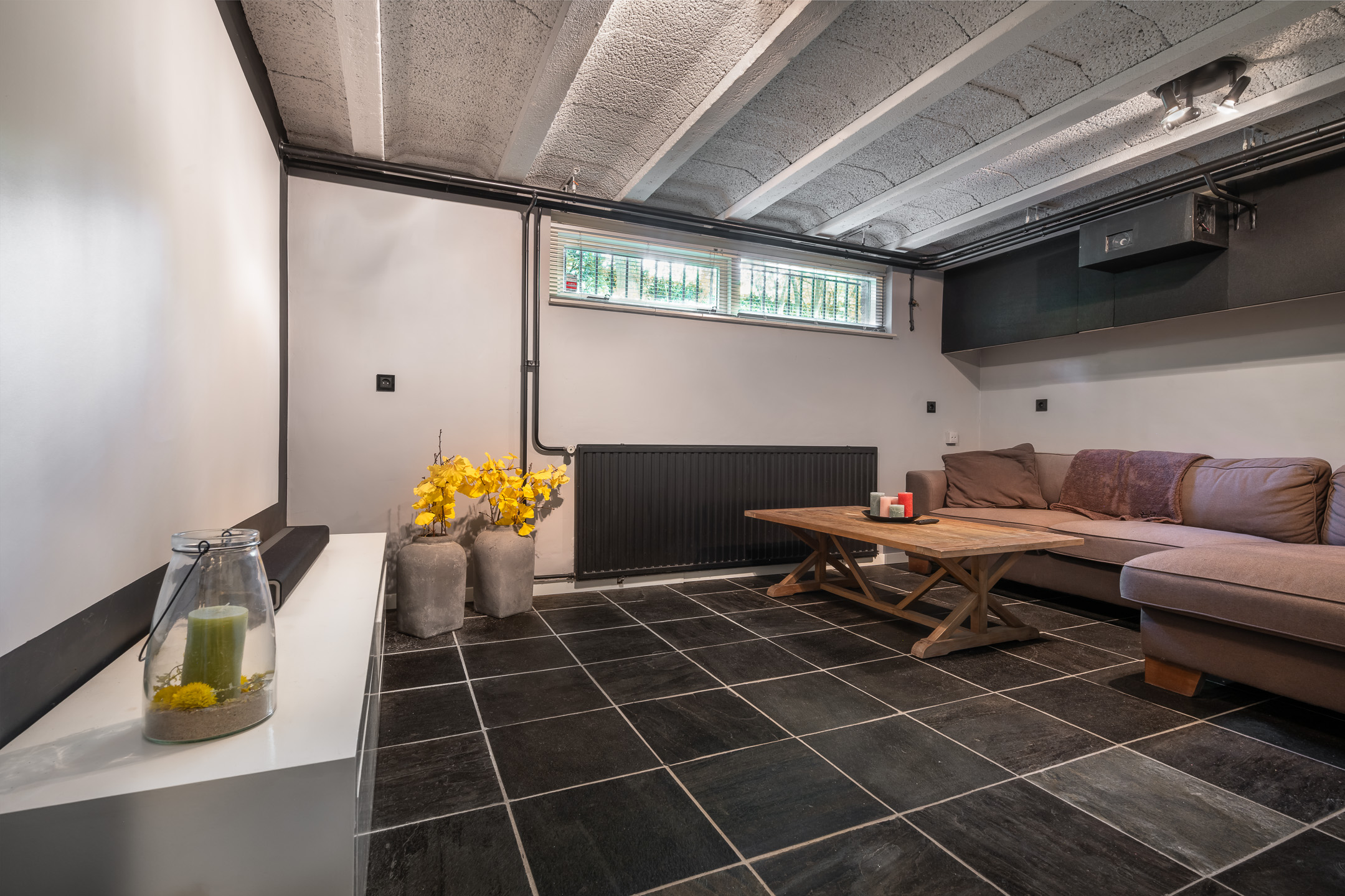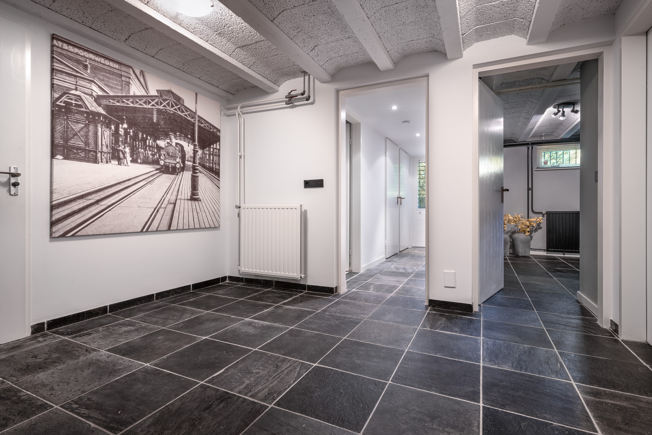 Middels de vaste trap daal je af naar het souterrain dat zich bevindt onder de gehele woning. Een volwaardig woonniveau waar comfort, ontspanning en functionaliteit samenkomen. Je komt binnen in een ruime hal die toegang geeft tot de inpandige garage en een indrukwekkend aantal ruimtes, allemaal met zorg afgewerkt wat zorgt voor een frisse en strakke uitstraling. Aan ontspanning geen gebrek, zo is er in dit souterrain een volwaardige thuisbioscoop die uitnodigt tot lange filmavonden met familie en vrienden. Deze kamer is ook te gebruiken als extra slaapkamer. Voor extra ontspaning is er ook een ruimte met een infrarood sauna. Voor het praktische dagelijkse leven is het souterrain minstens zo goed uitgerust. De ruime wasruimte biedt genoeg plek voor wasmachine en wasdroger en hier staat ook de waterontharder, een fijne toevoeging voor zowel je apparaten als je huid. In het souterrain bevindt zich ook een ruime en volledig geïsoleerde provisieruimte. De cv-ruimte bevindt zich naast de provisieruimte en zorgt voor een betrouwbare verwarming van het hele huis. De badkamer in het souterrain is voorzien van inloopdouche, wastafel en handdoekradiator en ook is een apart toilet met fonteintje aanwezig, handig voor zwembaddagen want vanuit het souterrain bereik je via een kleine trap direct de tuin en het zwembad.