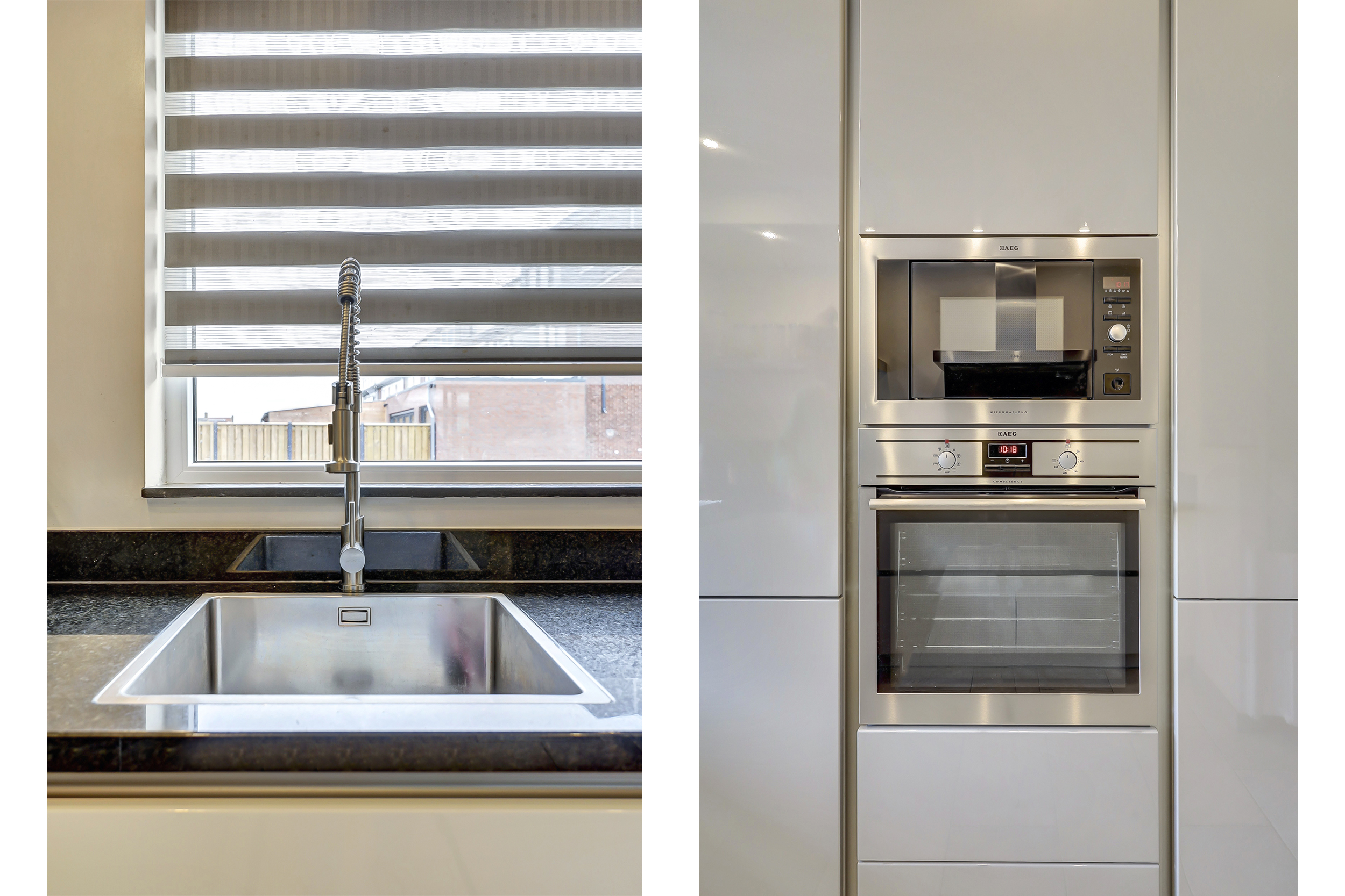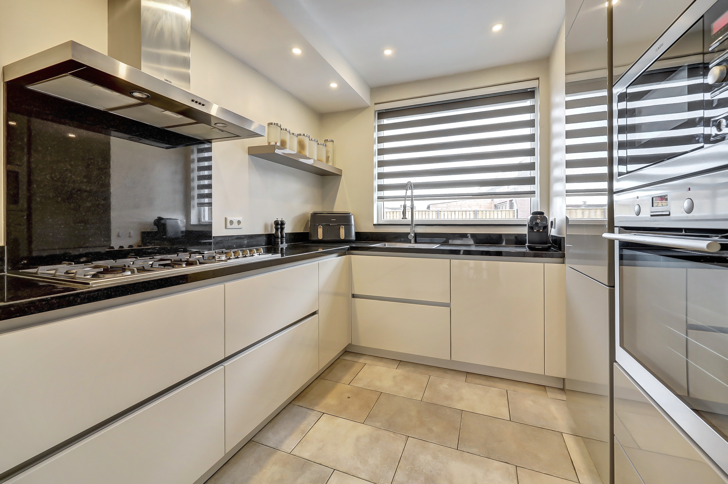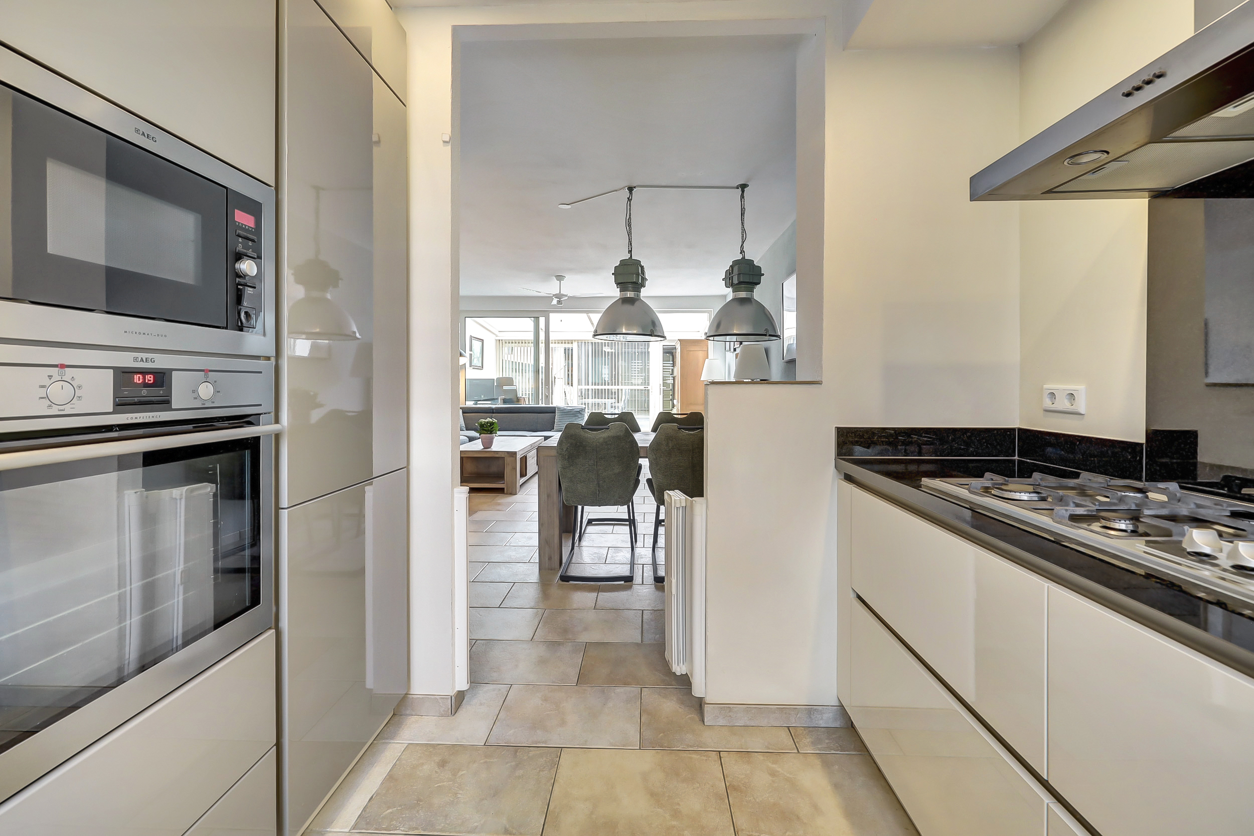 - Strakke keuken met groot gasfornuis en complete inbouwapparatuur;