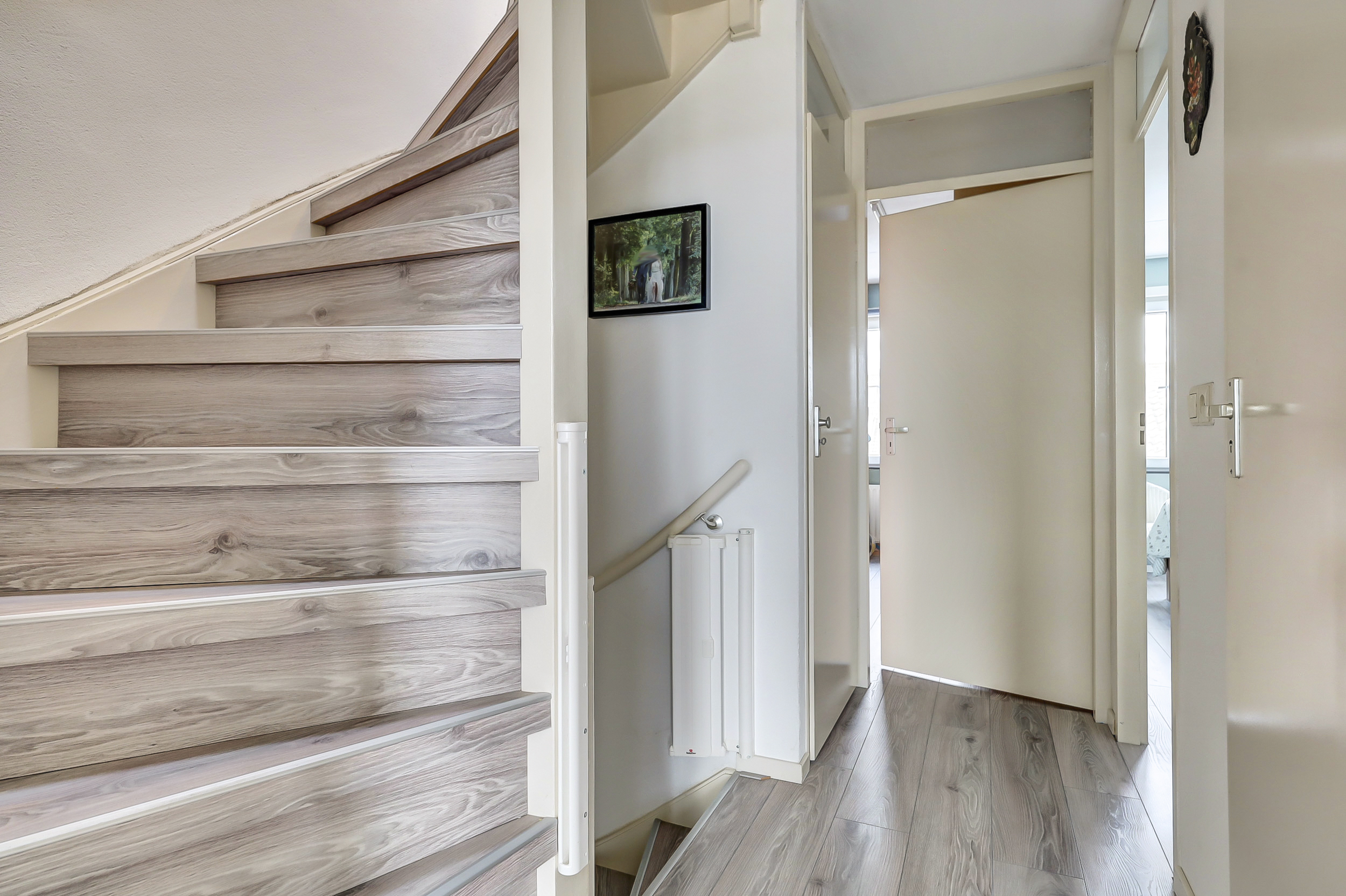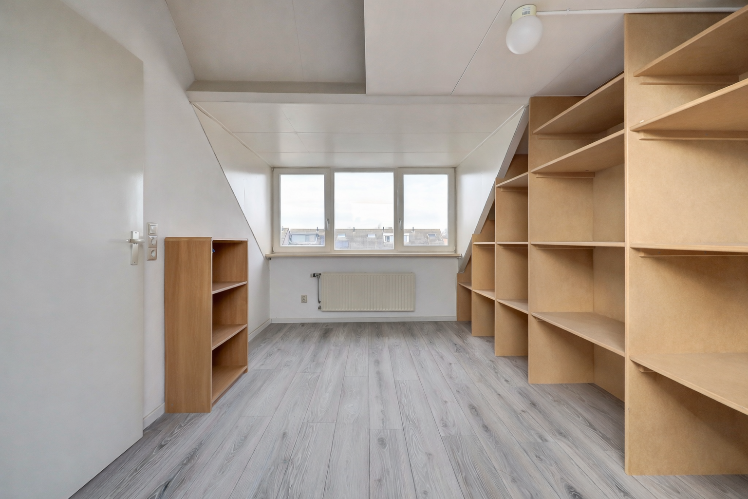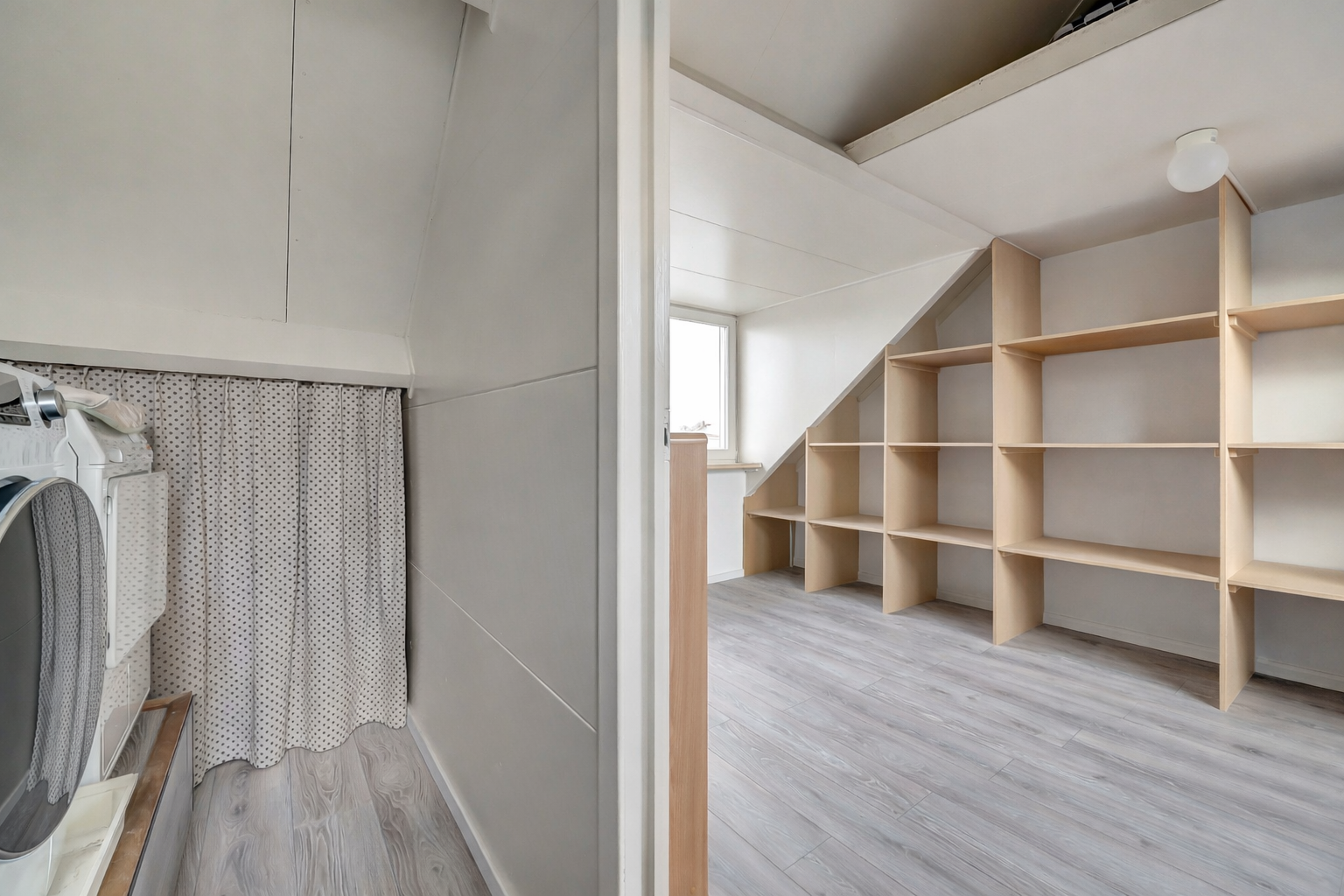 Via een vaste trap is de tweede verdieping bereikbaar. Hier bevindt zich een ruime voorzolder met aansluitingen voor wasmachine en droger en de cv-ketel. Daarnaast is hier een volwaardige vierde slaapkamer gerealiseerd, voorzien van een kastenwand en een dakkapel aan de achterzijde, wat zorgt voor extra ruimte en lichtinval. Boven deze kamer is extra bergruimte aanwezig, ideaal voor het opbergen van seizoensspullen.