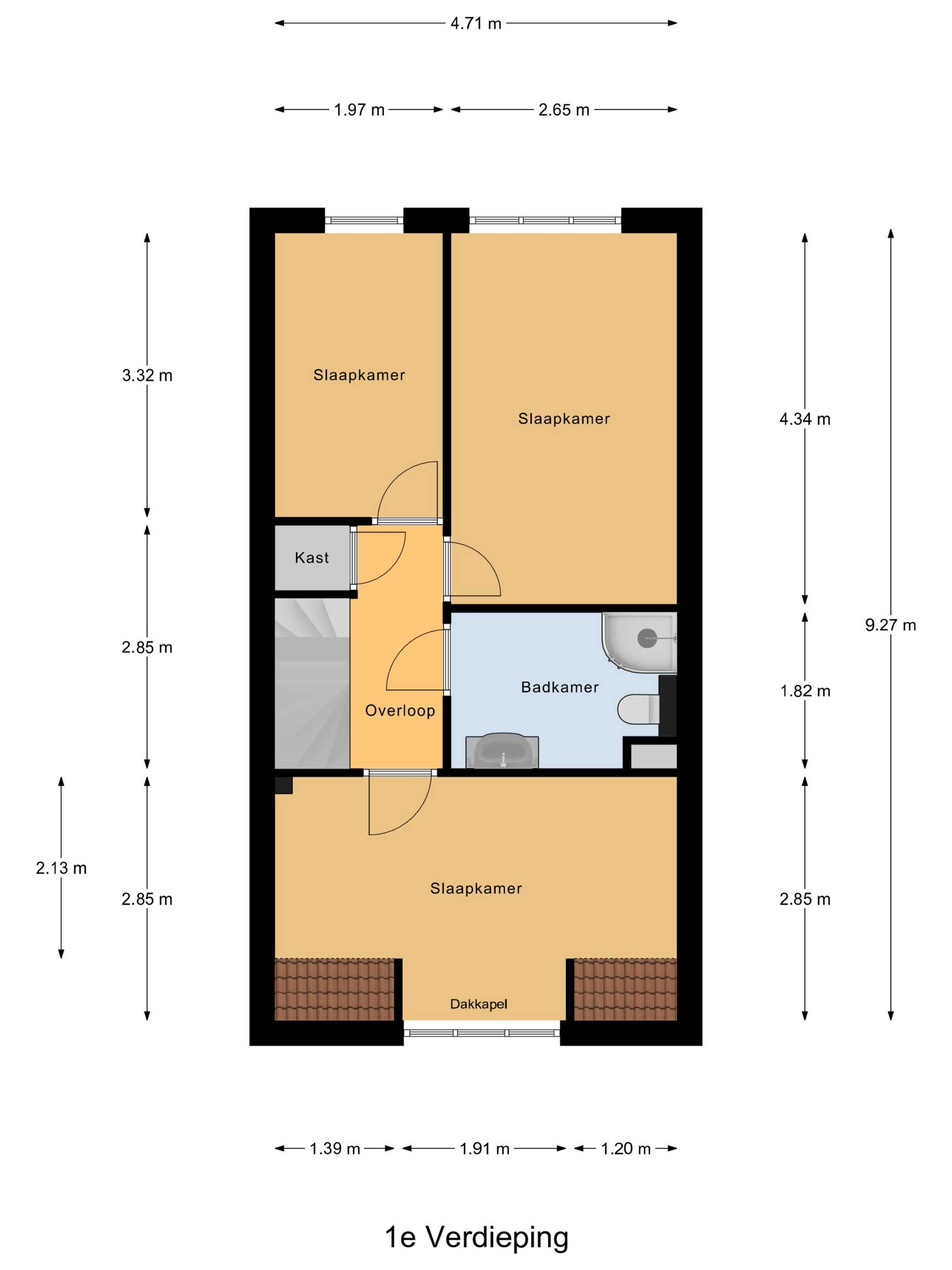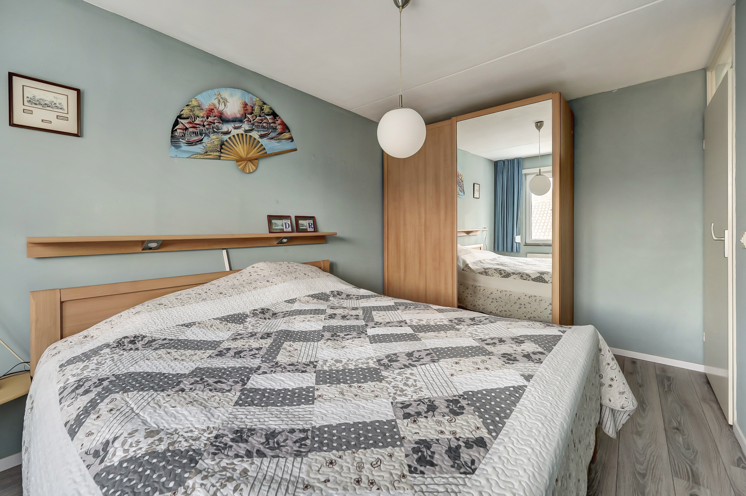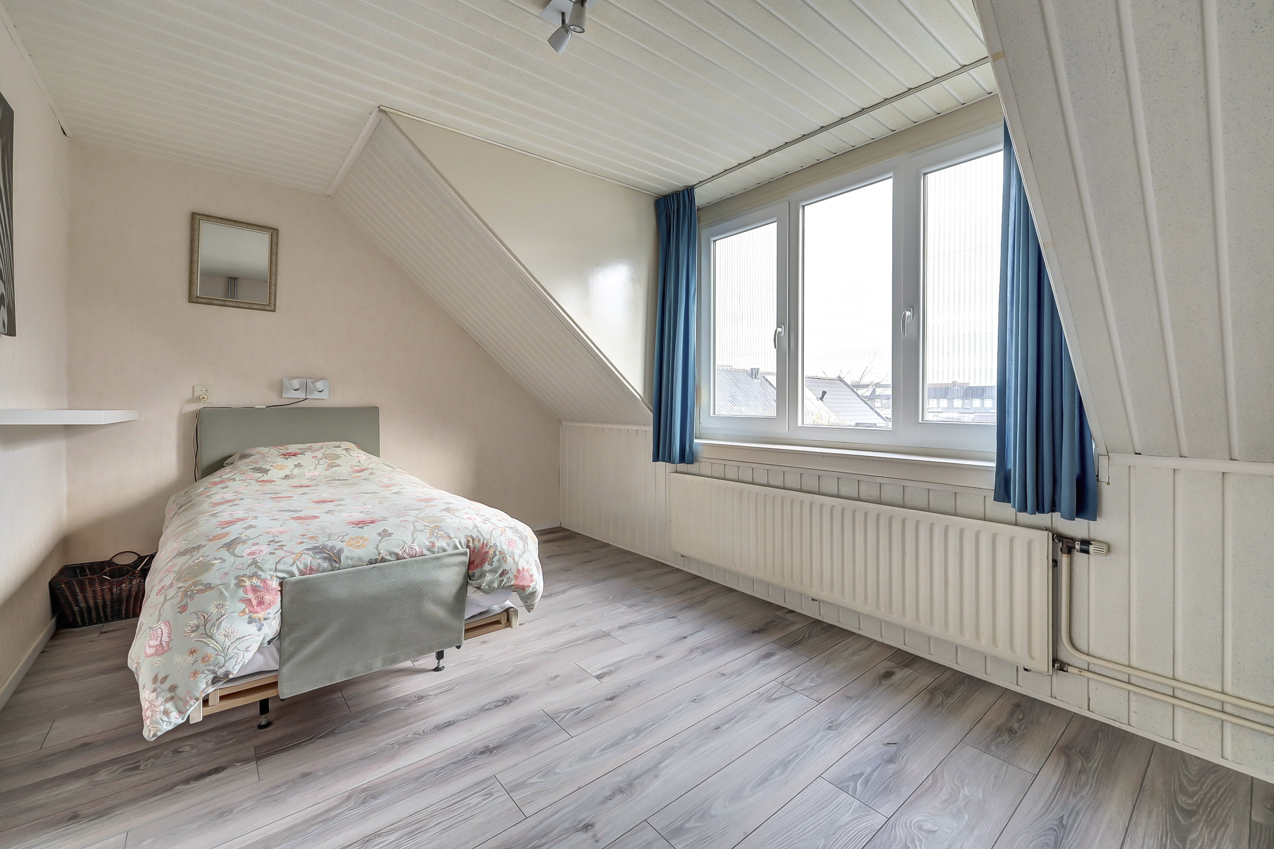Op de eerste verdieping bevinden zich drie slaapkamers. De hoofdslaapkamer is royaal van formaat en beschikt over voldoende ruimte voor een tweepersoonsbed en een kastenwand. De tweede slaapkamer aan de voorzijde is voorzien van een dakkapel, wat zorgt voor extra ruimte en lichtinval. De derde kamer is momenteel ingericht als kastenkamer, maar is uitstekend geschikt als kinder-, werk- of logeerkamer. Op de overloop bevindt zich daarnaast een praktische vaste bergkast. De badkamer is functioneel ingericht en voorzien van een toilet, een wastafel met meubel en een douche.