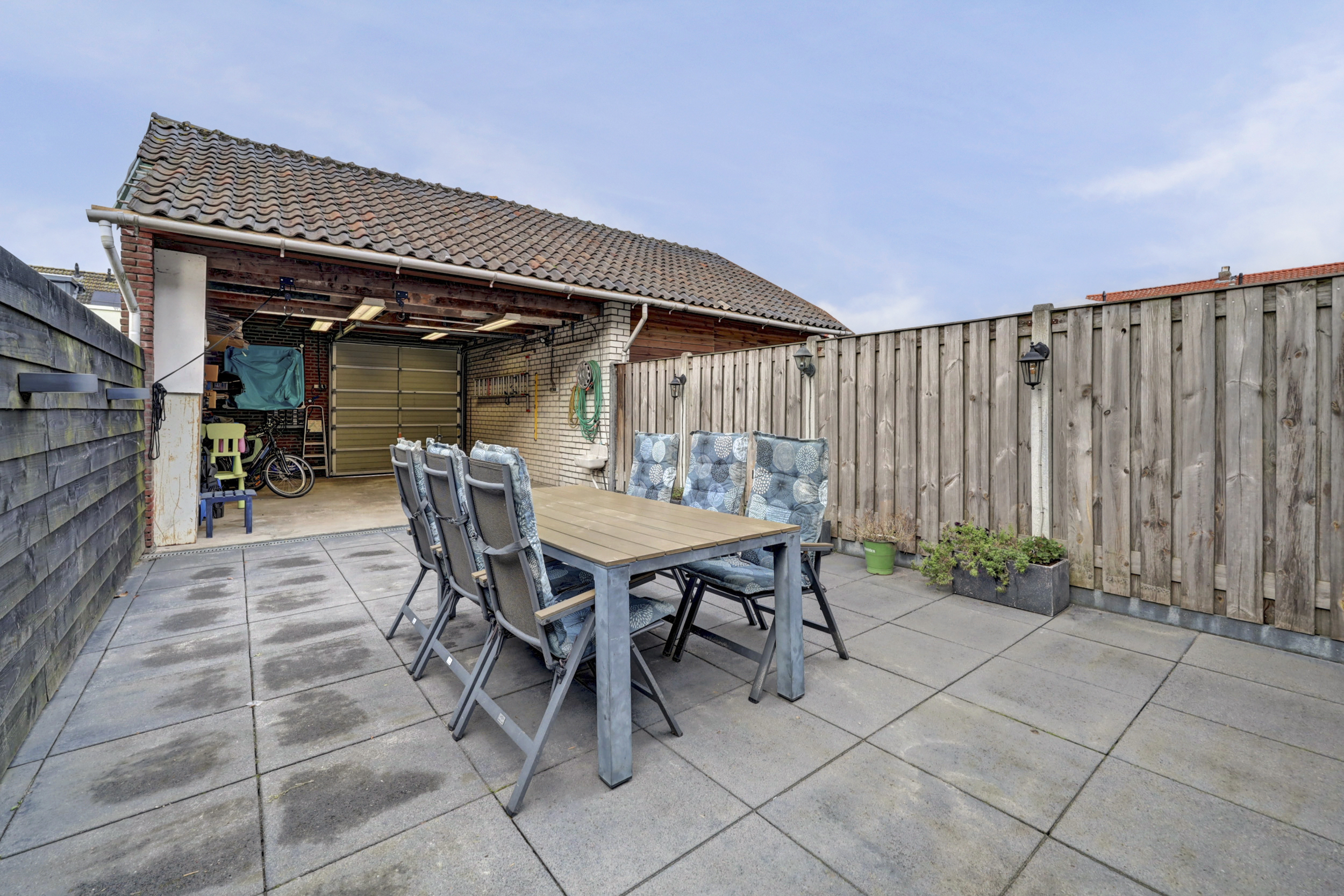 De achtertuin is gunstig gelegen op het westen, waardoor je hier in de middag en avond heerlijk van de zon kunt genieten. De tuin is geheel betegeld en voorzien van een terras. De serre vormt een fijne extra leefruimte tussen binnen en buiten. Achter in de tuin bevindt zich een zeer ruime garage, bereikbaar via de achterzijde van het perceel en tevens het achterom. De garage is voorzien van water- en elektra-aansluitingen en heeft een grote garagedeur, waardoor er met gemak een auto of zelfs een caravan kan worden gestald. Daarnaast beschikt de garage over een vliering, wat zorgt voor extra bergruimte.