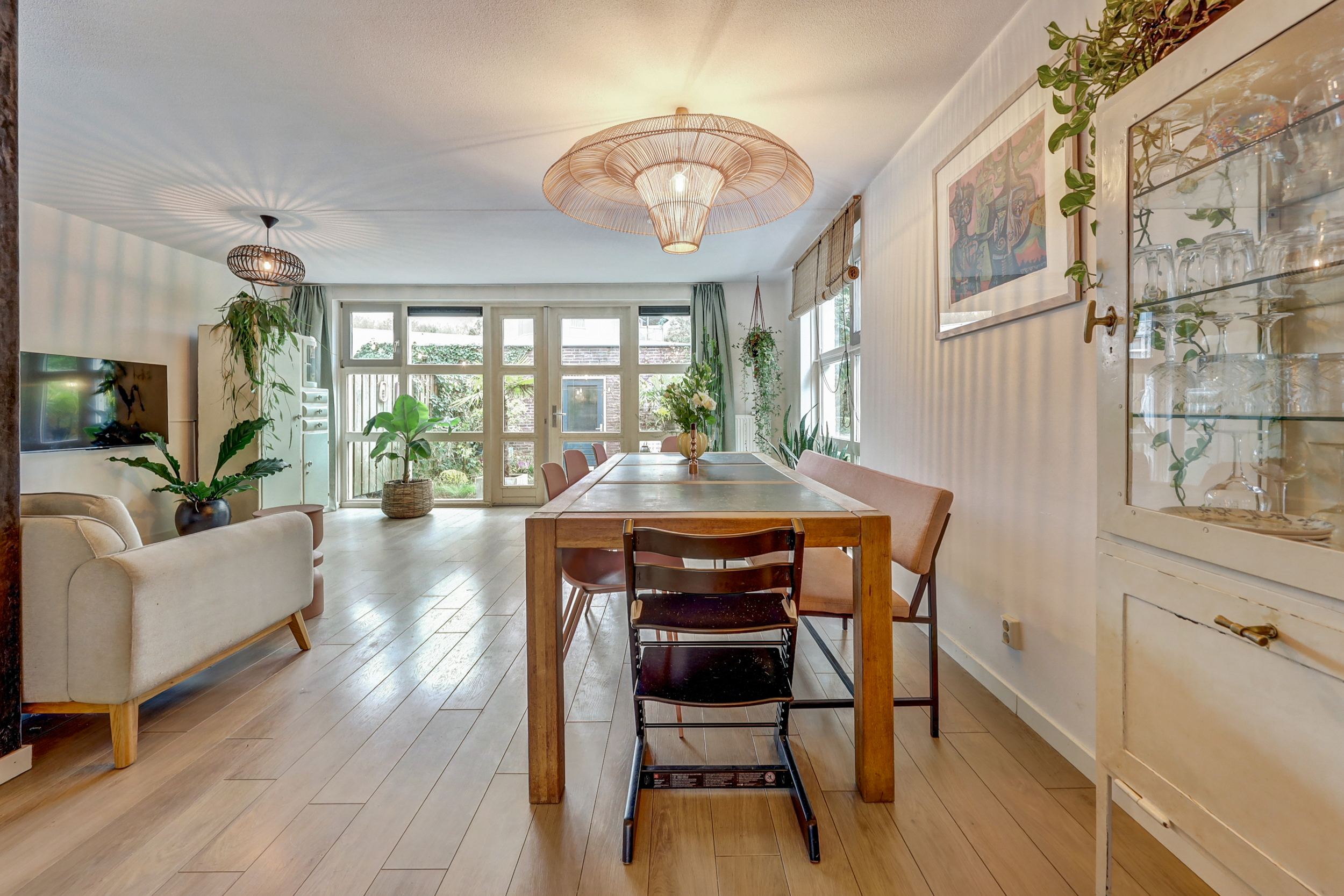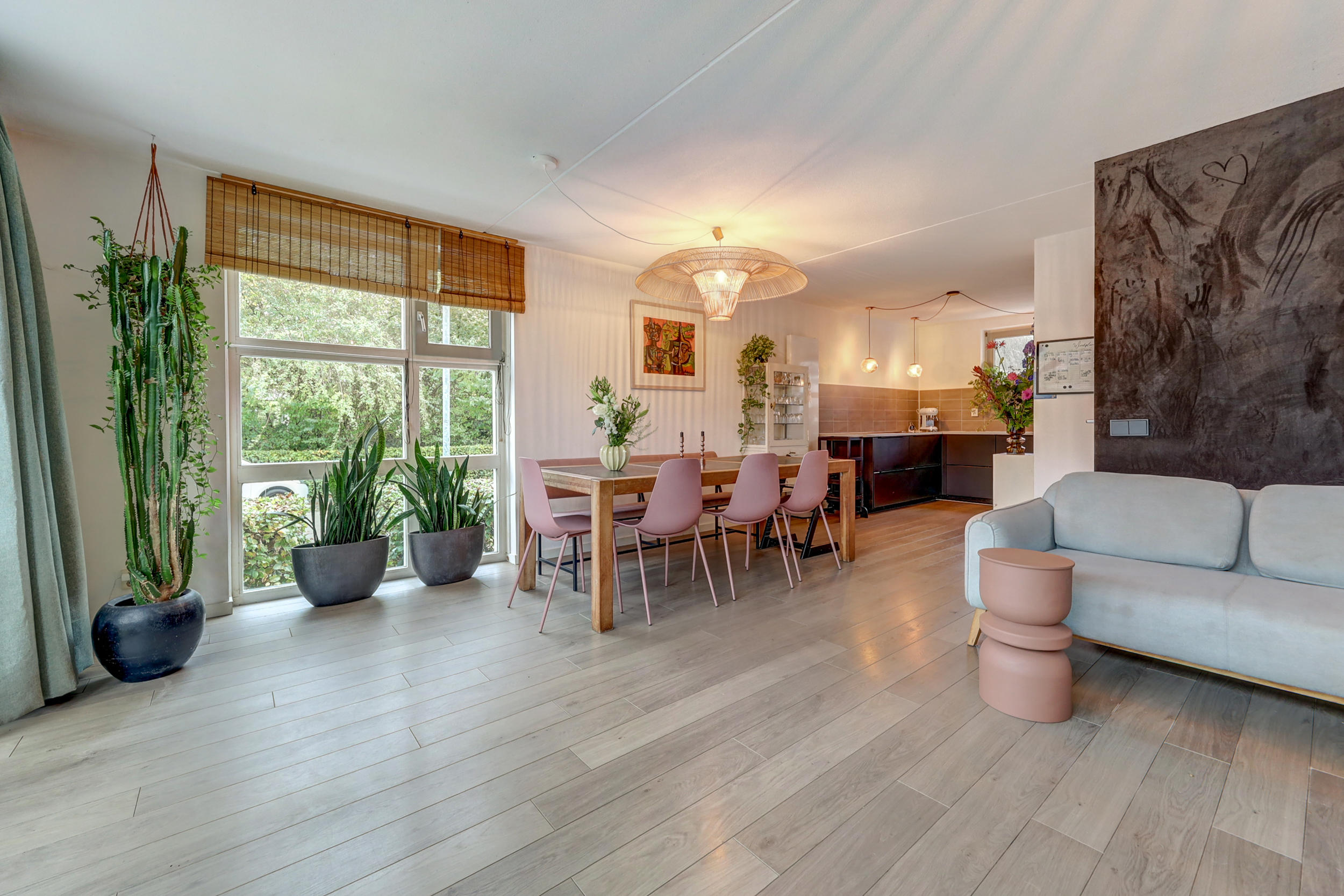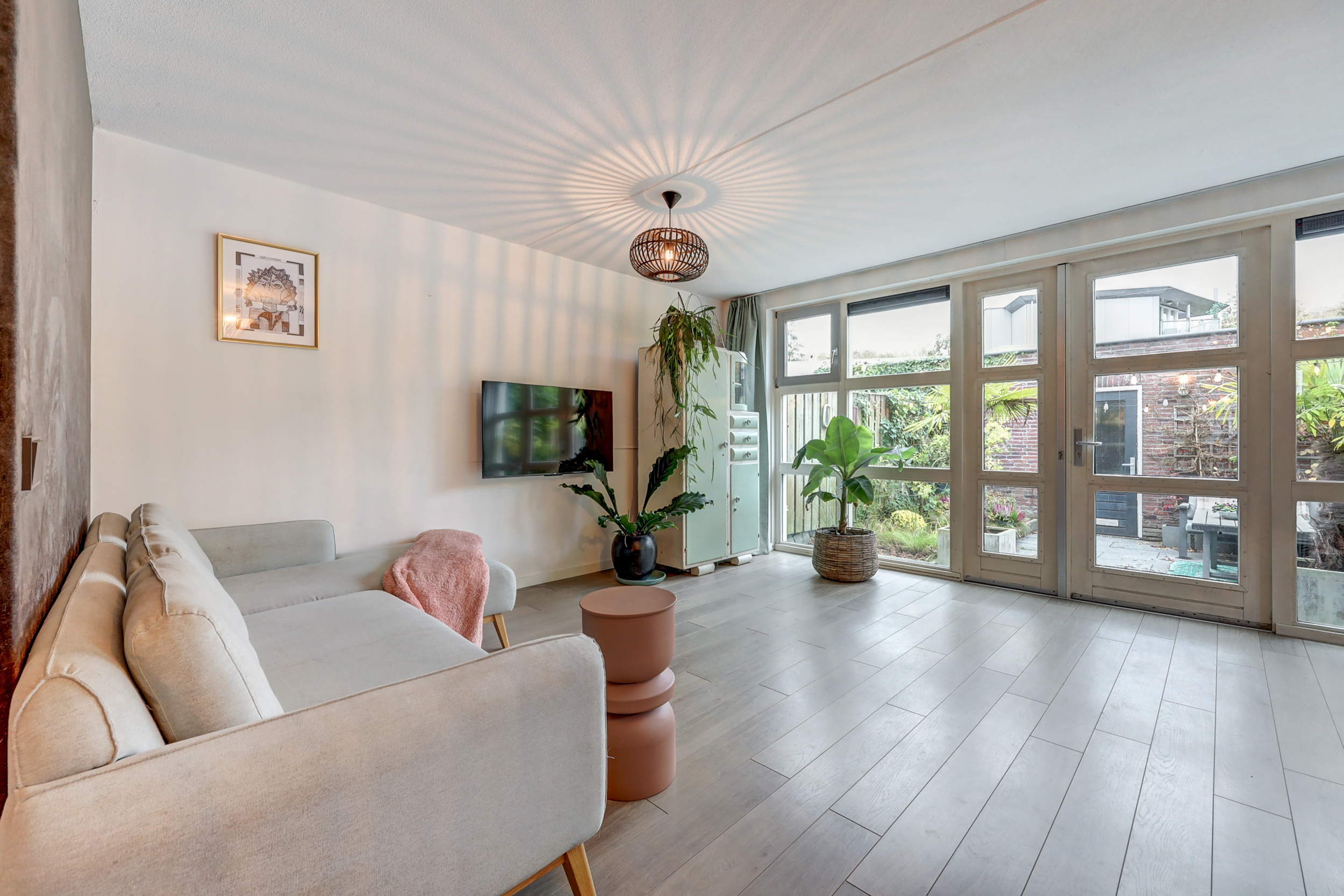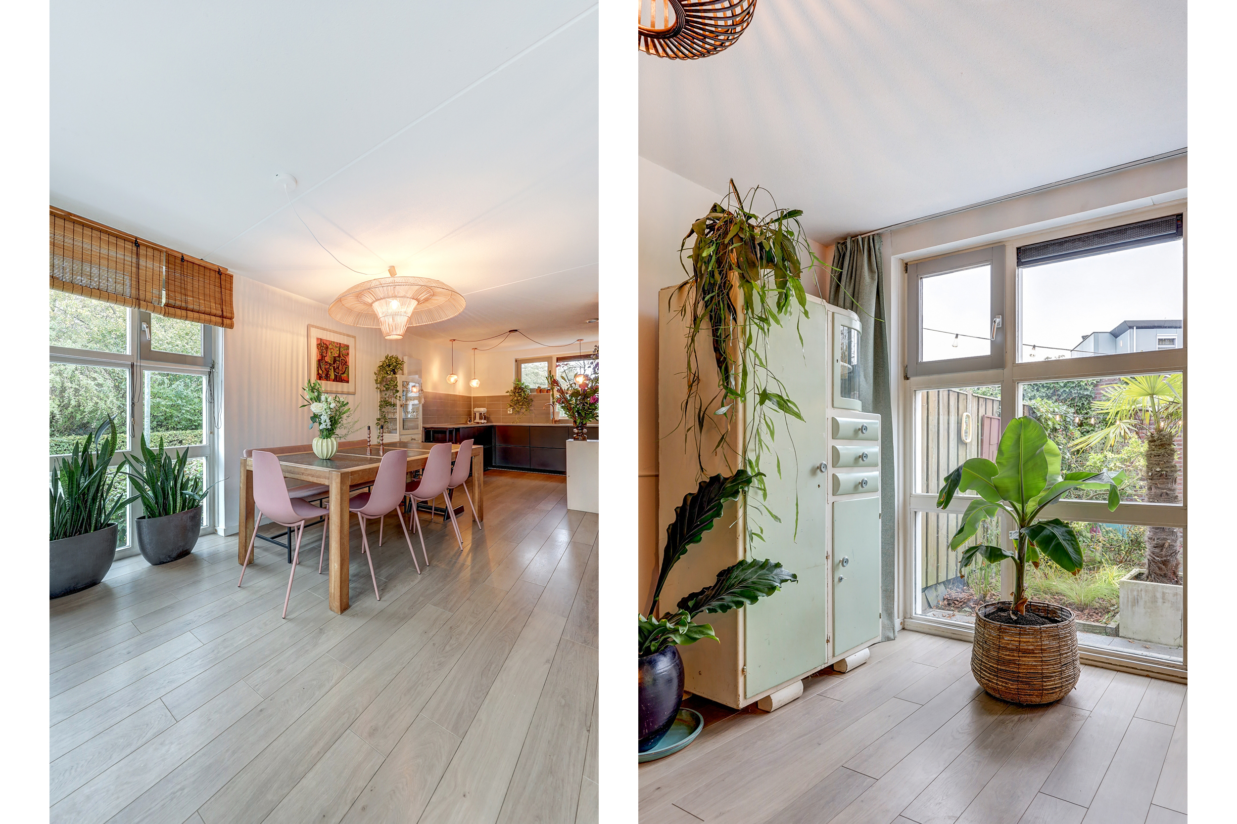 De lichte woonkamer is afgewerkt met een fraaie laminaatvloer en heeft openslaande deuren aan de tuinzijde en een extra zijraam.