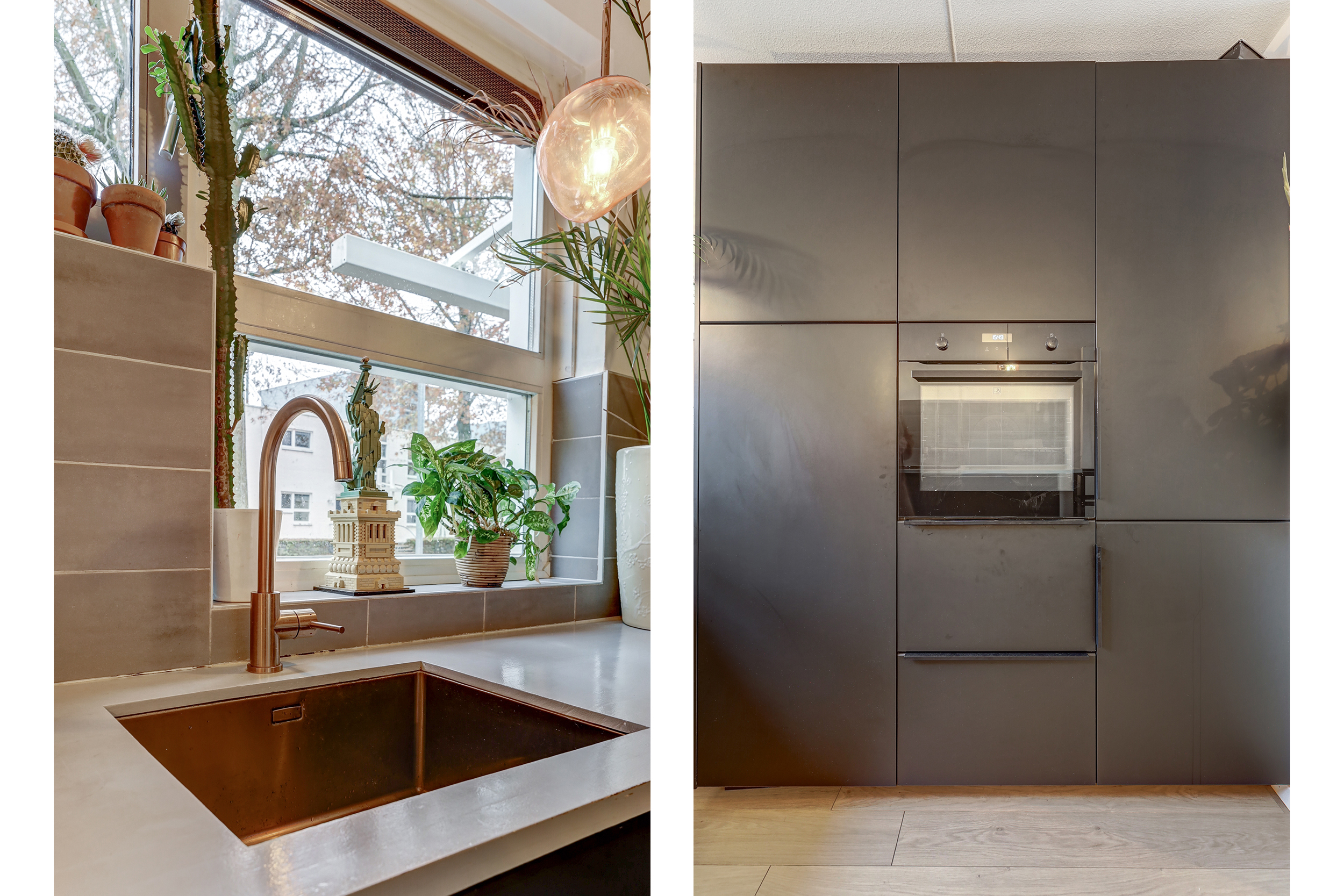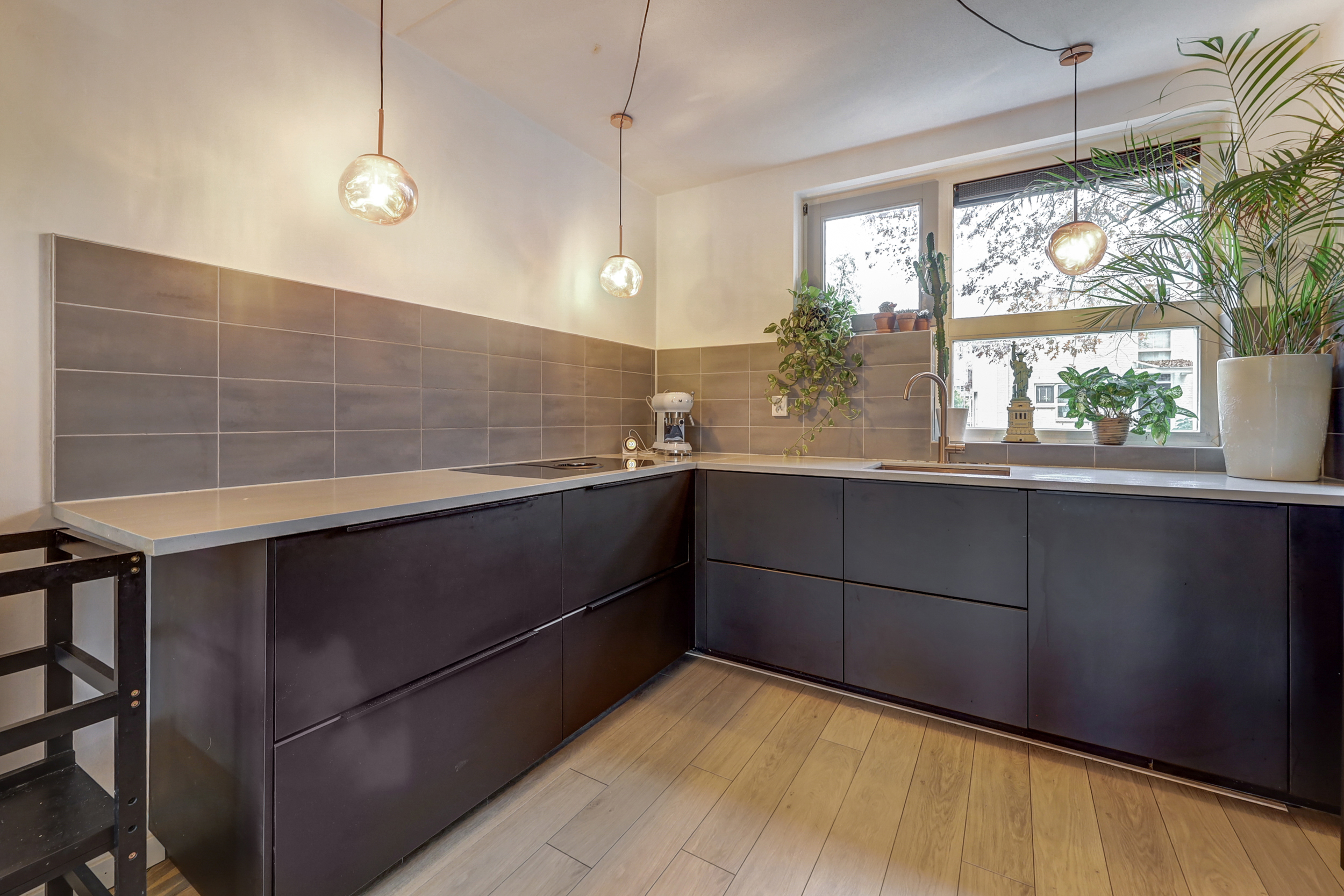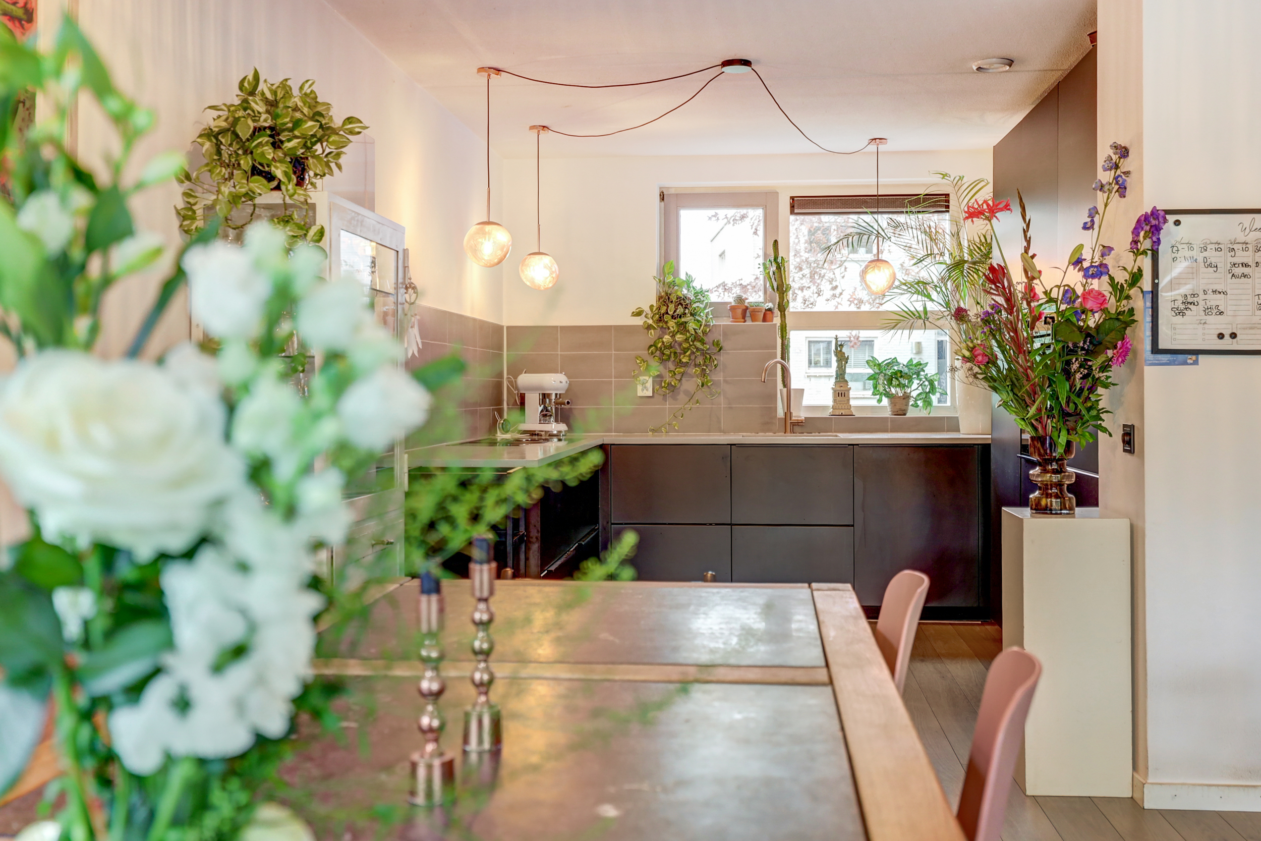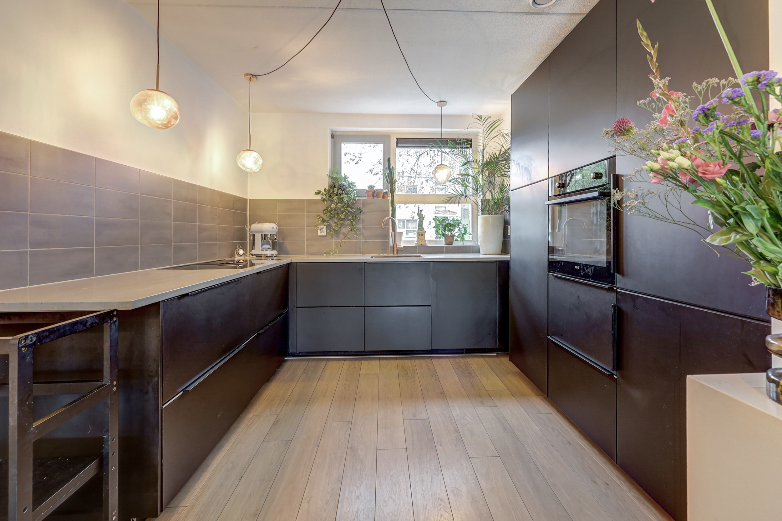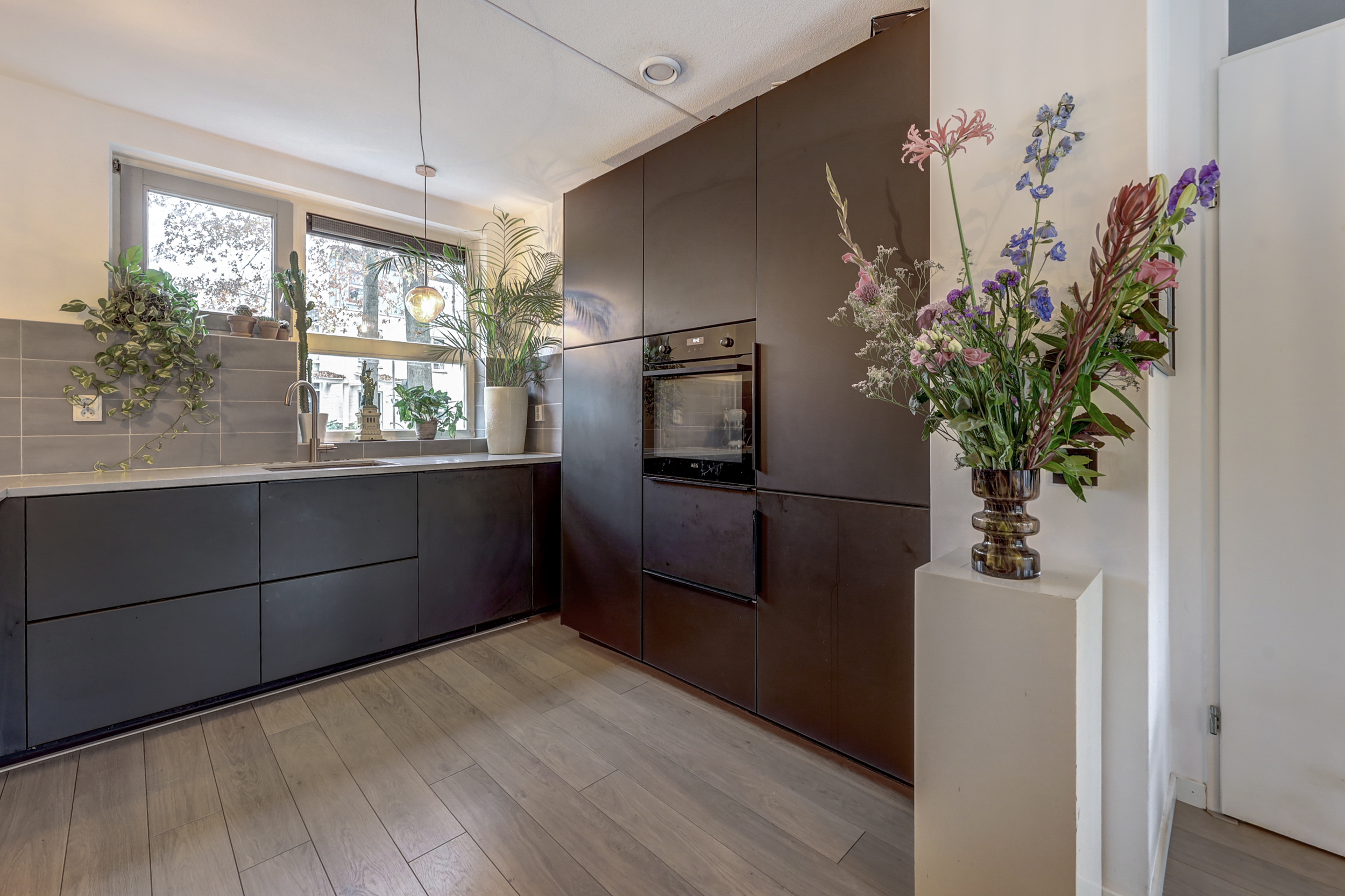 De moderne open keuken bevindt zich aan de voorzijde van de woning en is in een hoekopstelling geplaatst. De keuken beschikt over een koelkast, diepvriezer, inductiekookplaat met afzuiging, inbouwoven en een vaatwasser. Vanuit de keuken heeft u een leuk uitzicht op de straat en het speelveld aan de voorzijde.