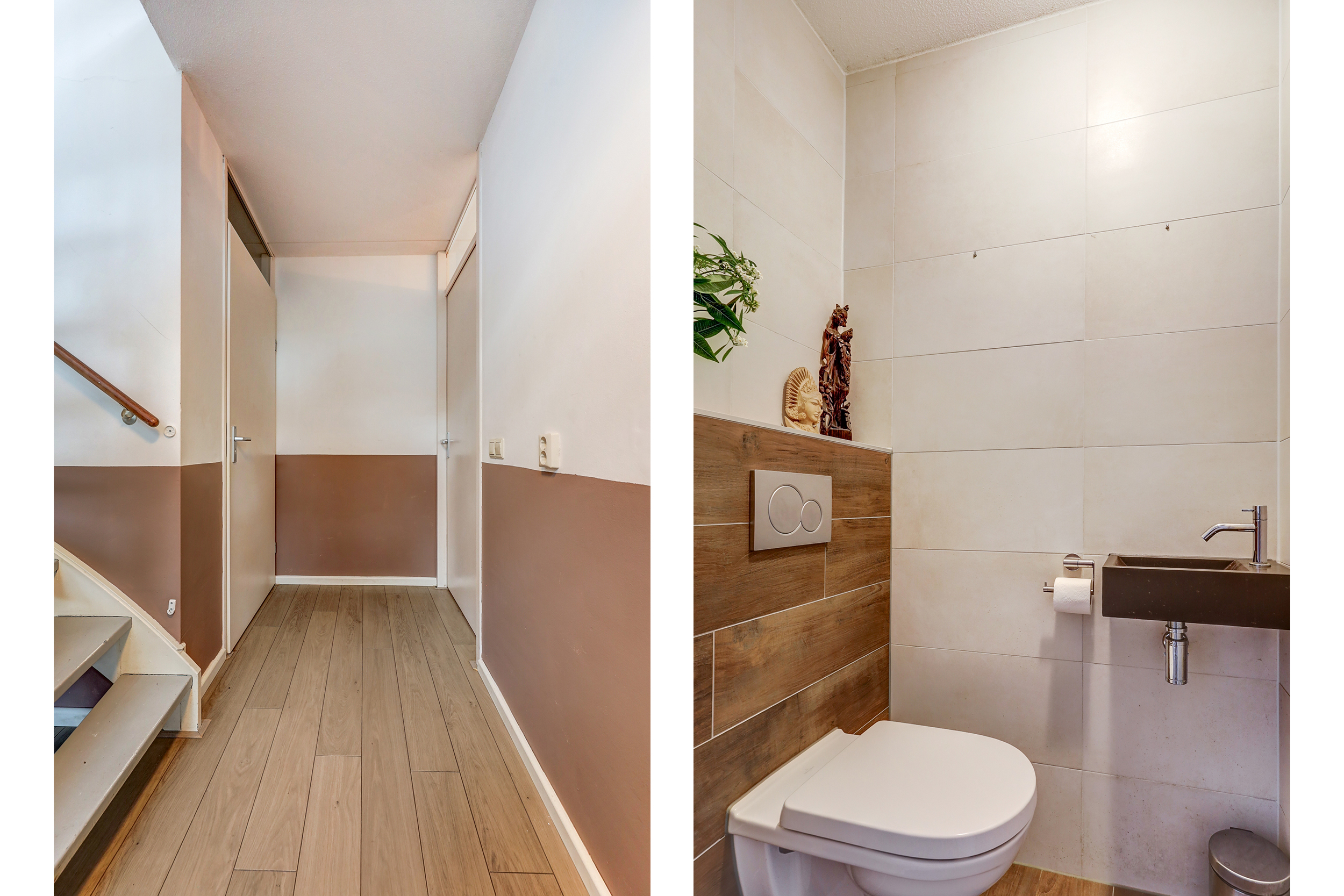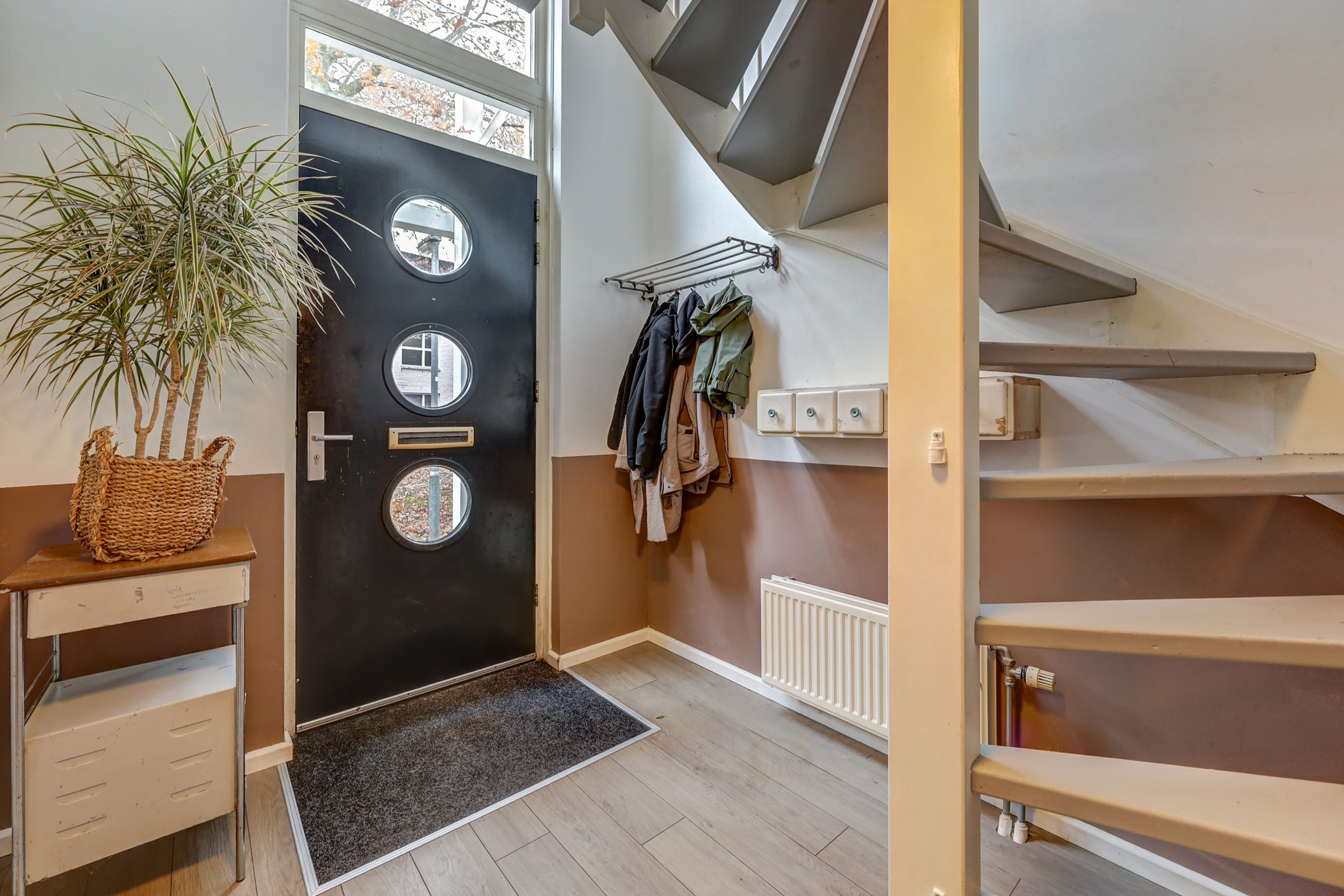 Royale hal met garderobe, modern toilet met wandcloset, meterkast en trap naar etages.