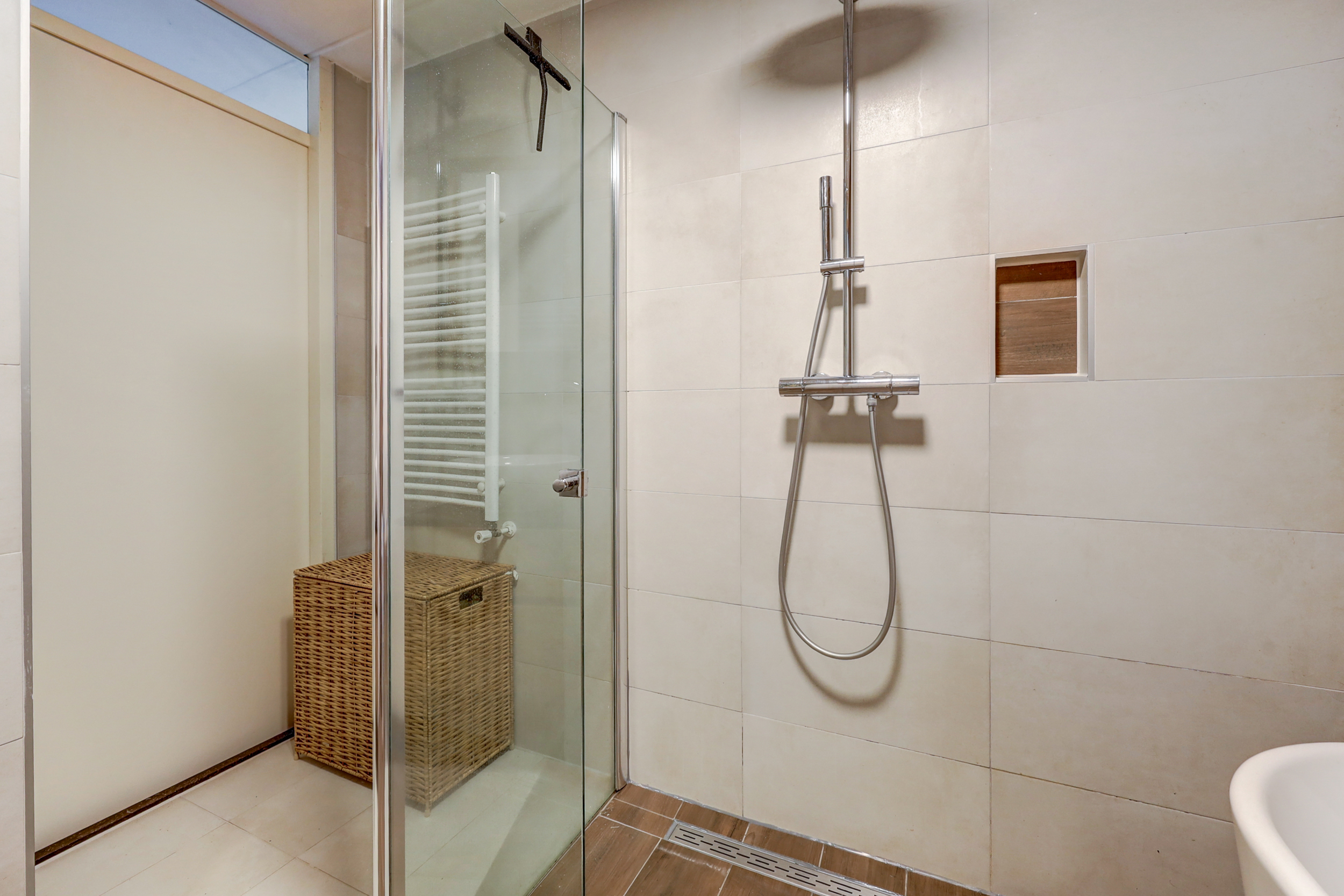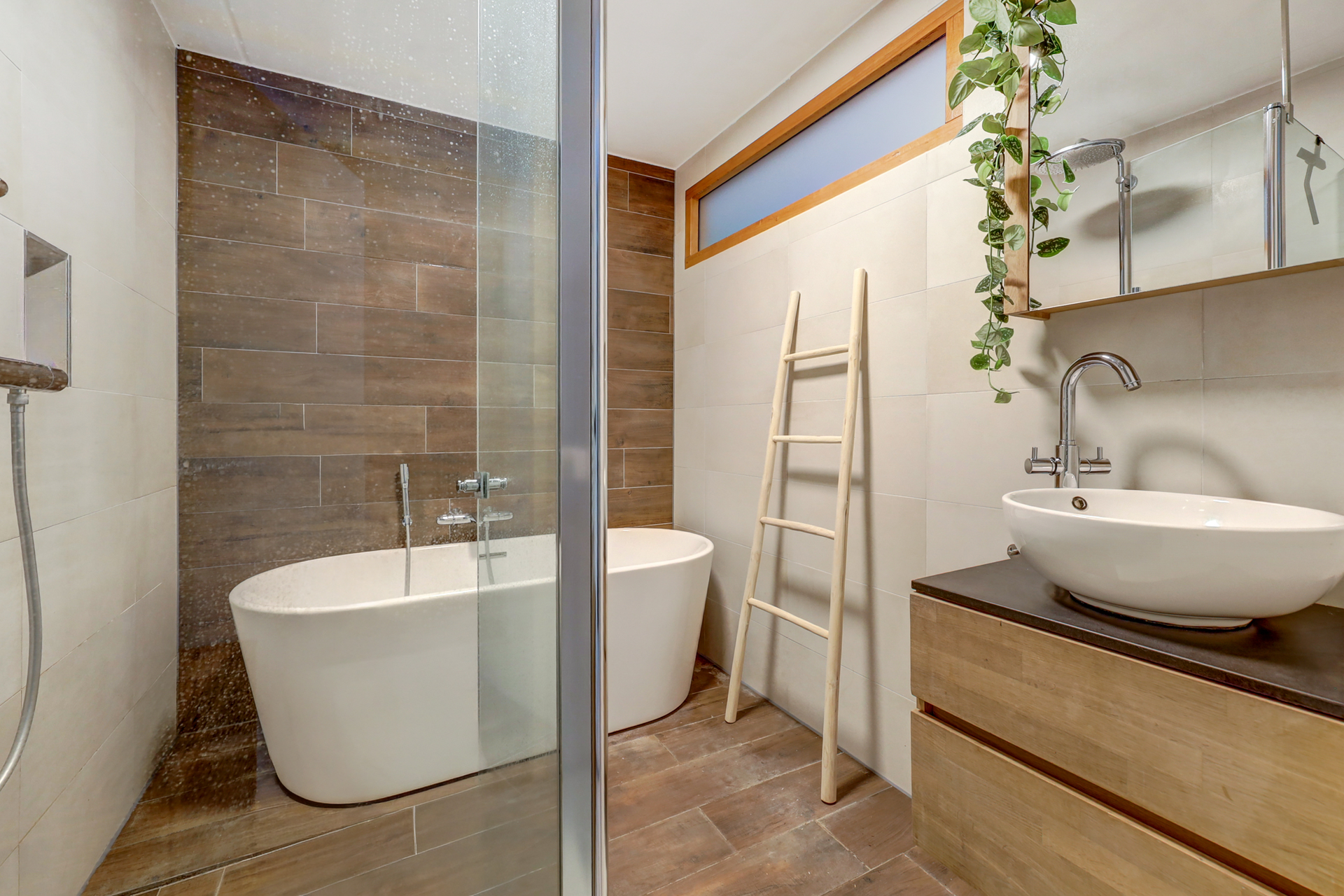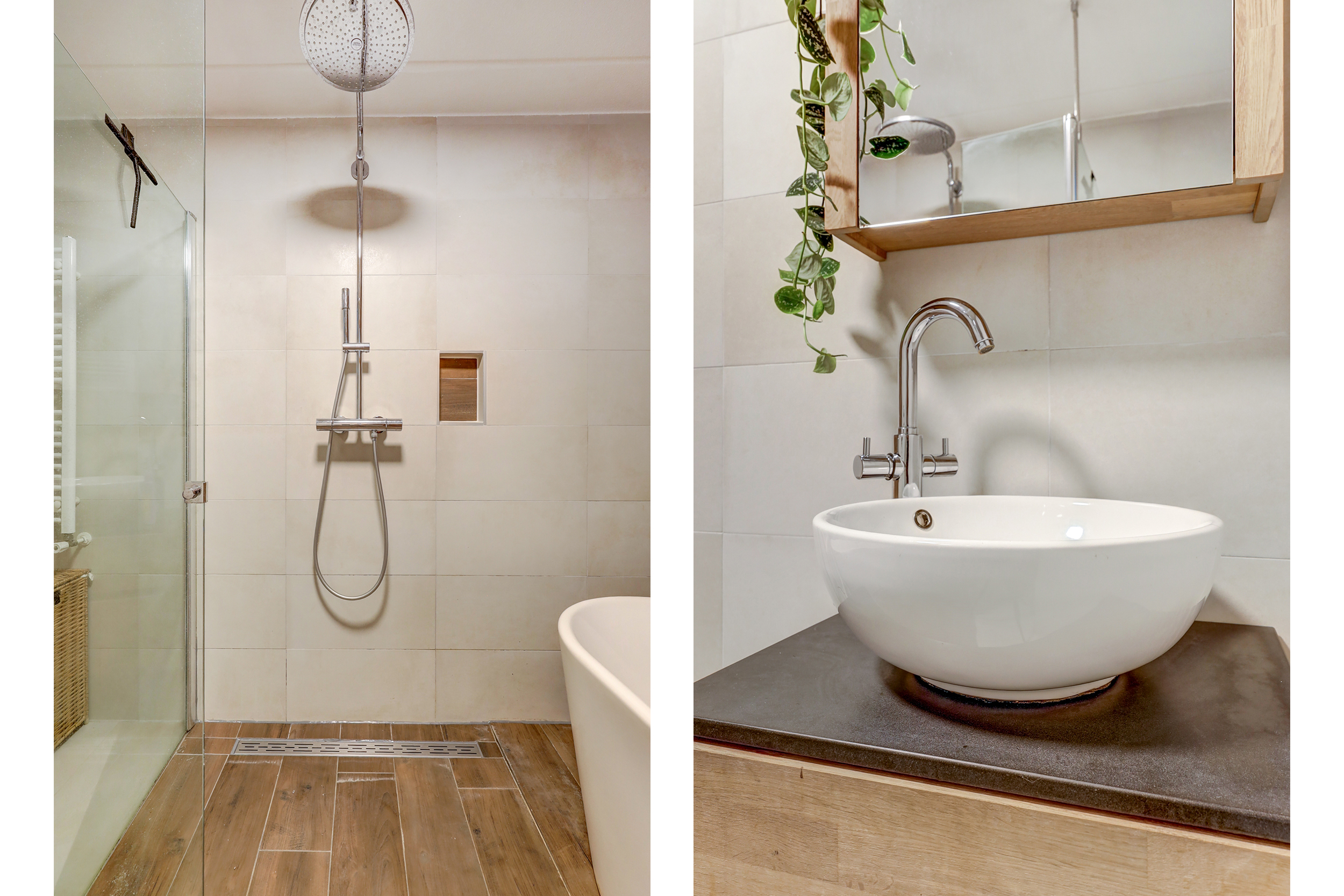 - Ligbad, wastafel, wastafelmeubel en inloopdouche