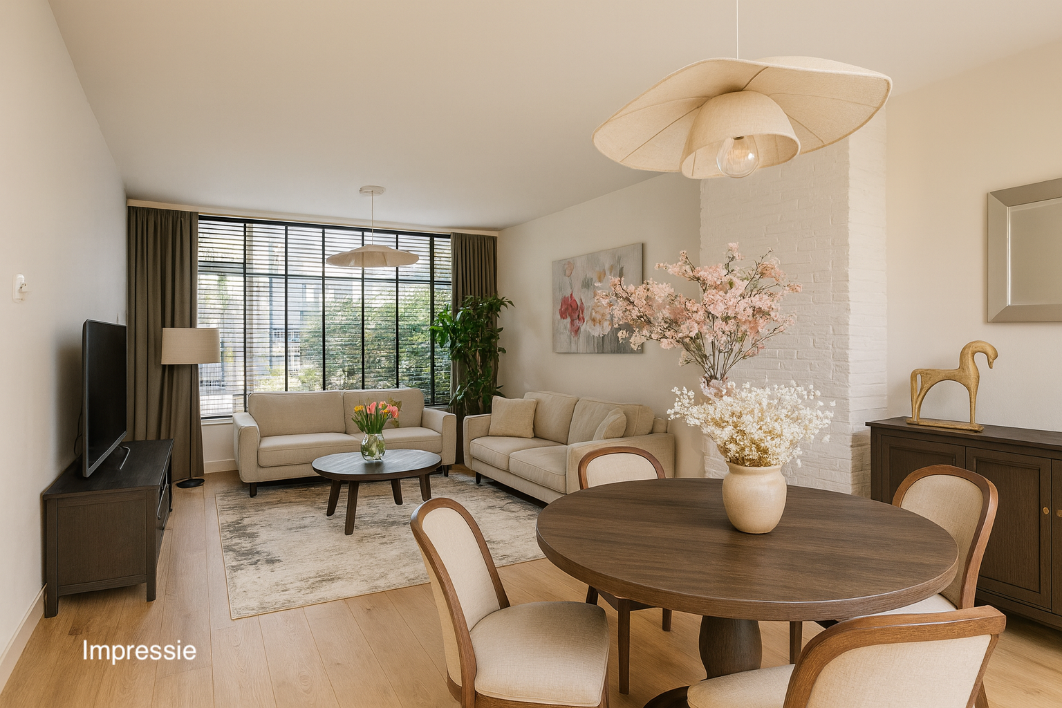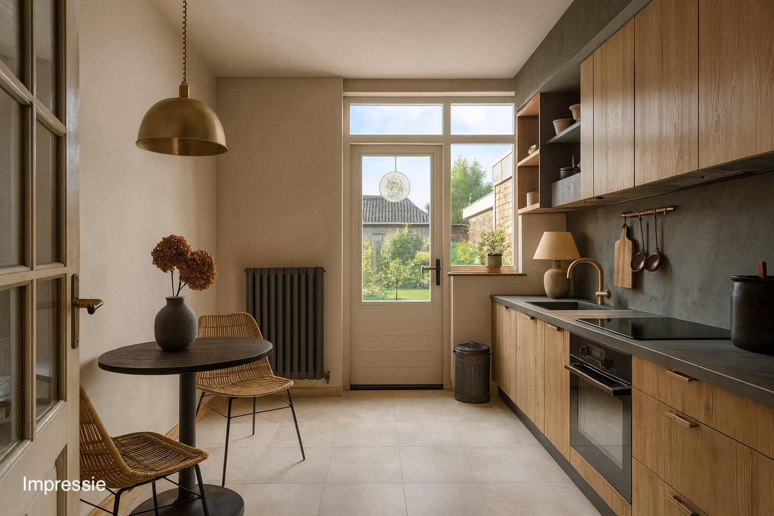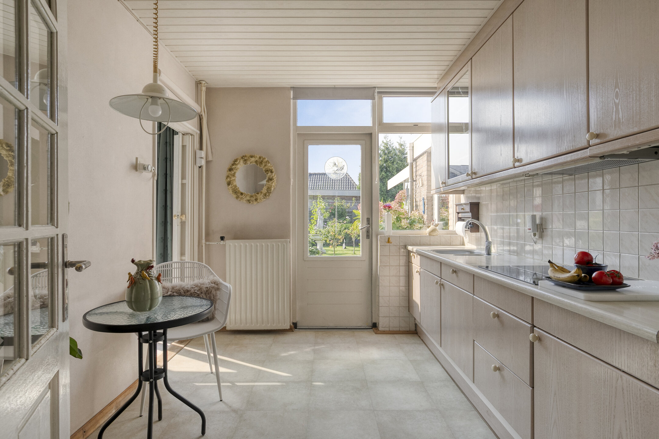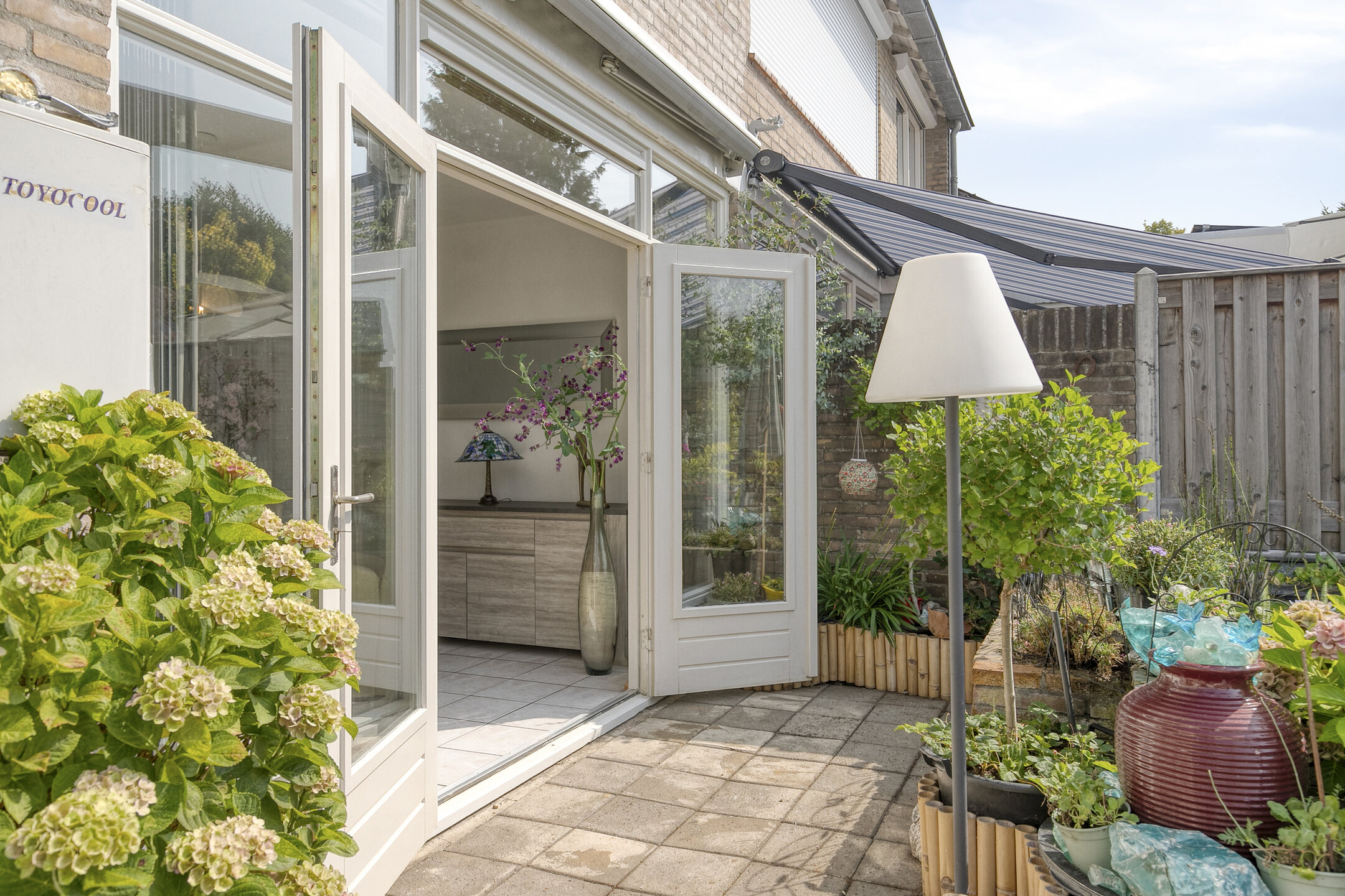 Via de oprit kom je binnen in de hal met toilet, meterkast en trapopgang. De keuken is functioneel ingericht en geeft toegang tot zowel de tuin als de lichte woonkamer met grote ramen en dubbele tuindeuren. De airconditioning zorgt voor extra comfort.