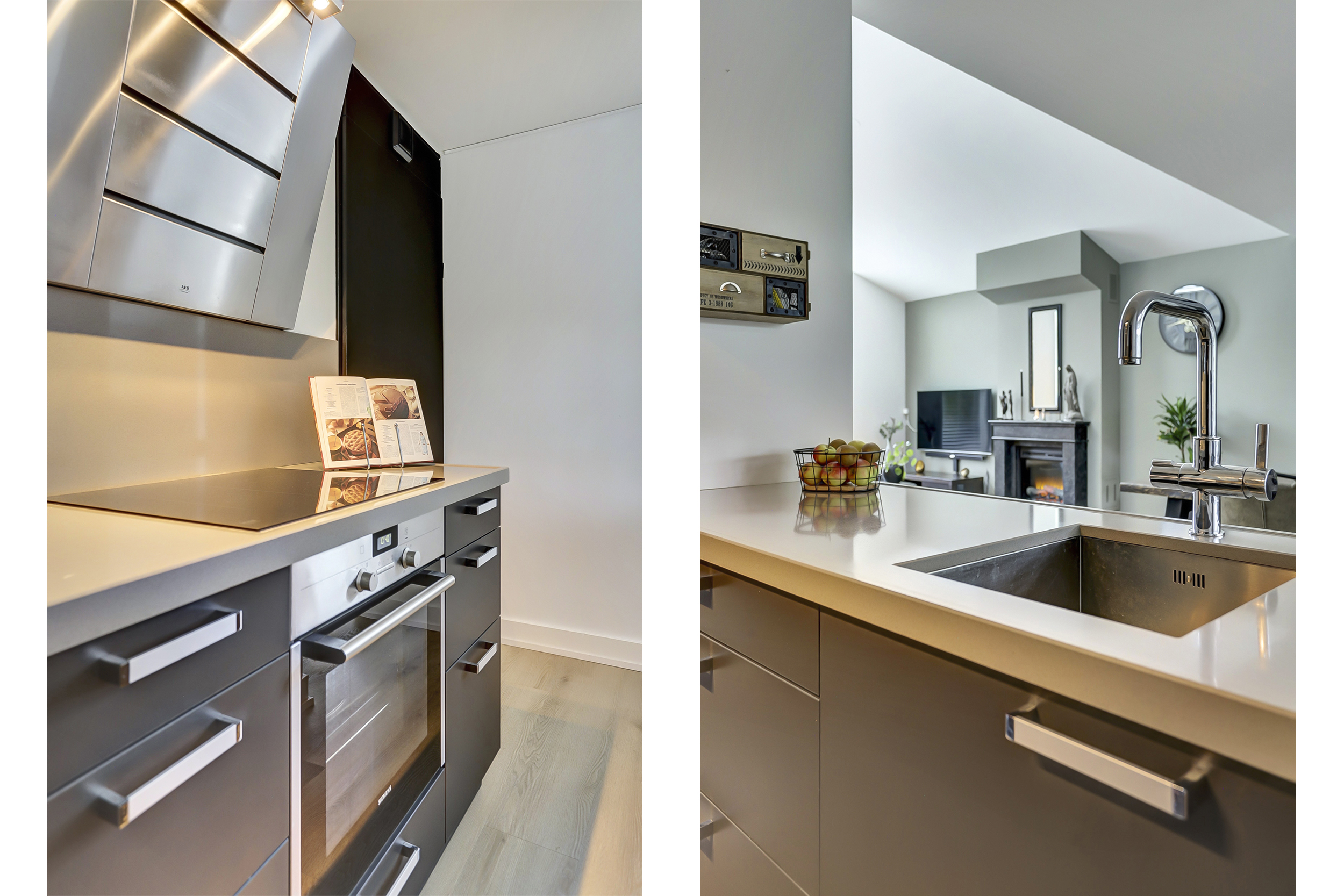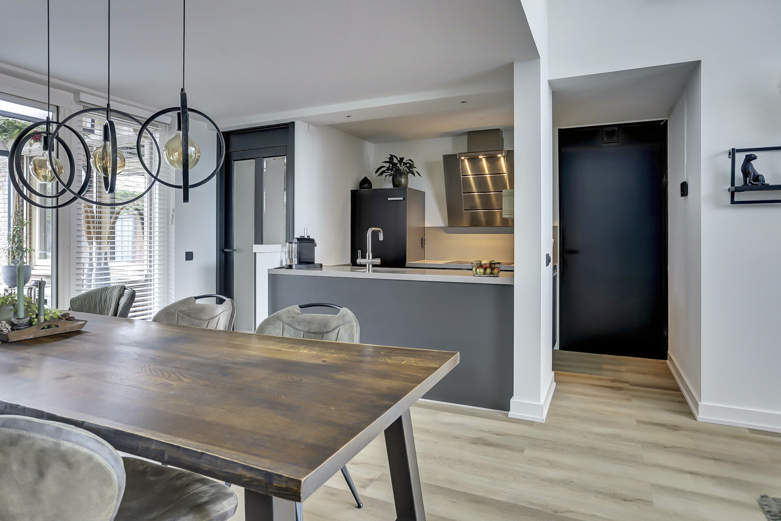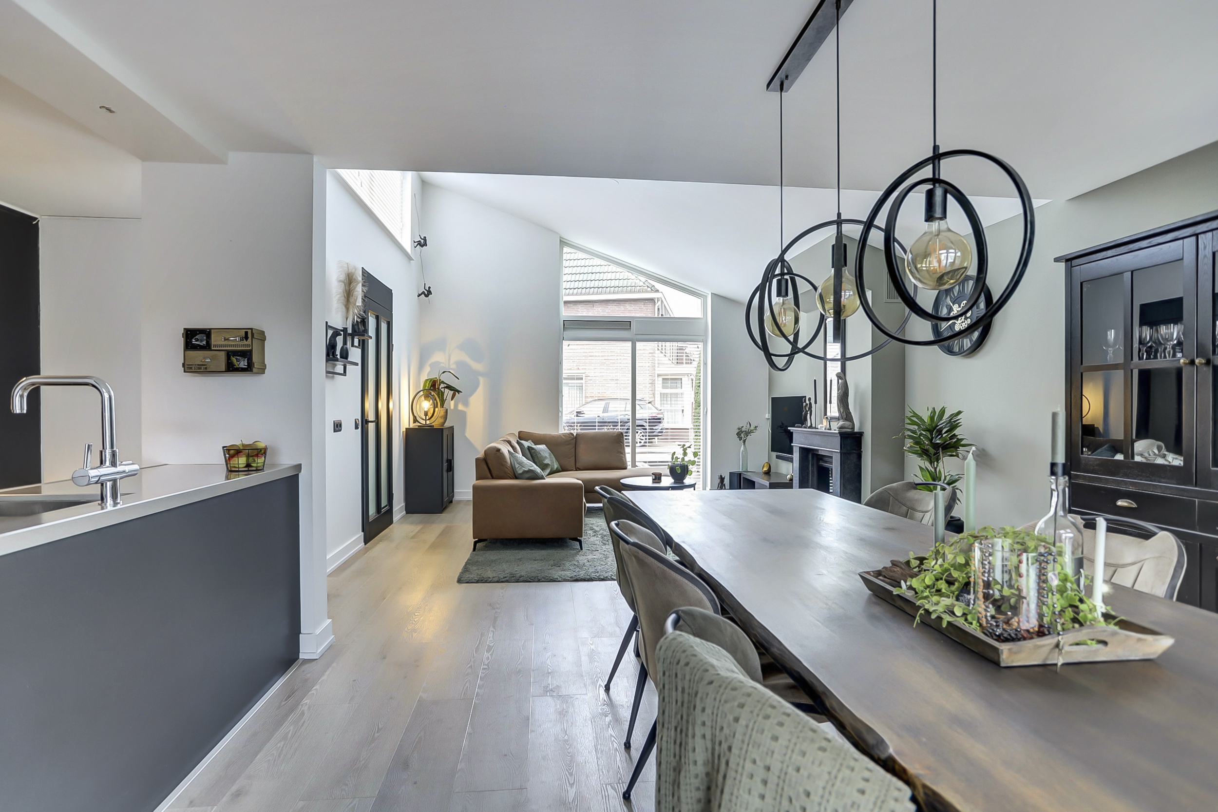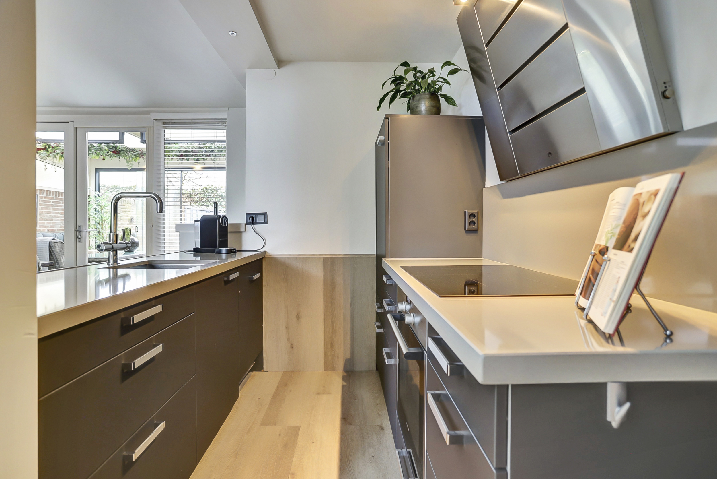 U betreedt de woning via de entreehal die toegang biedt tot de meterkast, het toilet en de woonkamer. Bij binnenkomst in de woonkamer valt direct het hoge plafond op, wat zorgt voor een ruimtelijk en open gevoel. Er is volop plaats voor een gezellige zithoek en een grote eettafel. De grote raamkozijnen zorgen voor veel daglicht in de leefruimte. Via de dubbele tuindeuren is de achtertuin direct bereikbaar. Dit maakt binnen en buiten mooi met elkaar verbonden. De open keuken is voorzien van inbouwapparatuur zoals een inductiekookplaat, oven, koelkast en vaatwasser. Tot slot is in dit gedeelte van de woning is comfortabele vloerverwarming aanwezig.