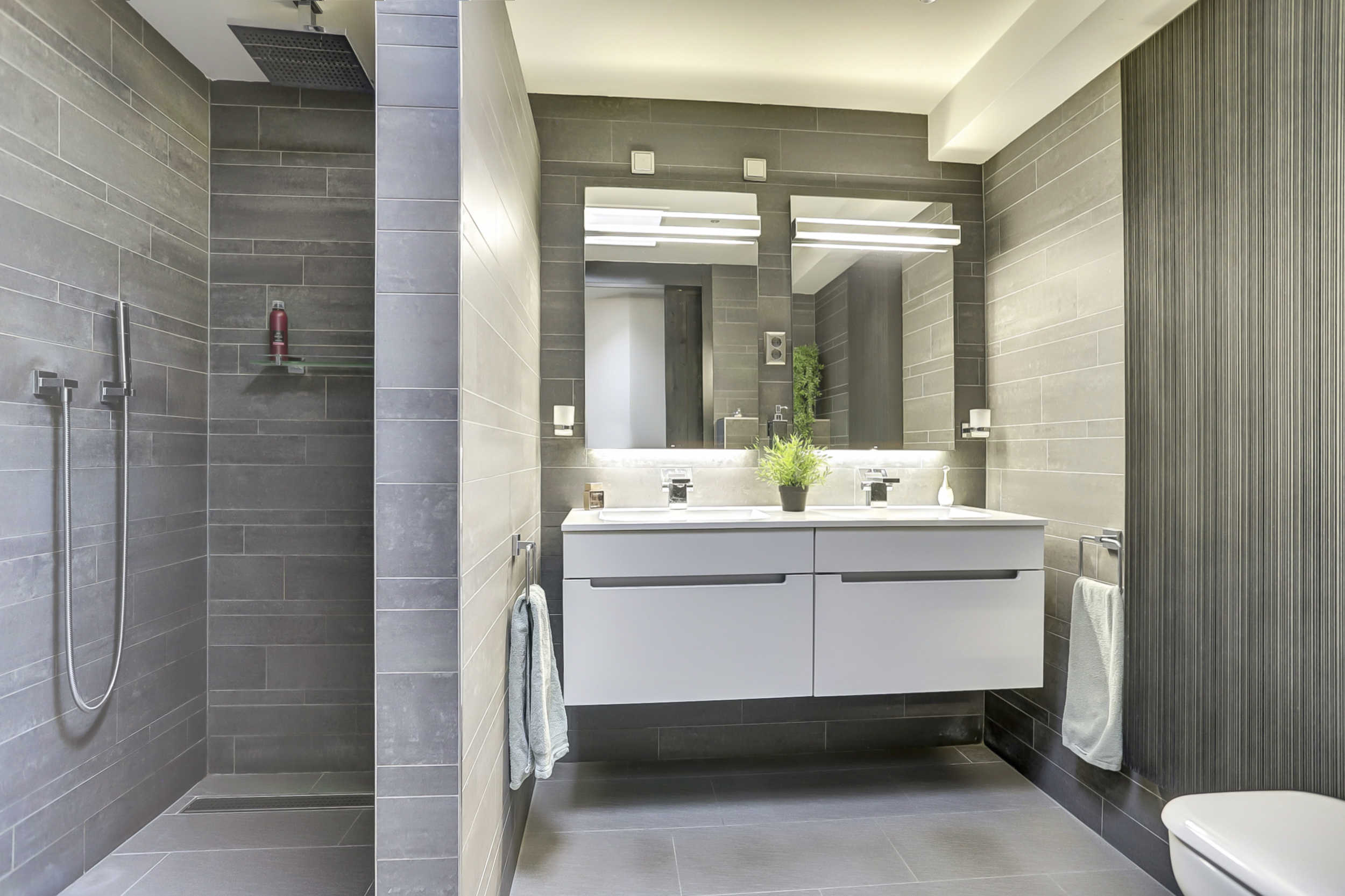 - Toilet, dubbele wastafel, wastafelmeubel en inloopdouche