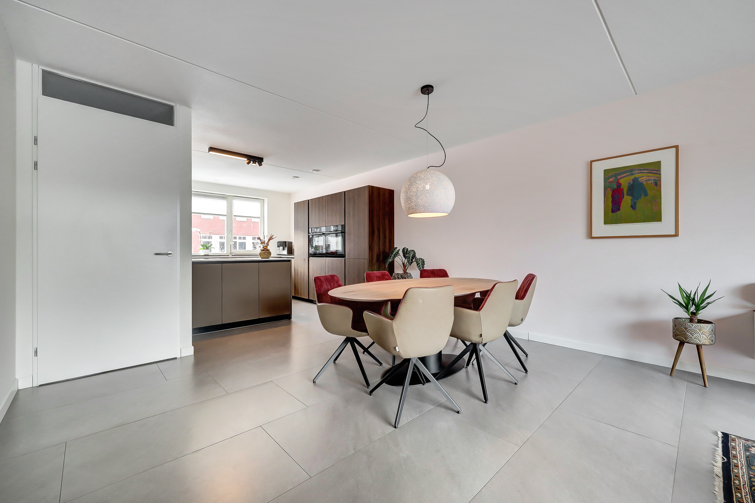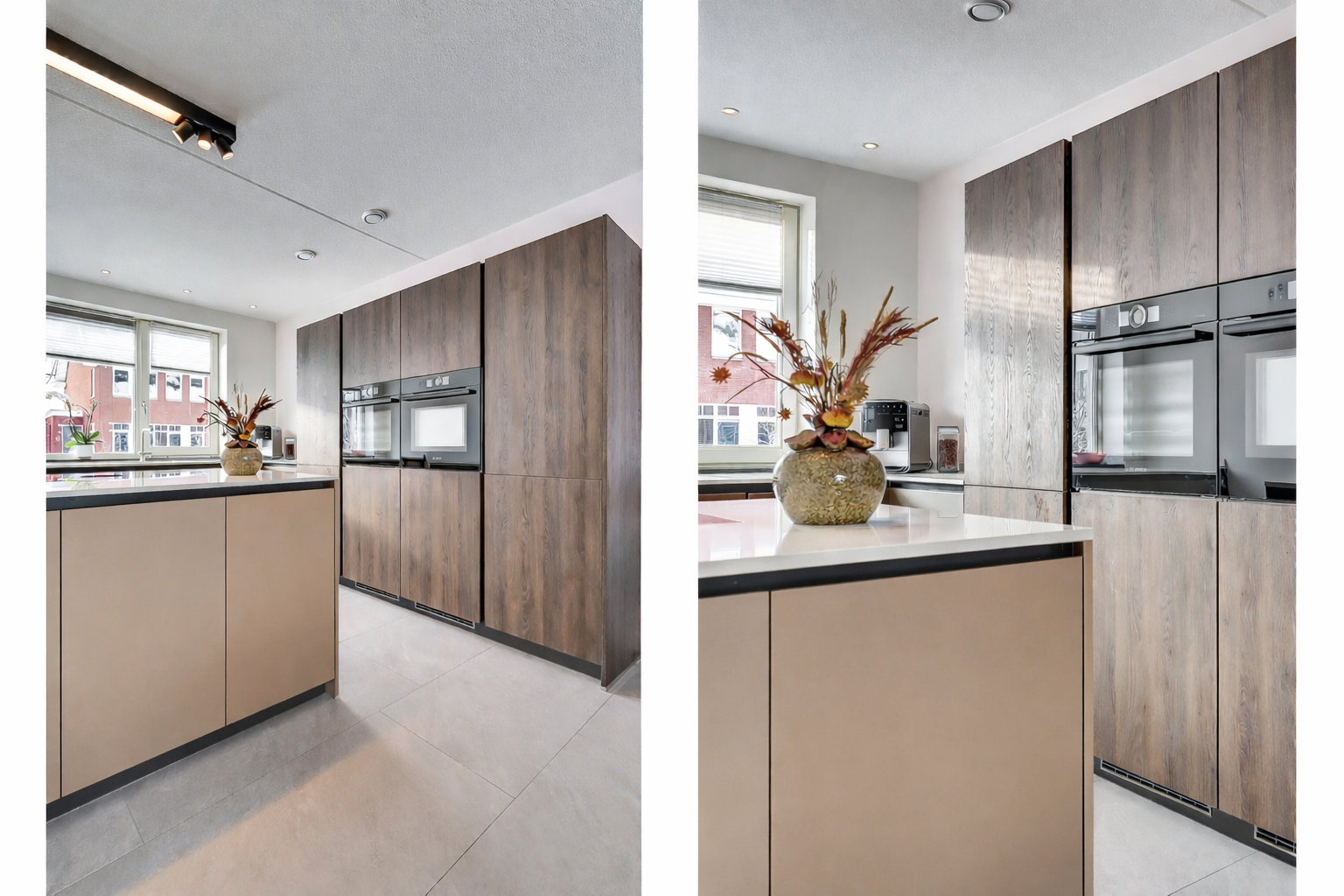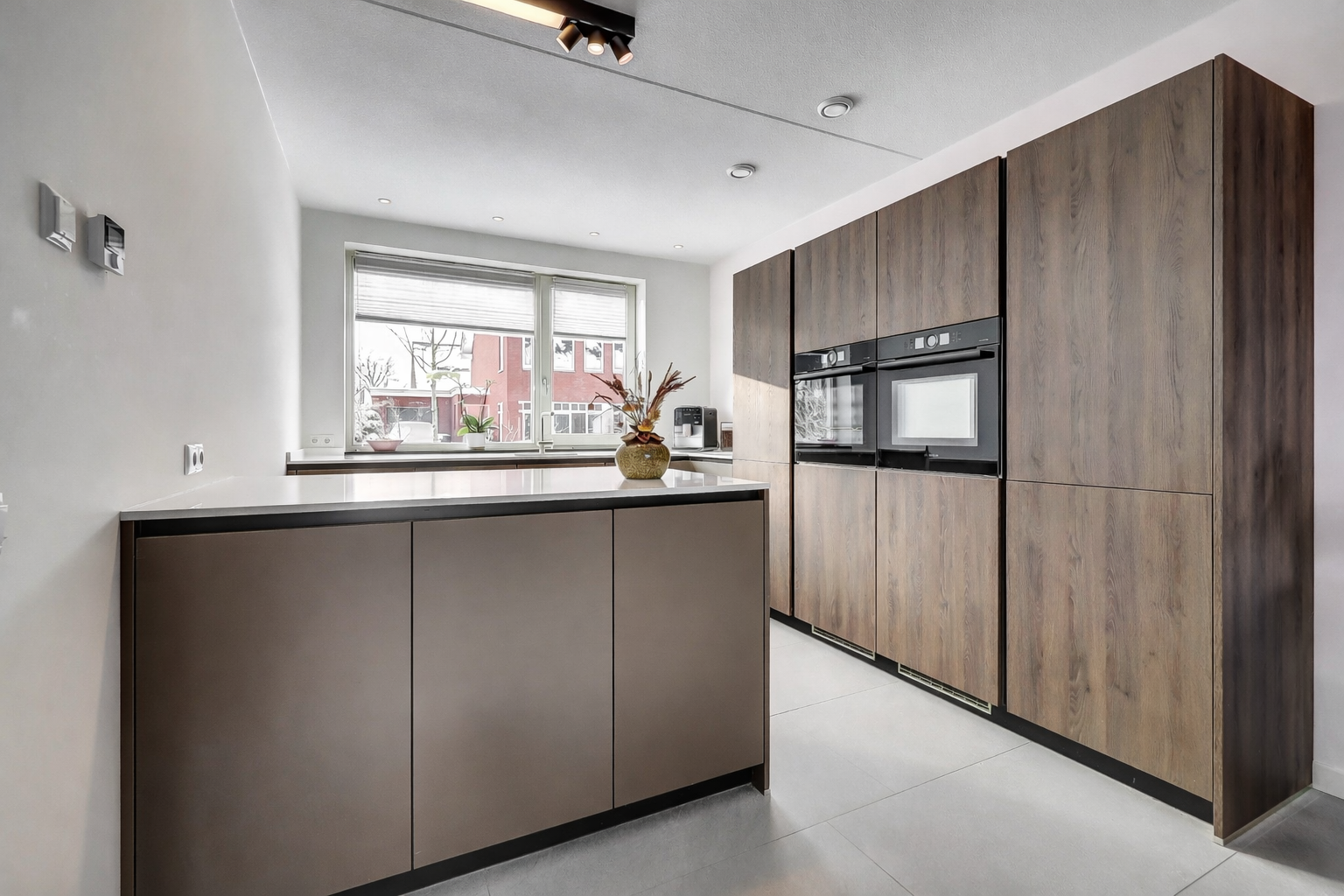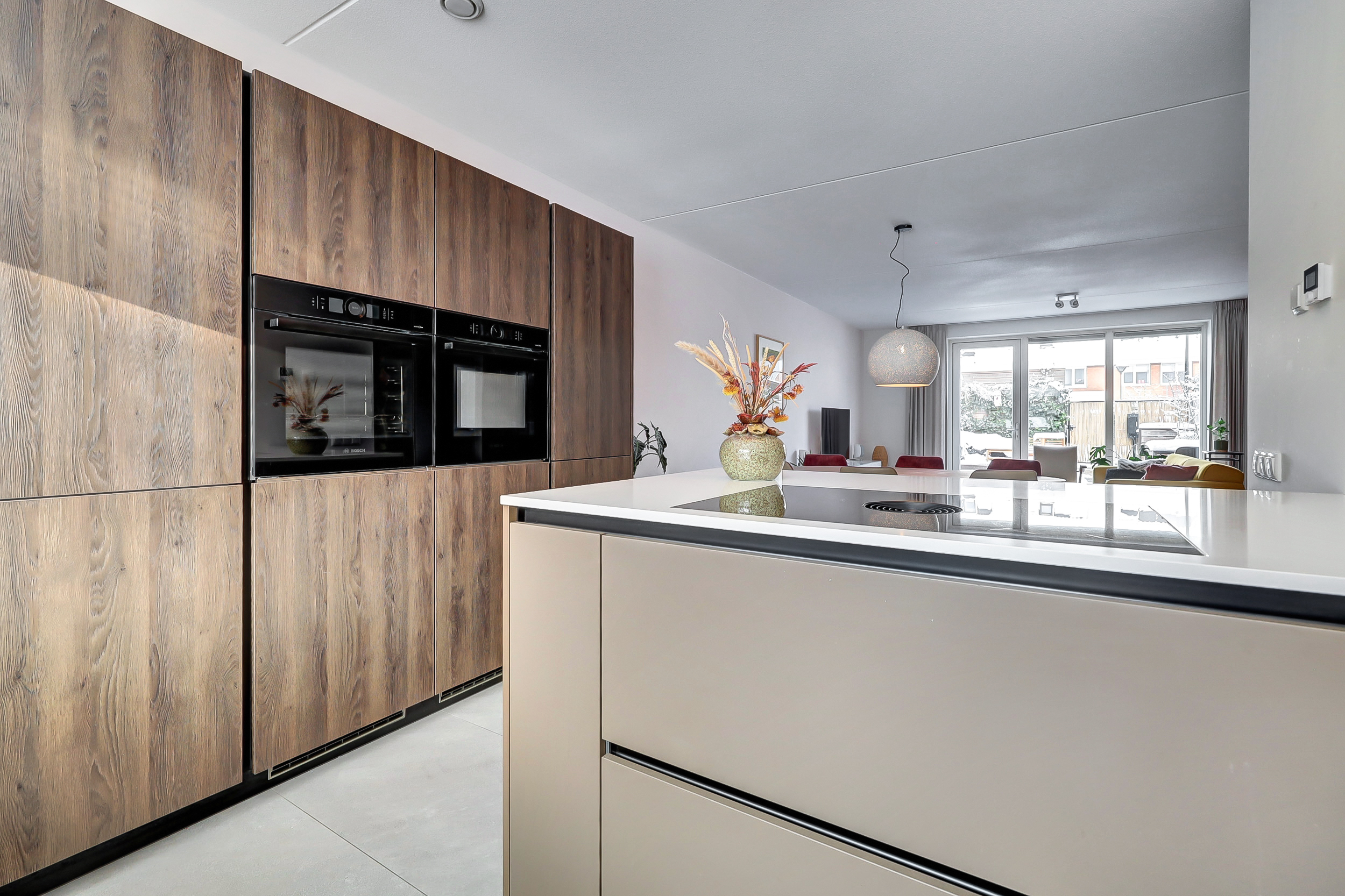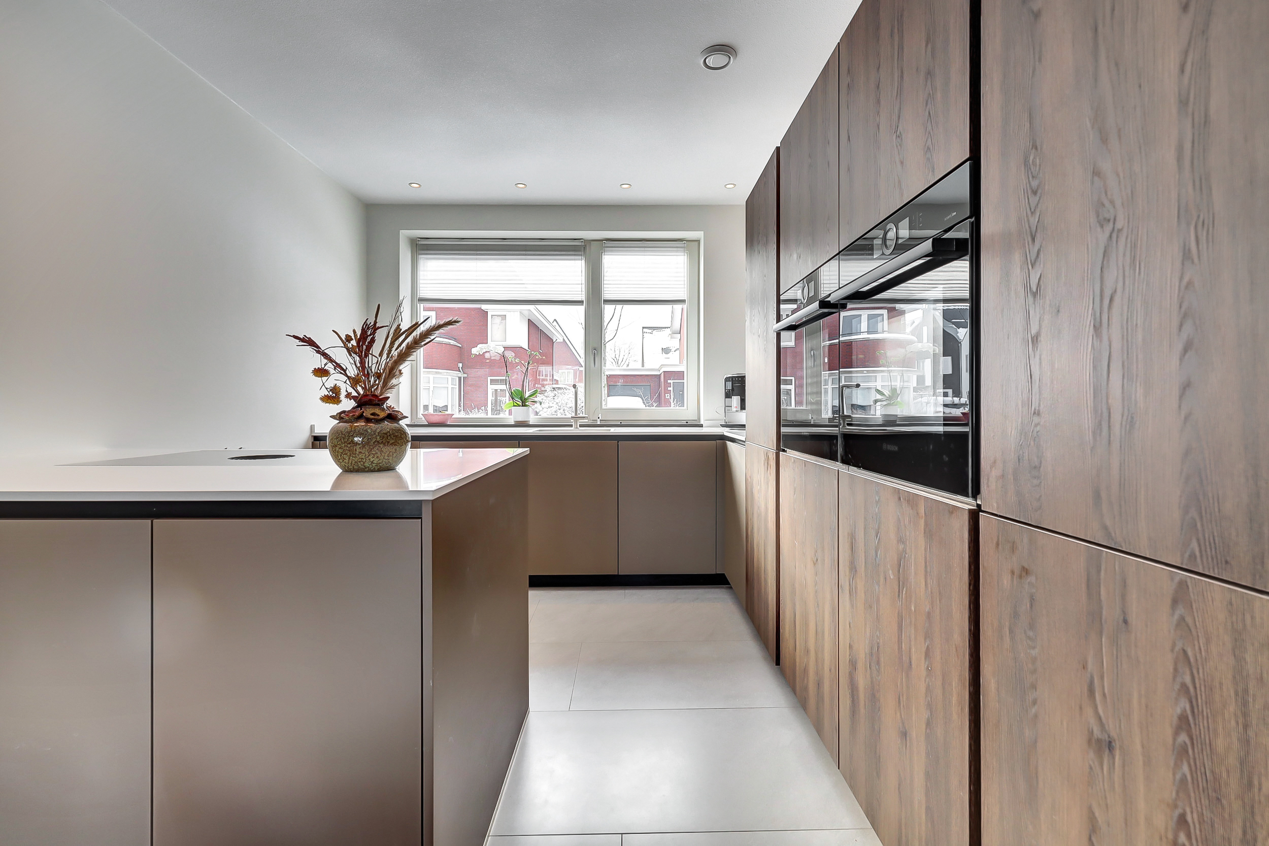 Via de entree kom je in de nette hal met meterkast, moderne toiletruimte en trapopgang. De hal is afgewerkt met een speels tegelpatroon, wat direct zorgt voor een leuke en eigentijdse eerste indruk. De woonkamer en overige ruimtes op de begane grond zijn voorzien van strakke grijze vloertegels. De uitgebouwde woonkamer is tuingericht en beschikt over een prettig ingedeelde, lichte zithoek, waar de extra ruimte van de uitbouw goed tot zijn recht komt. Het eetgedeelte bevindt zich centraal tussen de woonkamer en de keuken en biedt ruimte voor een grote eettafel. De open keuken aan de voorzijde van de woning staat hierbij in een open verbinding met zowel het eetgedeelte als de woonkamer, wat zorgt voor een prettige ruimtelijke beleving en maakt dat koken, eten en wonen naadloos in elkaar overlopen. De keuken heeft een moderne en rustige uitstraling en is uitgevoerd in een combinatie van warme houtlook fronten en strakke, effen fronten in een zachte taupe/grijstint. Het lichte werkblad zorgt voor een mooi contrast en versterkt de eigentijdse uitstraling van de keuken. De keuken sluit perfect aan bij de afwerking van de begane grond en is voorzien van hoogwaardige inbouwapparatuur, waaronder een Bora kookplaat, combi-oven, stoomoven en vaatwasser.