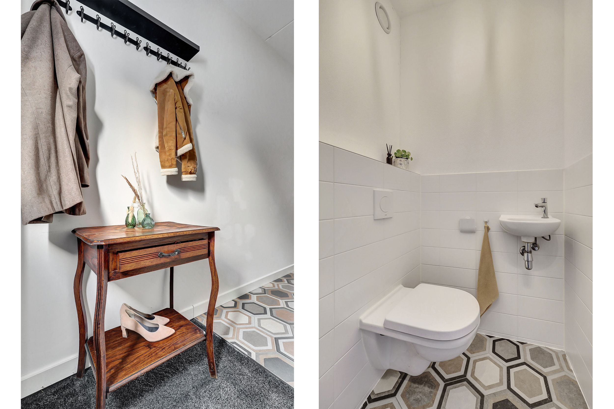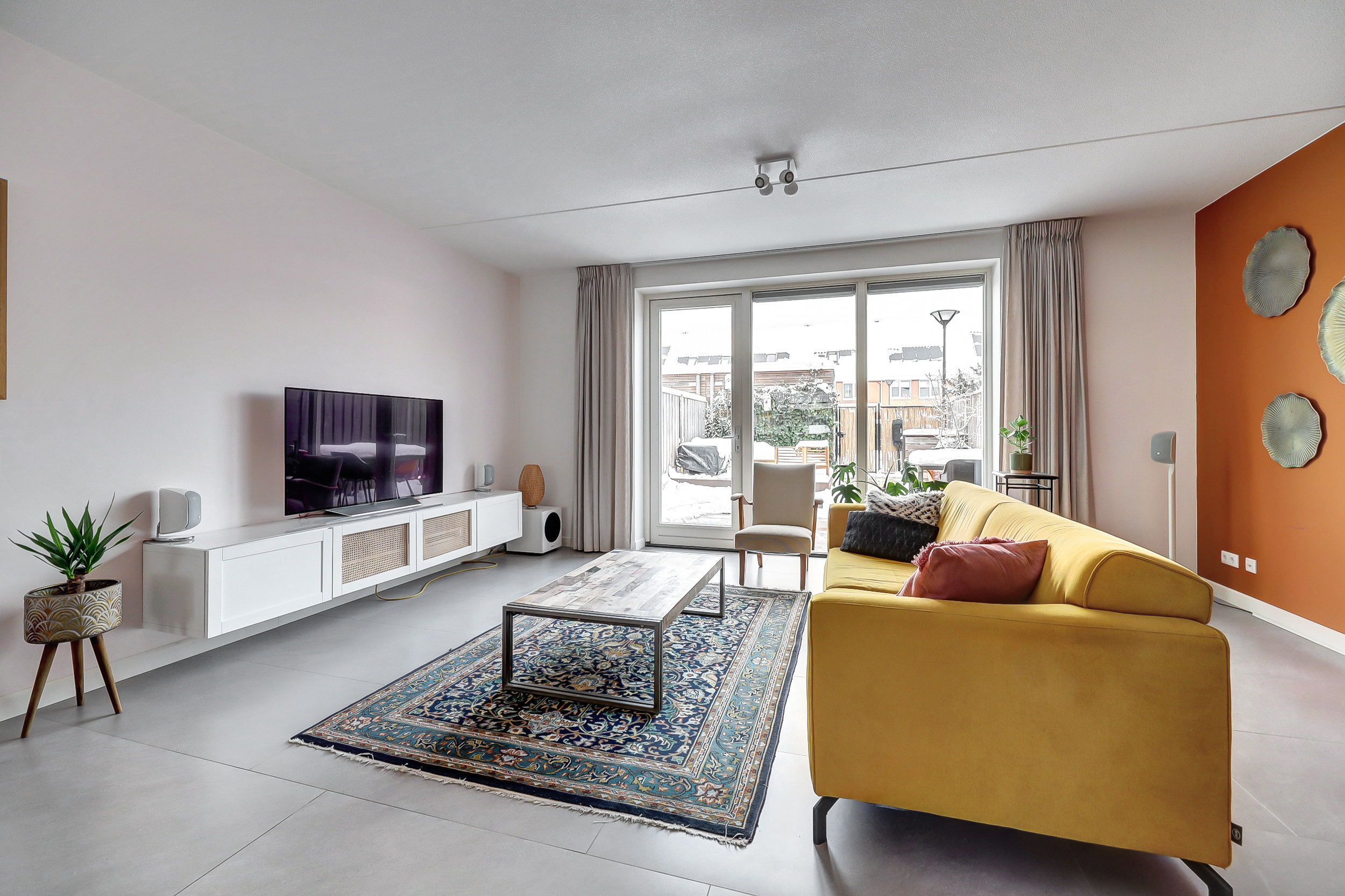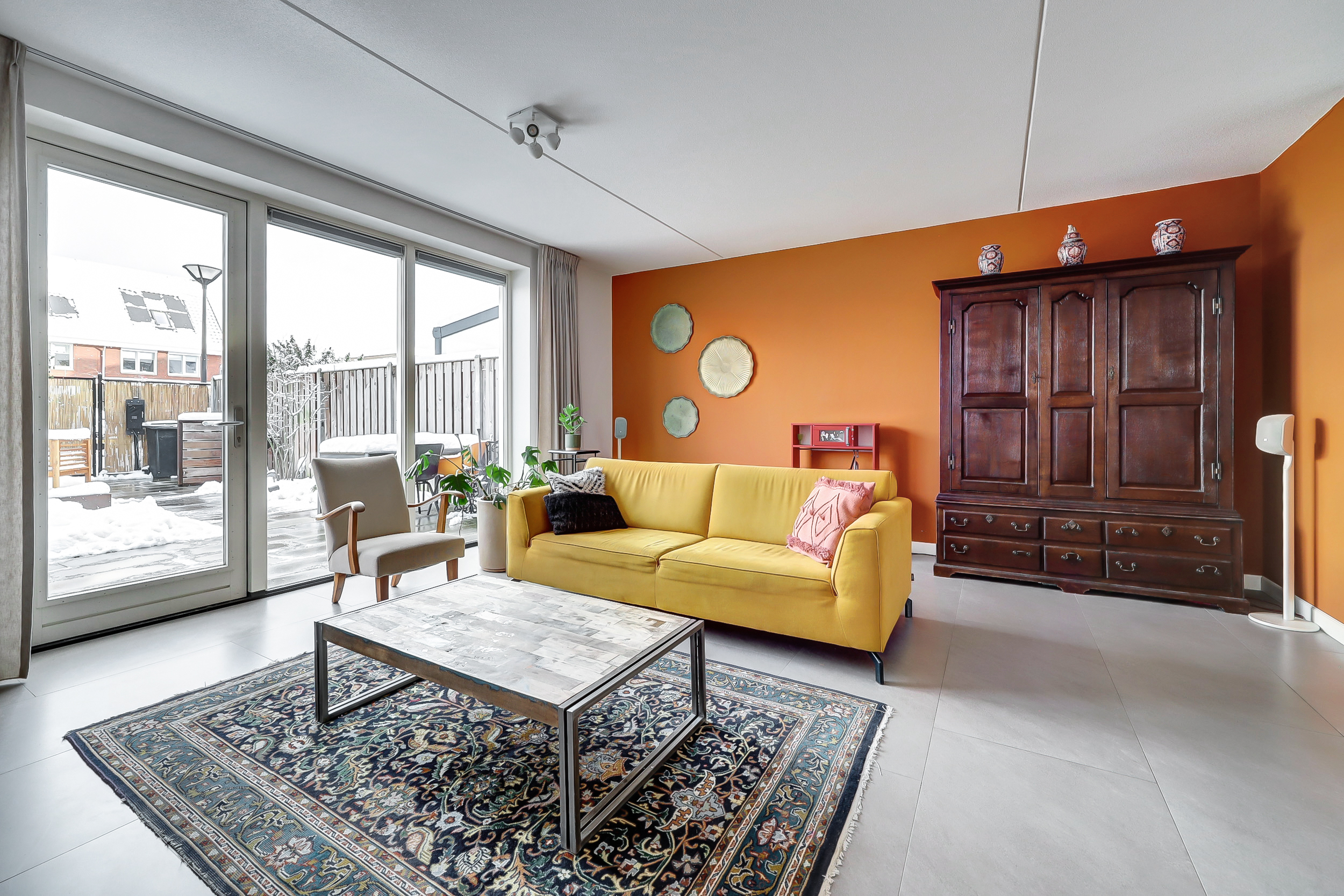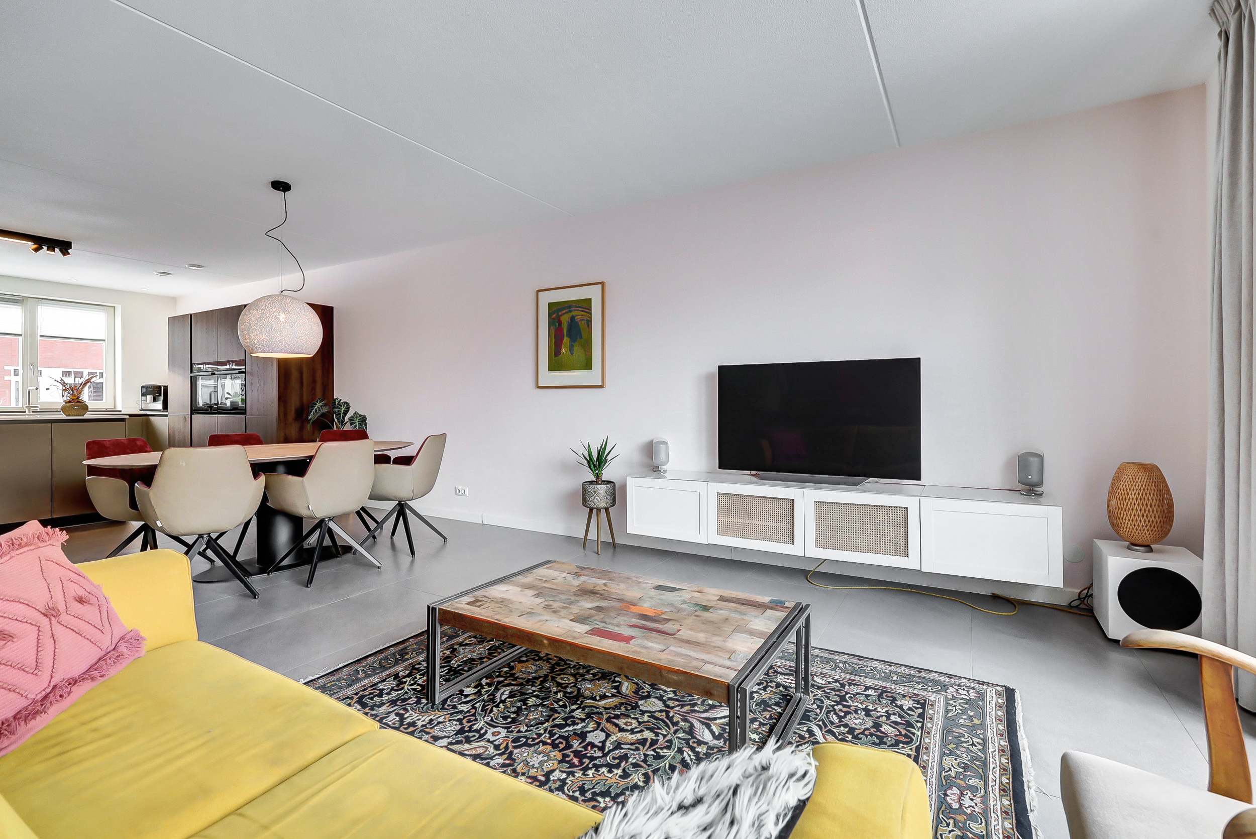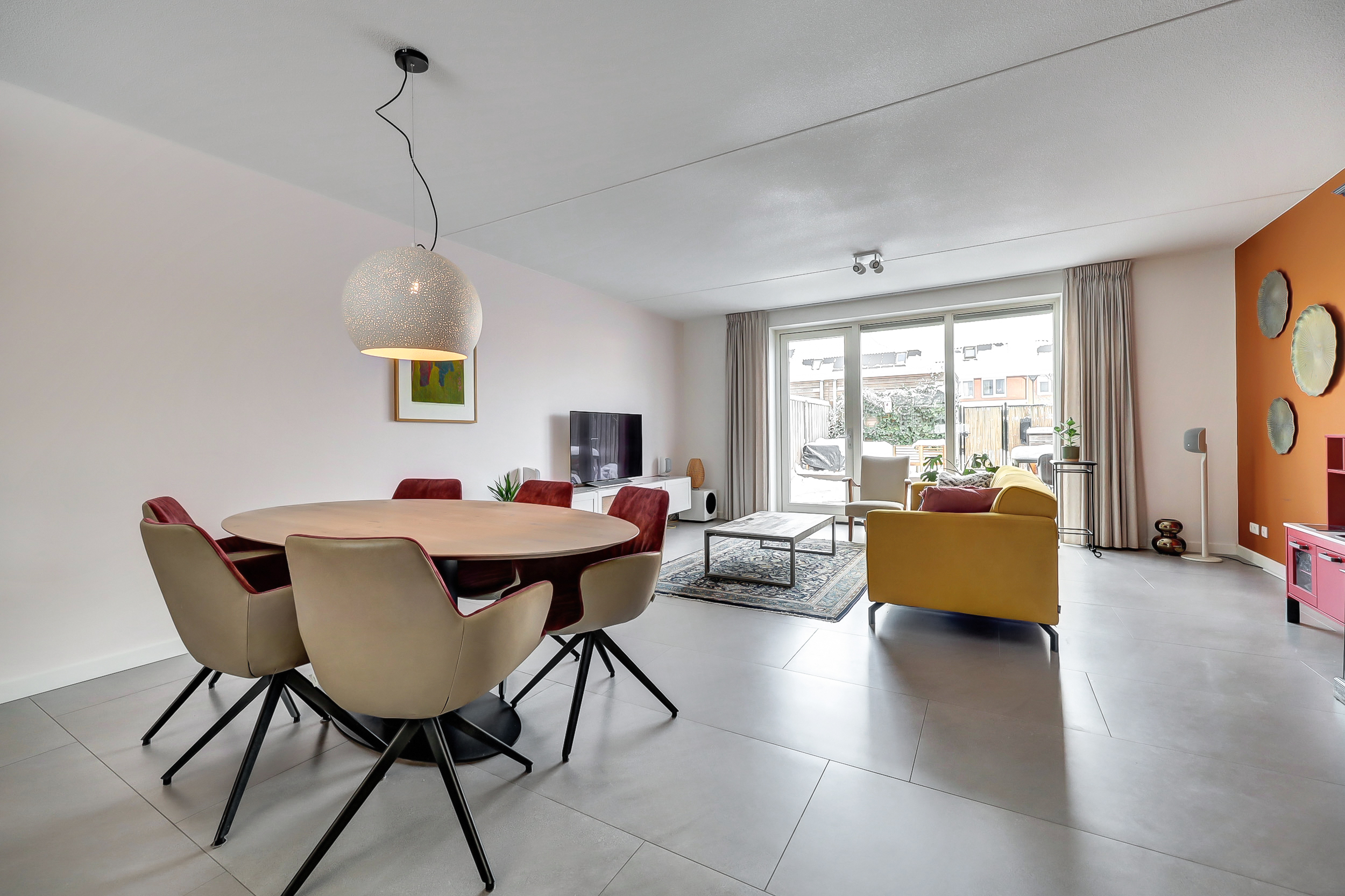 Via de entree kom je in de nette hal met meterkast, moderne toiletruimte en trapopgang. De hal is afgewerkt met een speels tegelpatroon, wat direct zorgt voor een leuke en eigentijdse eerste indruk. De woonkamer en overige ruimtes op de begane grond zijn voorzien van strakke grijze vloertegels. De uitgebouwde woonkamer is tuingericht en beschikt over een prettig ingedeelde, lichte zithoek, waar de extra ruimte van de uitbouw goed tot zijn recht komt. Het eetgedeelte bevindt zich centraal tussen de woonkamer en de keuken en biedt ruimte voor een grote eettafel. De open keuken aan de voorzijde van de woning staat hierbij in een open verbinding met zowel het eetgedeelte als de woonkamer, wat zorgt voor een prettige ruimtelijke beleving en maakt dat koken, eten en wonen naadloos in elkaar overlopen. De keuken heeft een moderne en rustige uitstraling en is uitgevoerd in een combinatie van warme houtlook fronten en strakke, effen fronten in een zachte taupe/grijstint. Het lichte werkblad zorgt voor een mooi contrast en versterkt de eigentijdse uitstraling van de keuken. De keuken sluit perfect aan bij de afwerking van de begane grond en is voorzien van hoogwaardige inbouwapparatuur, waaronder een Bora kookplaat, combi-oven, stoomoven en vaatwasser.