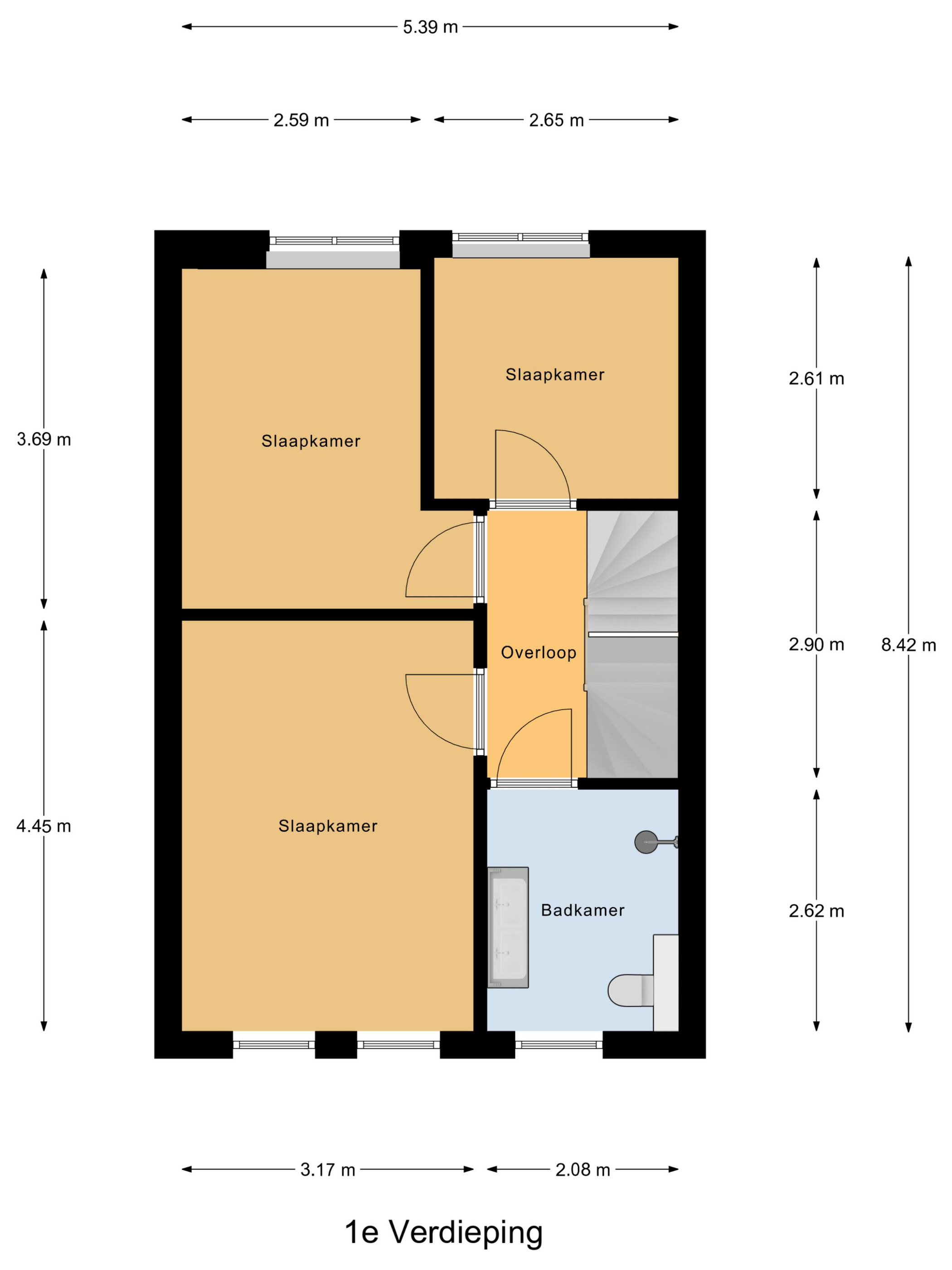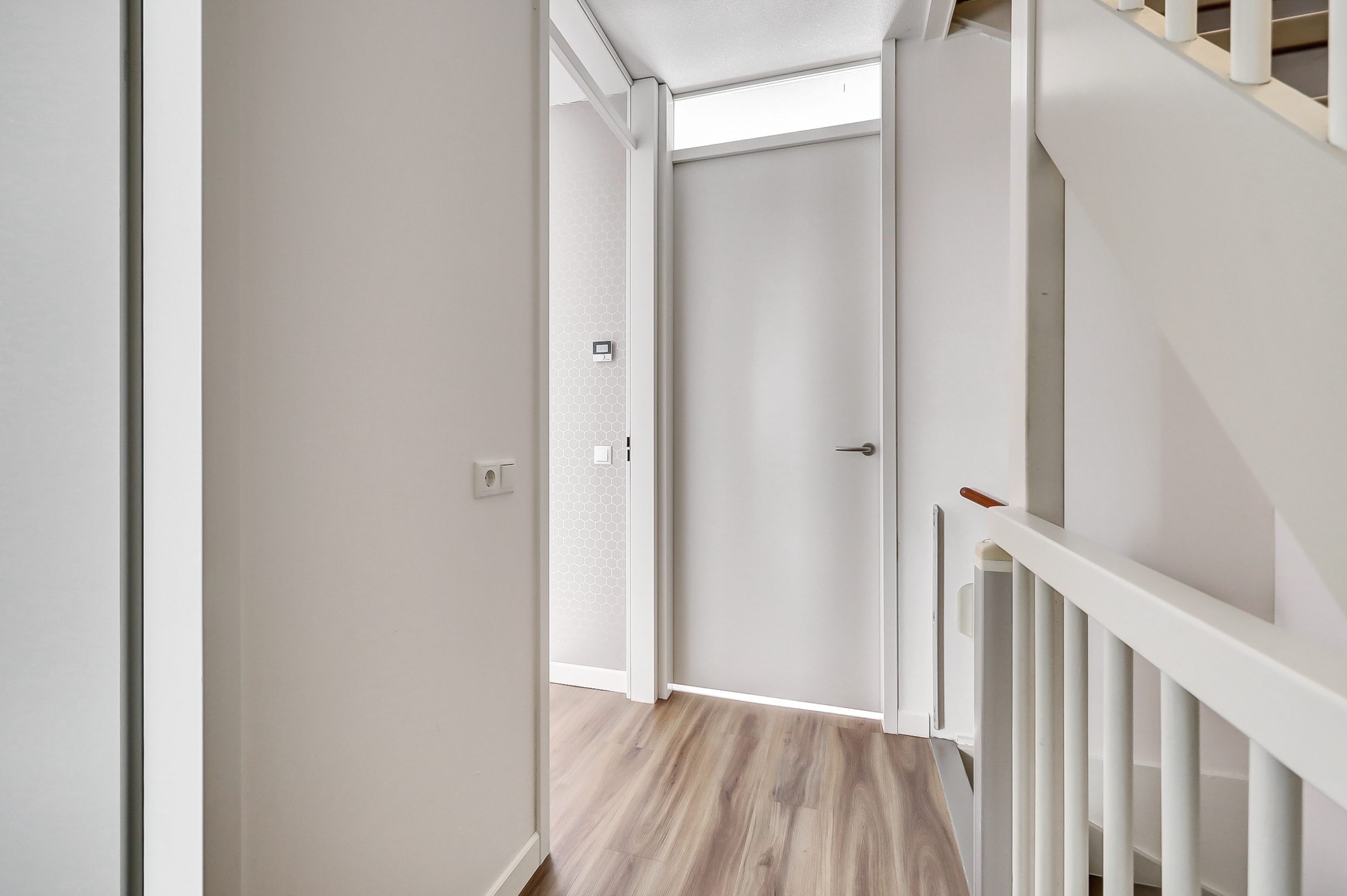 Op de eerste verdieping bevinden zich drie slaapkamers, allen voorzien van een nette pvc-vloer. De hoofdslaapkamer ligt aan de voorzijde van de woning; de overige kamers zijn uitstekend geschikt als kinder-, werk- of logeerkamer.