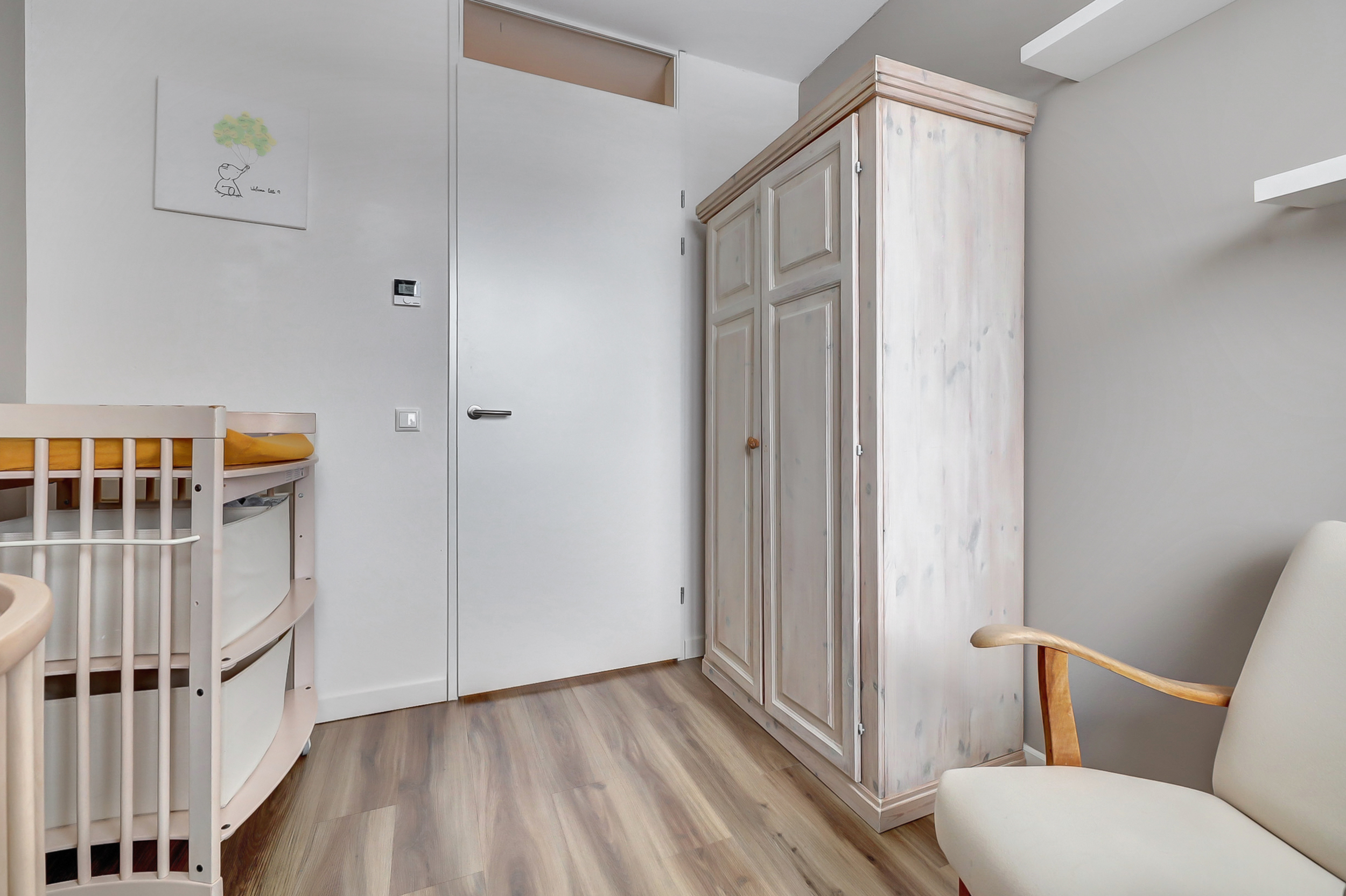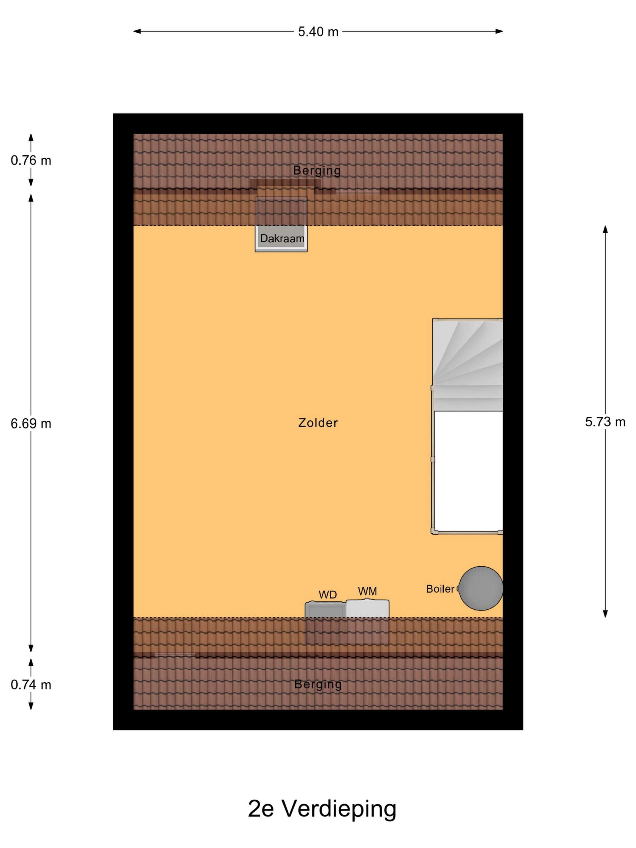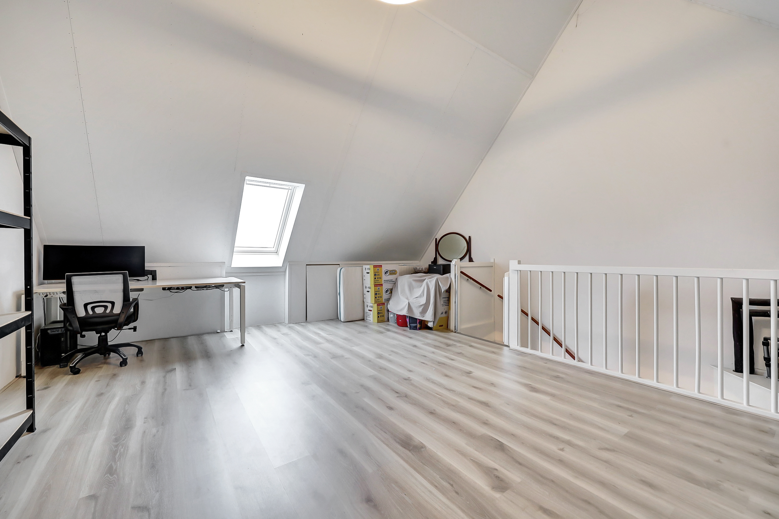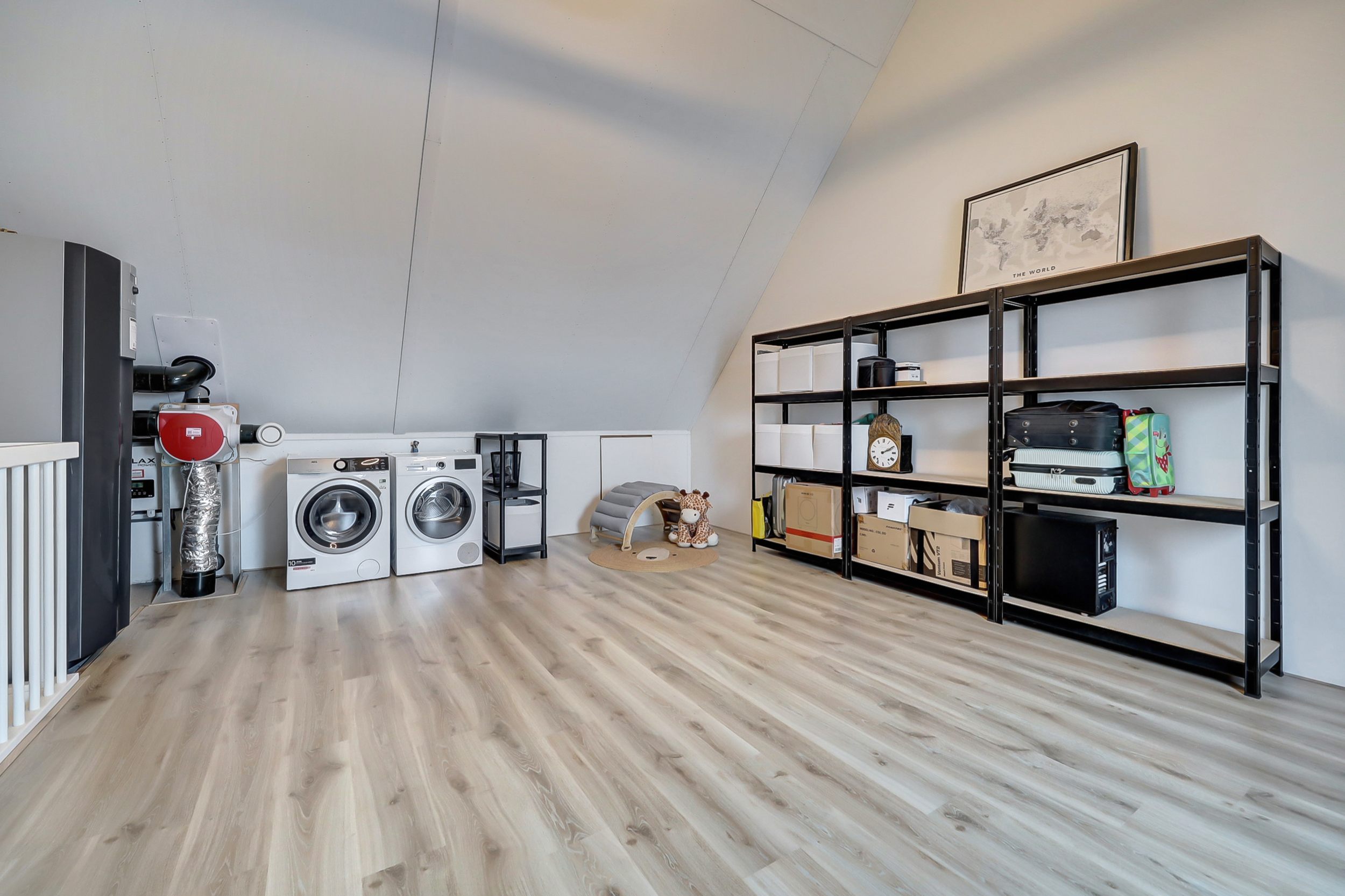 De tweede verdieping is bereikbaar via een vaste trap en beschikt over een prettige nokhoogte, wat zorgt voor een ruimtelijk gevoel en maakt dat deze verdieping geschikt is als extra slaapkamer of werkruimte. Daarnaast bevinden zich hier de wasmachine- en drogeraansluitingen en de installatie voor de bodemwarmtepomp met waterboiler.