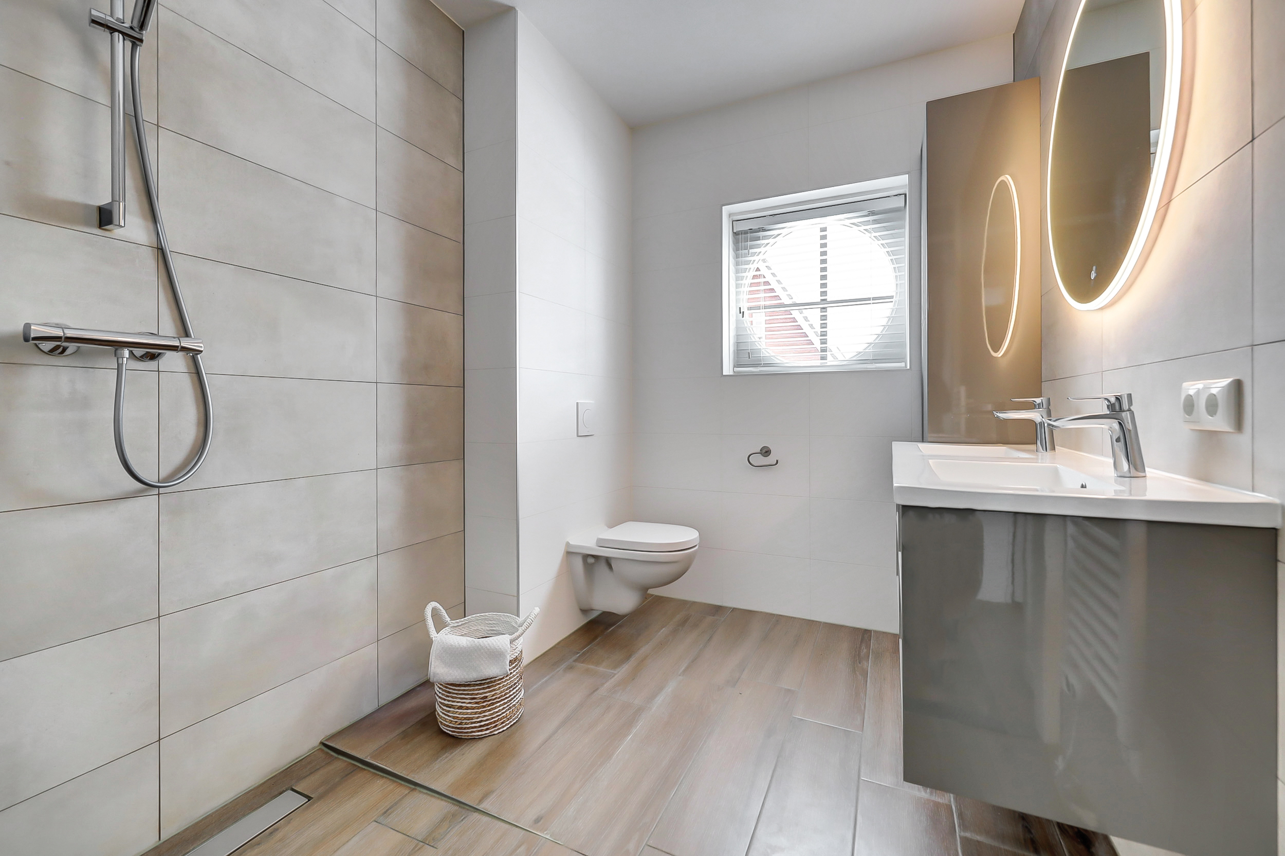 De moderne badkamer is compleet uitgevoerd met een ruime inloopdouche, dubbele wastafel met meubel, spiegel en toilet. Het raam zorgt voor daglicht en natuurlijke ventilatie.