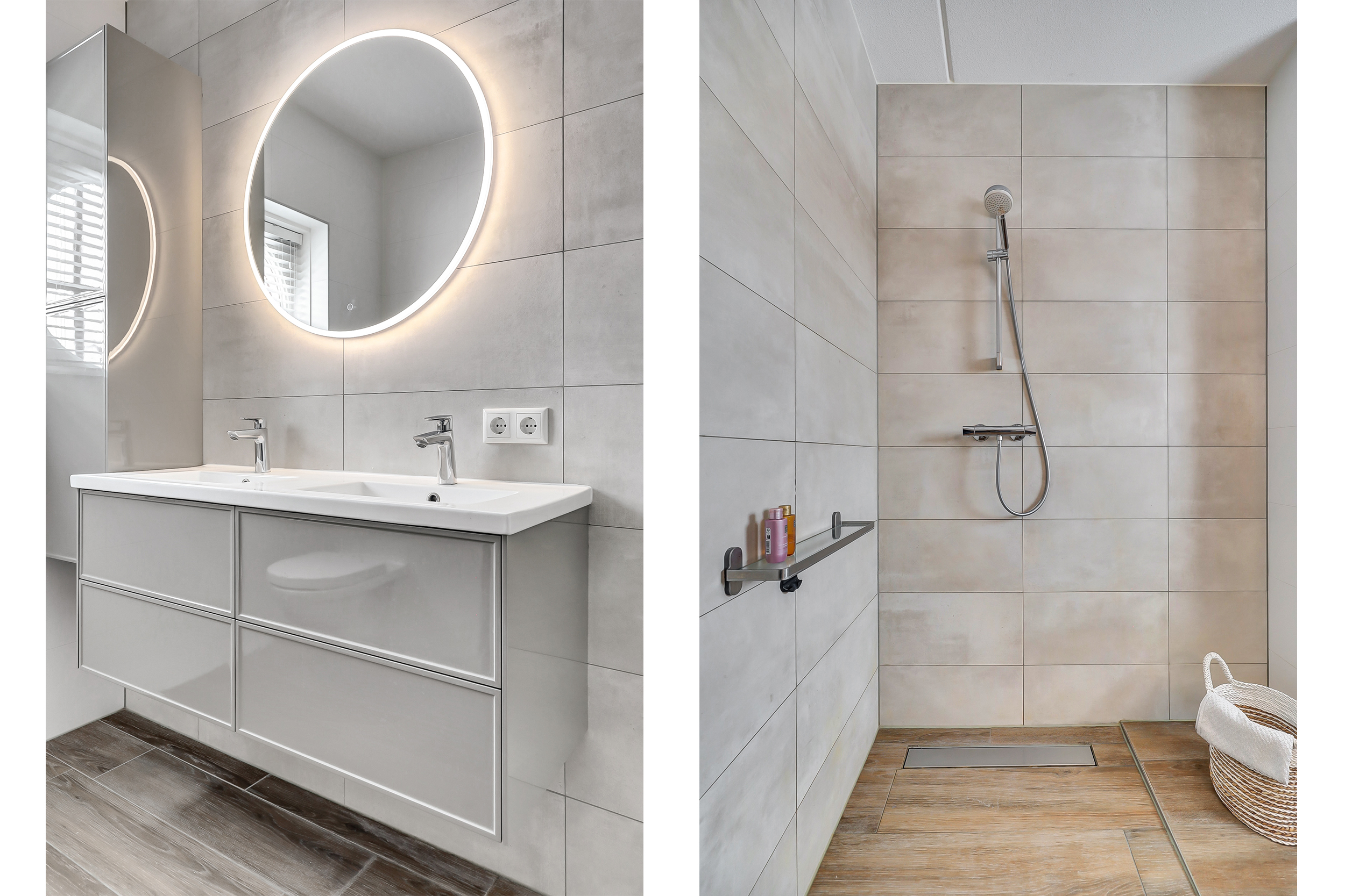 - Toilet, dubbele wastafel, wastafelmeubel en inloopdouche