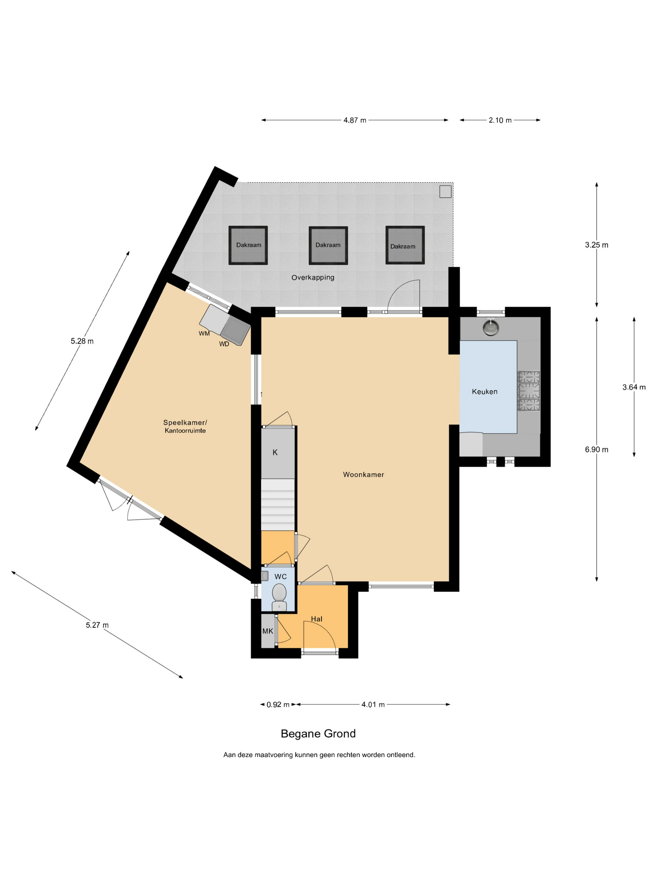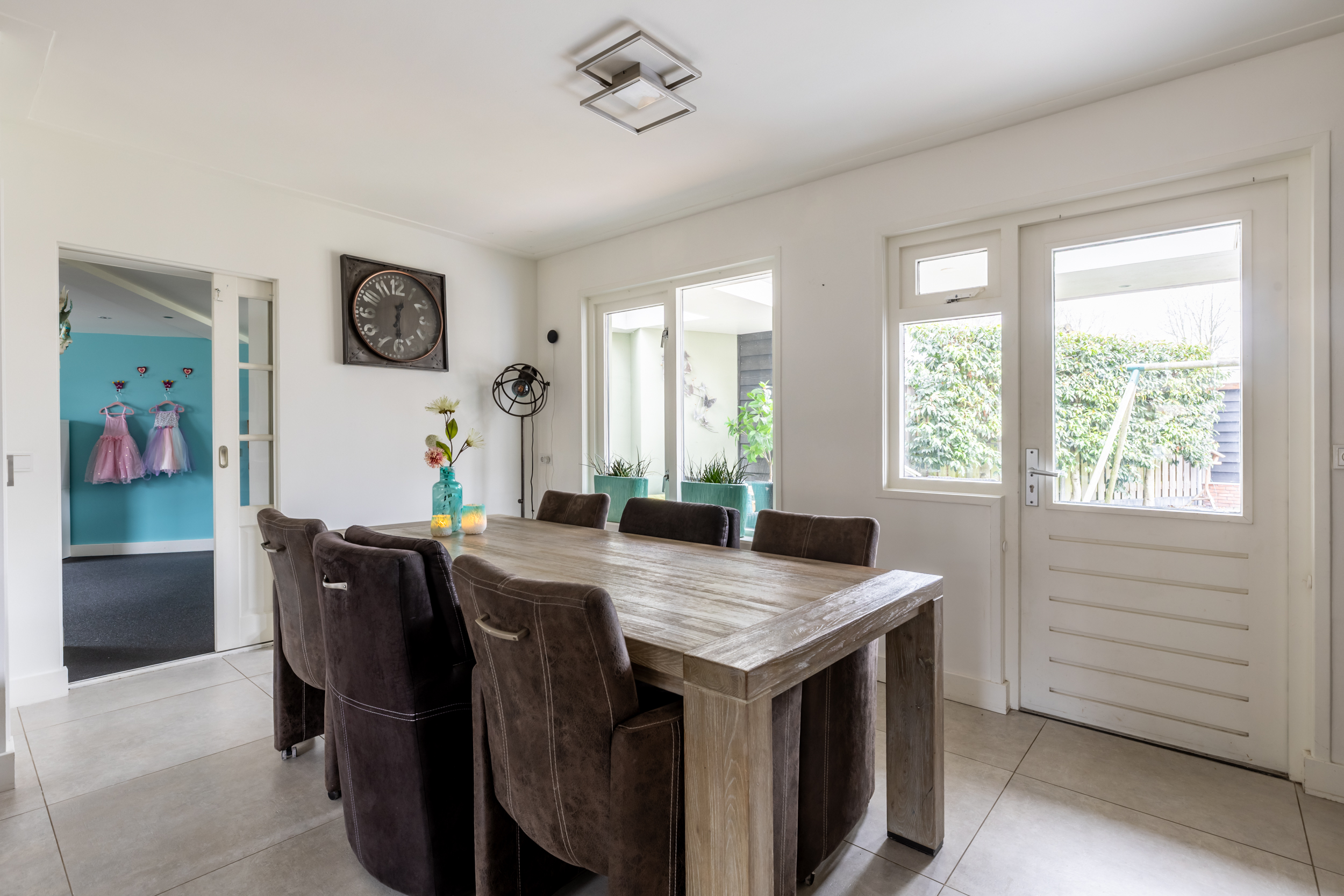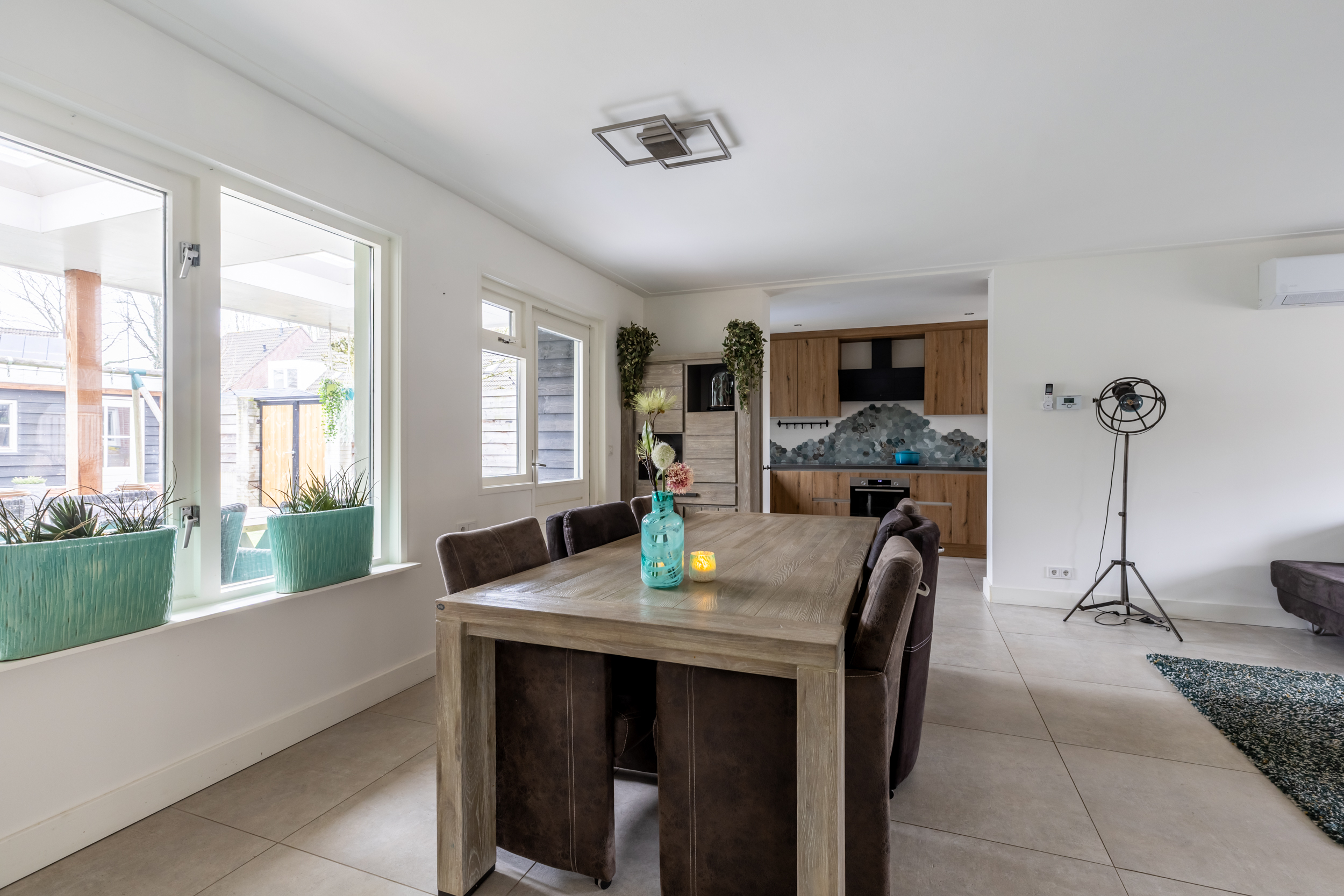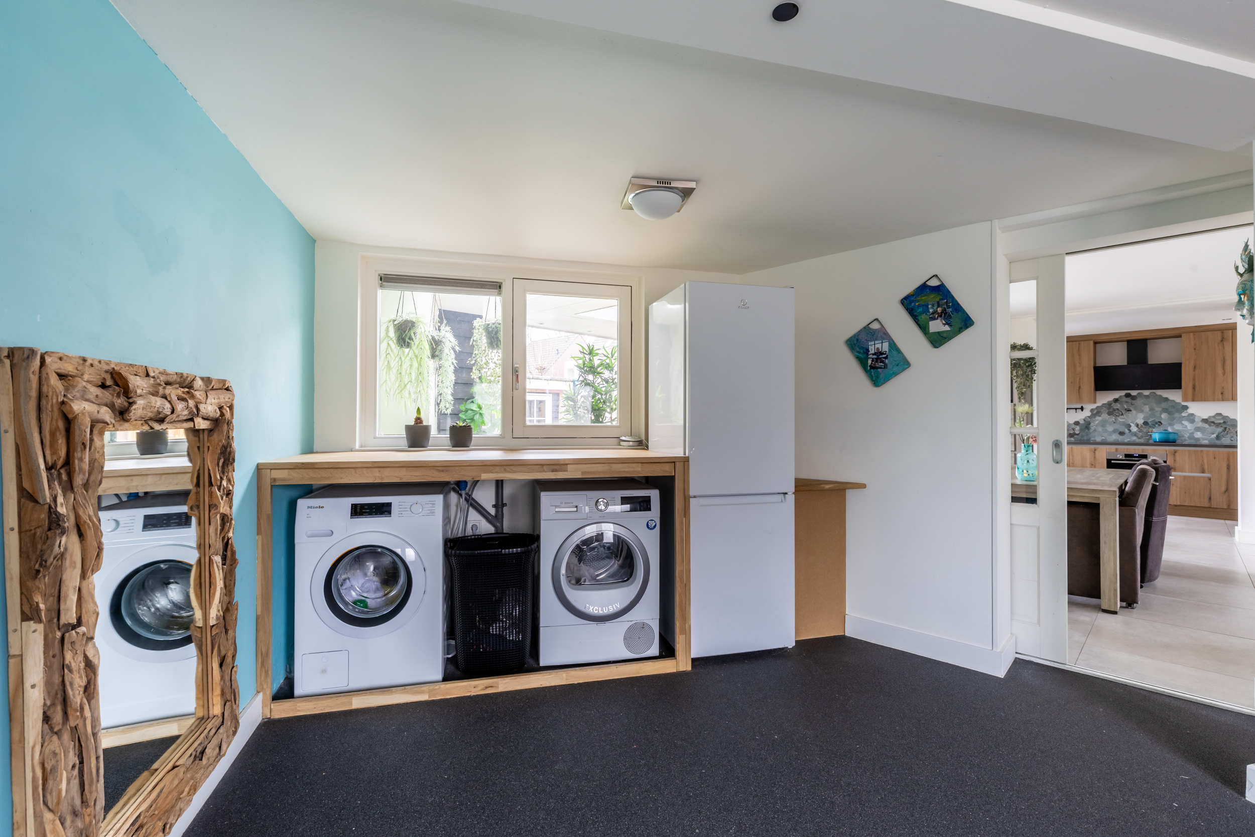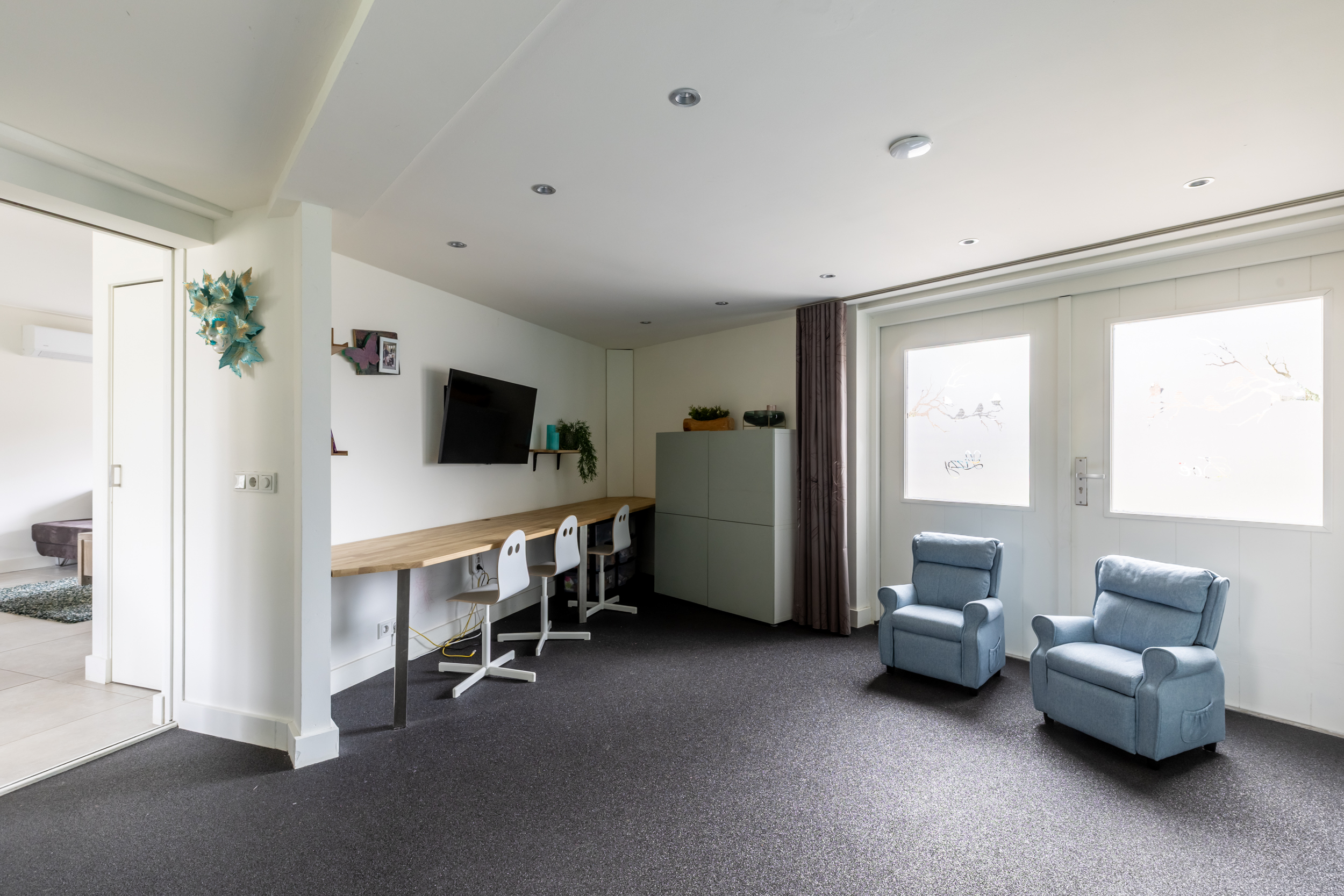 De woonkamer is een fijne, ruime leefruimte met comfortabele vloerverwarming en een prettige lichtinval. De indeling biedt volop mogelijkheden voor een gezellige zit- en eethoek. Vanuit de woonkamer is er direct toegang tot de overkapping en de tuin, waardoor binnen en buiten op een natuurlijke manier met elkaar verbonden zijn. Aansluitend bevindt zich een inpandige ruimte die multifunctioneel inzetbaar is. Deze ruimte is uitstekend geschikt als kantoor of praktijkruimte aan huis en beschikt over houten toegangsdeuren naar de oprit, wat zorgt voor extra gebruiksgemak en een eigen entree. In deze ruimte is ook de aansluiting aanwezig voor de wasmachine en de droger.