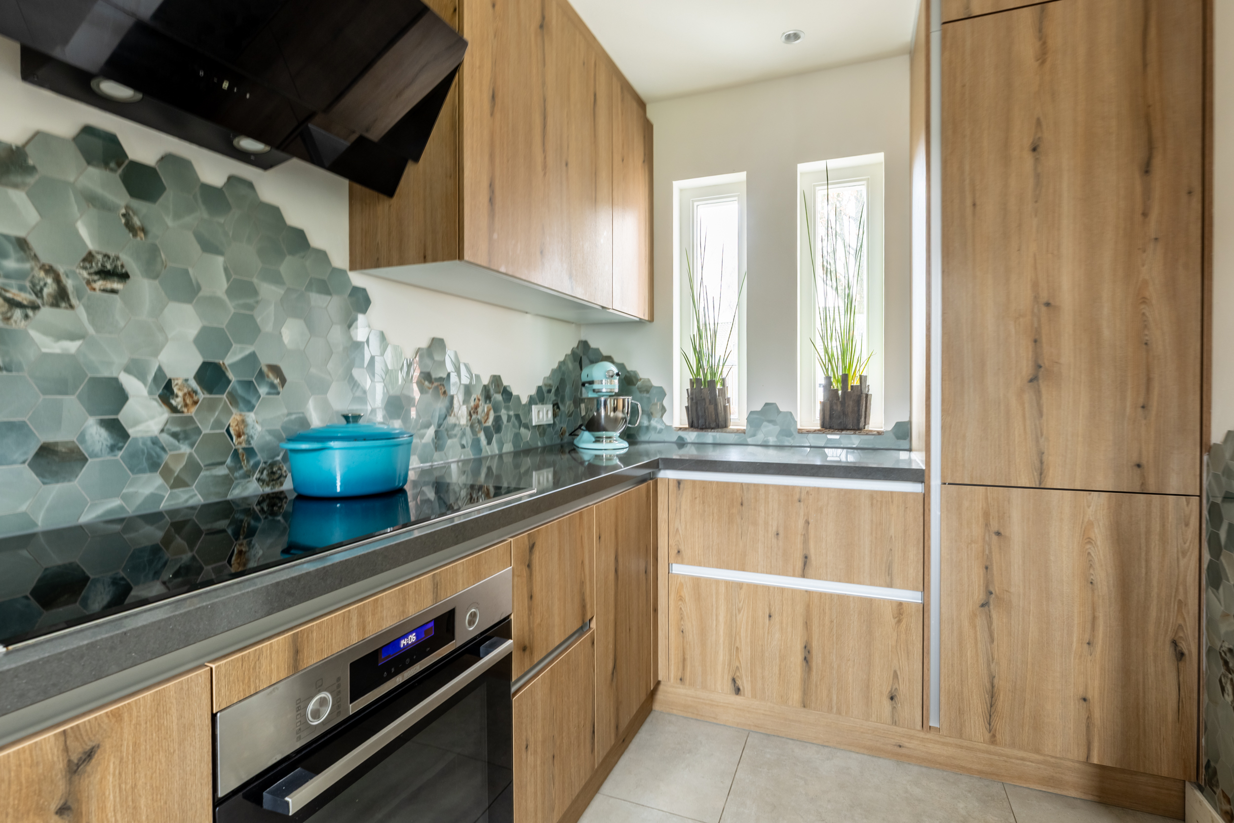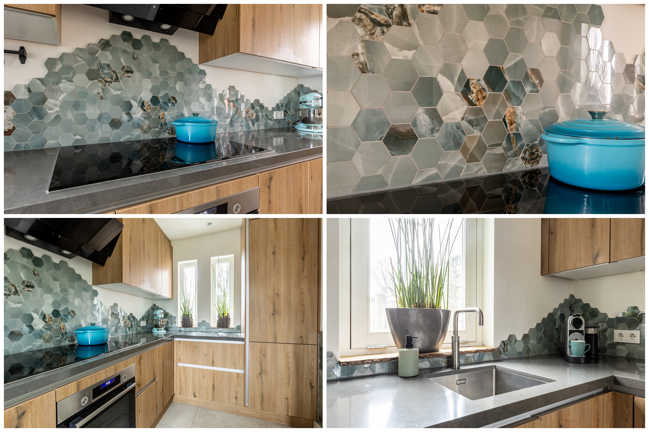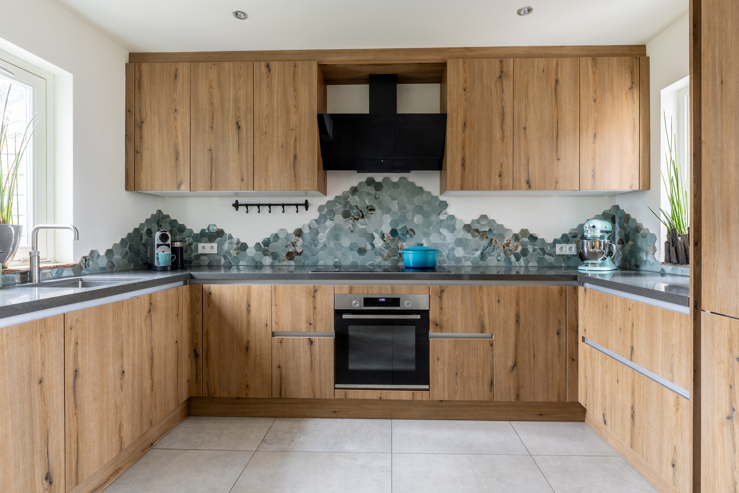 De halfopen keuken is in 2024 volledig vernieuwd en uitgevoerd in een stijlvolle houtlook met veel opbergruimte. De keuken is compleet en modern ingericht met een elektrische kookplaat, afzuigkap, oven, koel-vriescombinatie, vaatwasser en een Quooker voor direct kokend water. Het geheel vormt een praktische en luxe keuken die perfect aansluit bij het woongedeelte en uitnodigt tot dagelijks gebruik en gezellig samen koken.