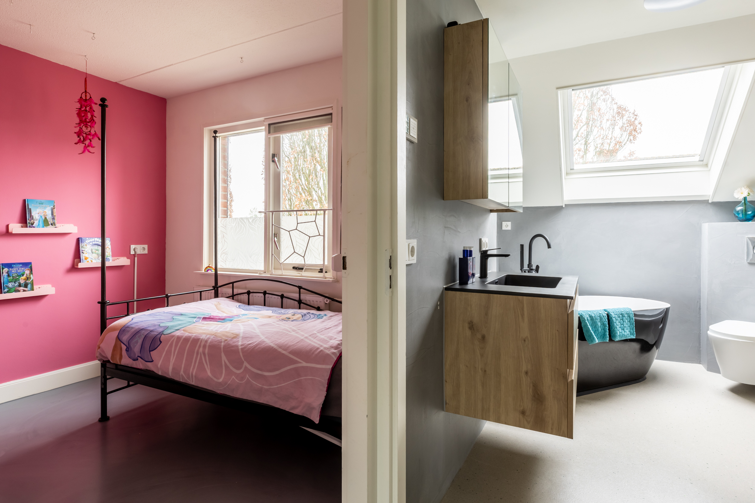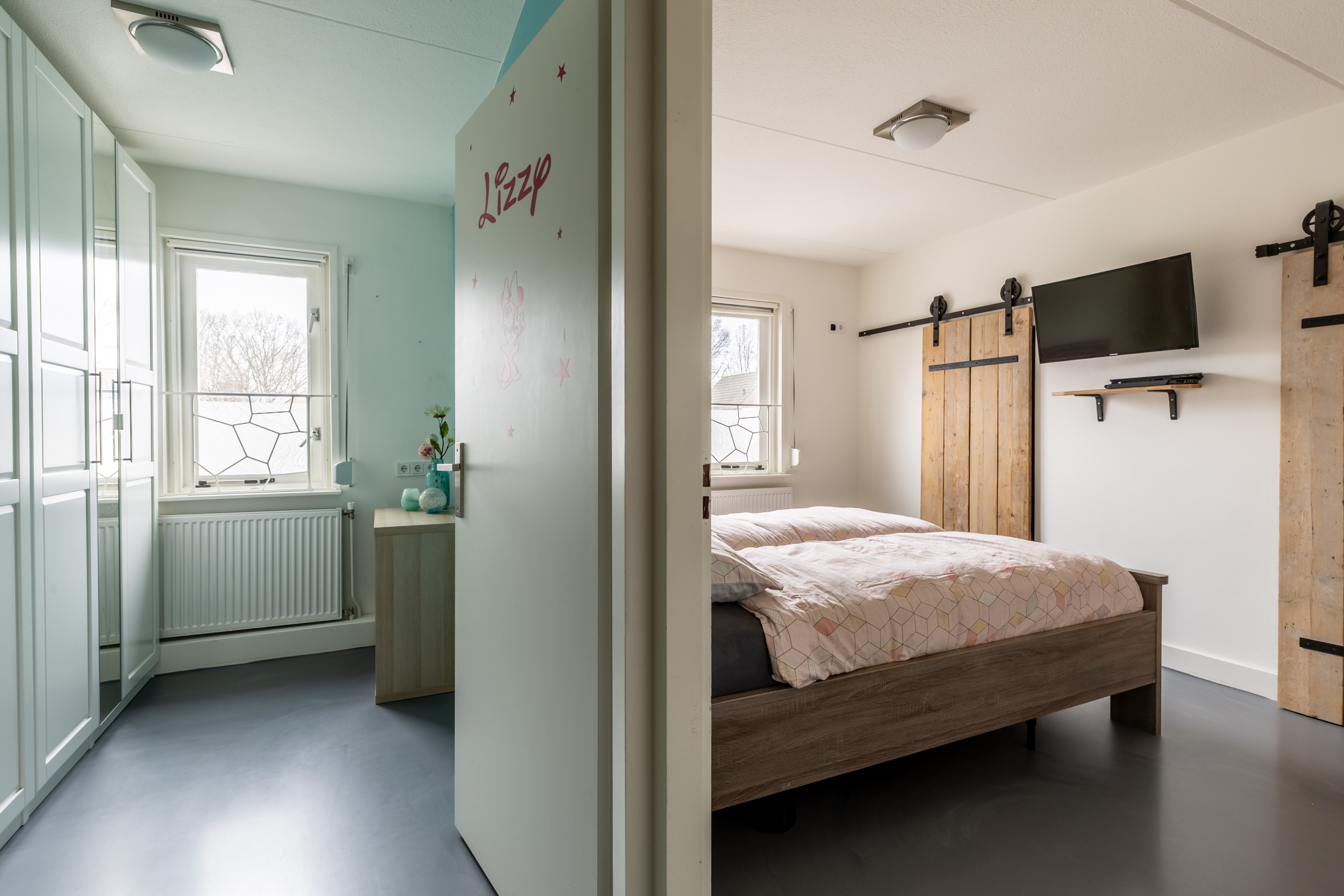 Op de eerste verdieping komt u uit op de overloop, waaraan drie slaapkamers zijn gelegen. Alle slaapkamers zijn verzorgd afgewerkt met een fraaie gietvloer en strak gestucte wanden, wat zorgt voor een moderne en rustige uitstraling. De grootste slaapkamer is extra comfortabel uitgevoerd en beschikt over twee ruime inloopkasten met industriële schuifdeuren, een stoer en praktisch detail dat perfect past bij de stijl van de woning.