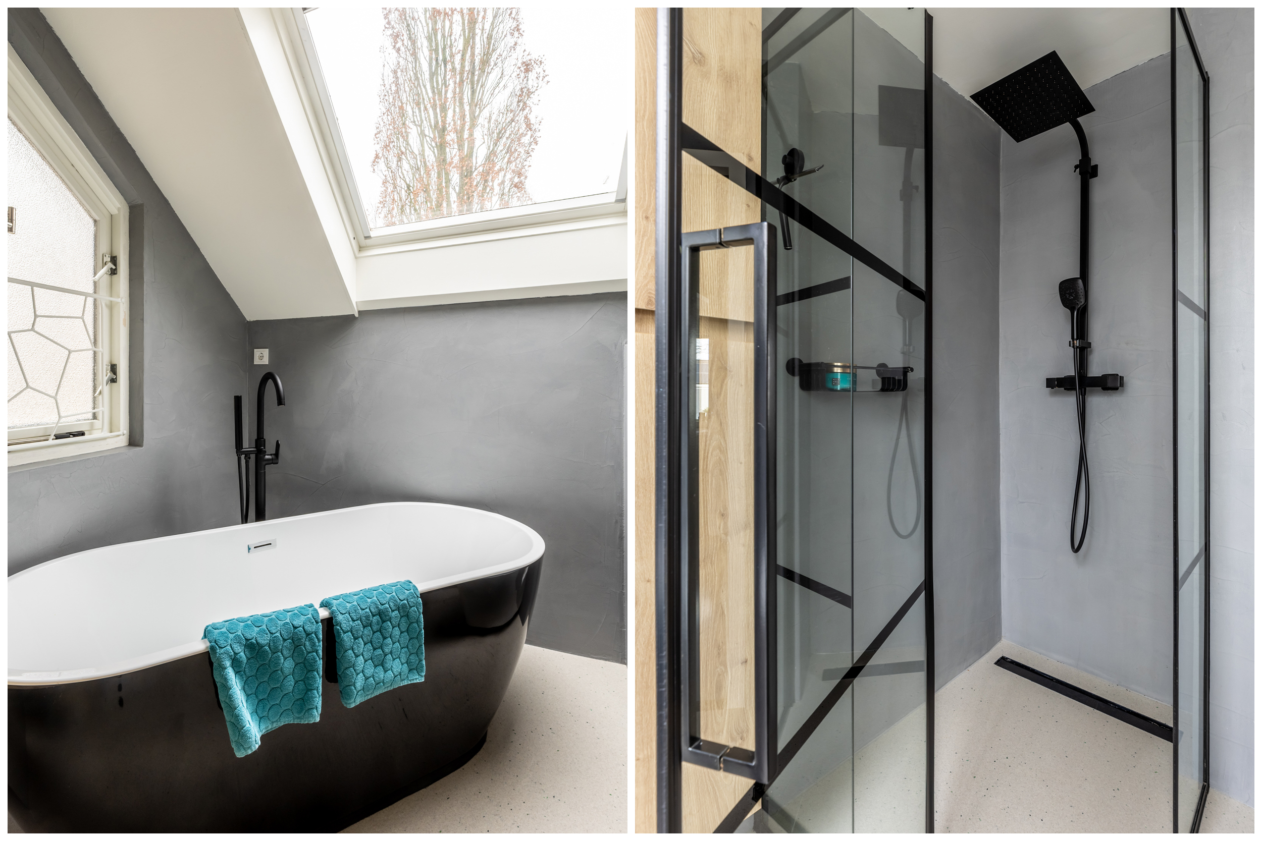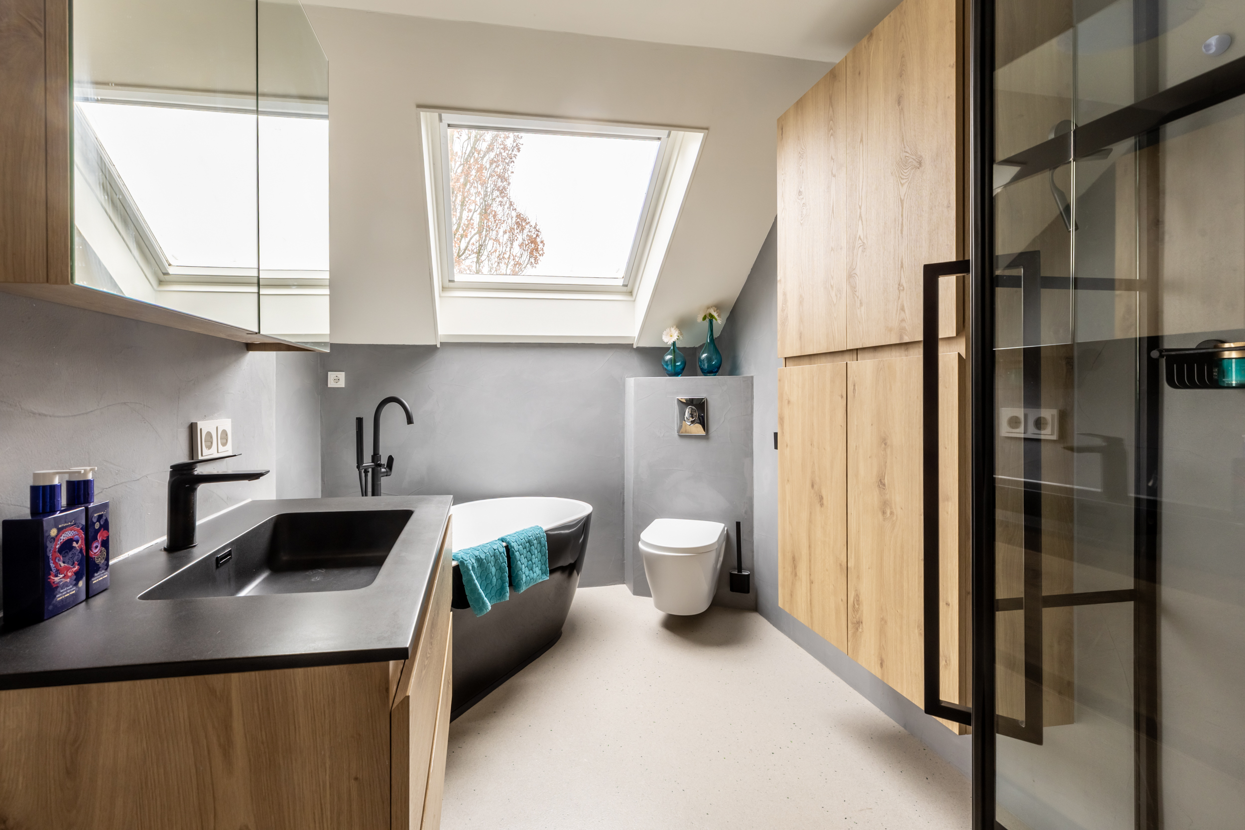 De badkamer is in juni 2023 volledig vernieuwd en uitgevoerd in een eigentijdse, luxe stijl. De ruimte is voorzien van een royale inloopdouche met zwarte accenten, een modern wastafelmeubel met geïntegreerde wastafel en bijpassende spiegelkasten, een hangend toilet en een vrijstaand ligbad. De afwerking is strak en modern, met een lichte vloer en wanden in een rustige grijstint, gecombineerd met warme houtaccenten in het meubelwerk. De kleuren zorgen samen voor een stijlvolle en serene badkamer waarin comfort en design mooi samenkomen.