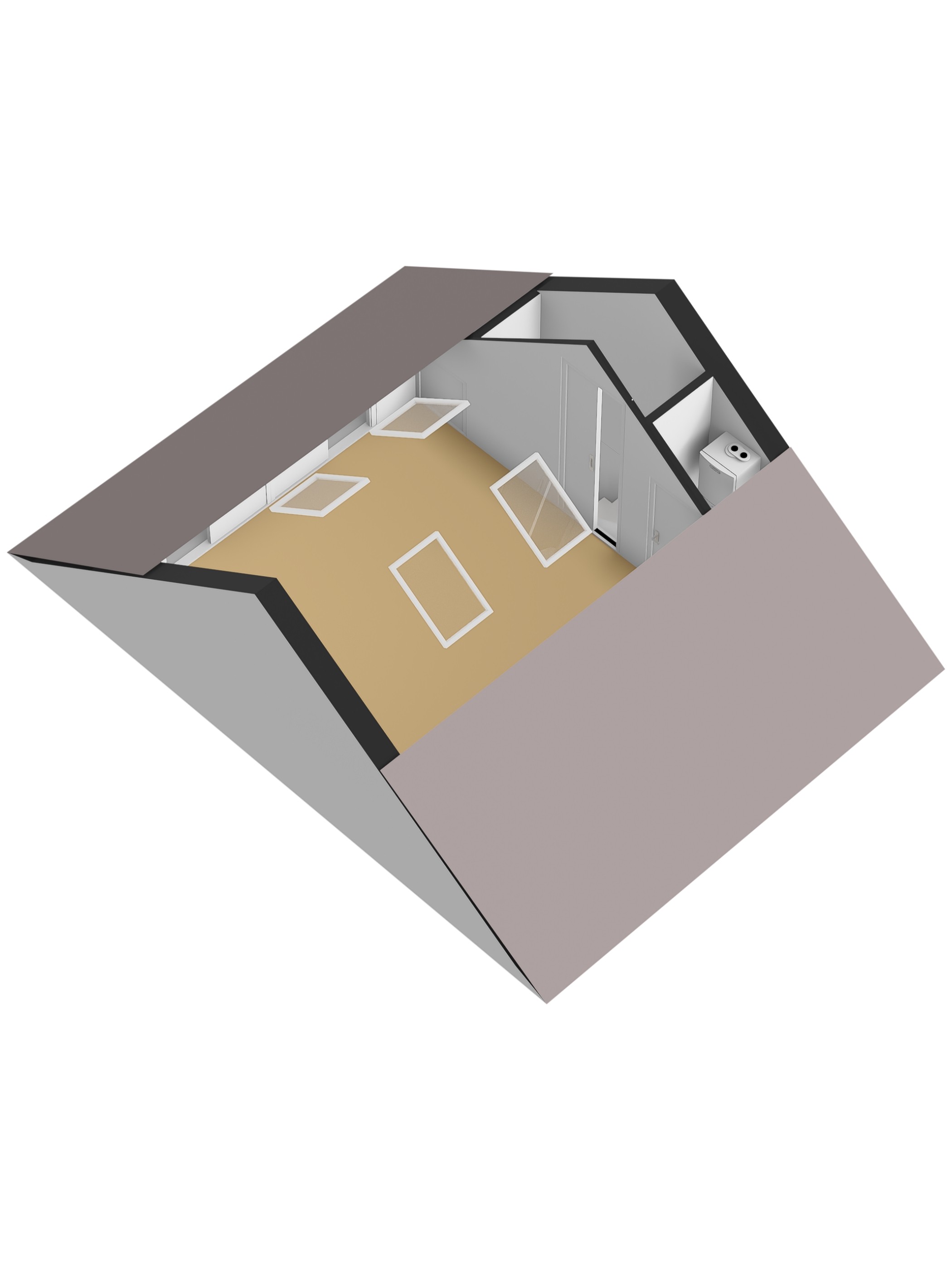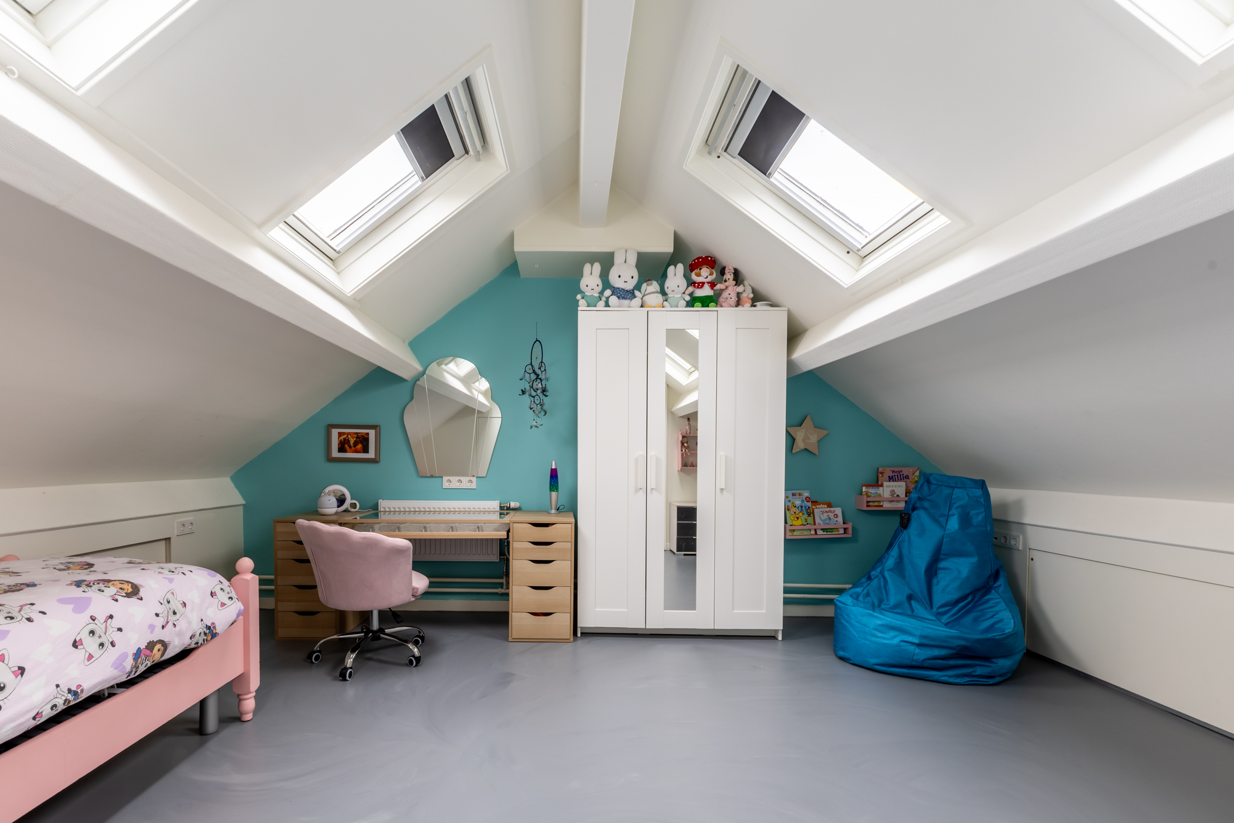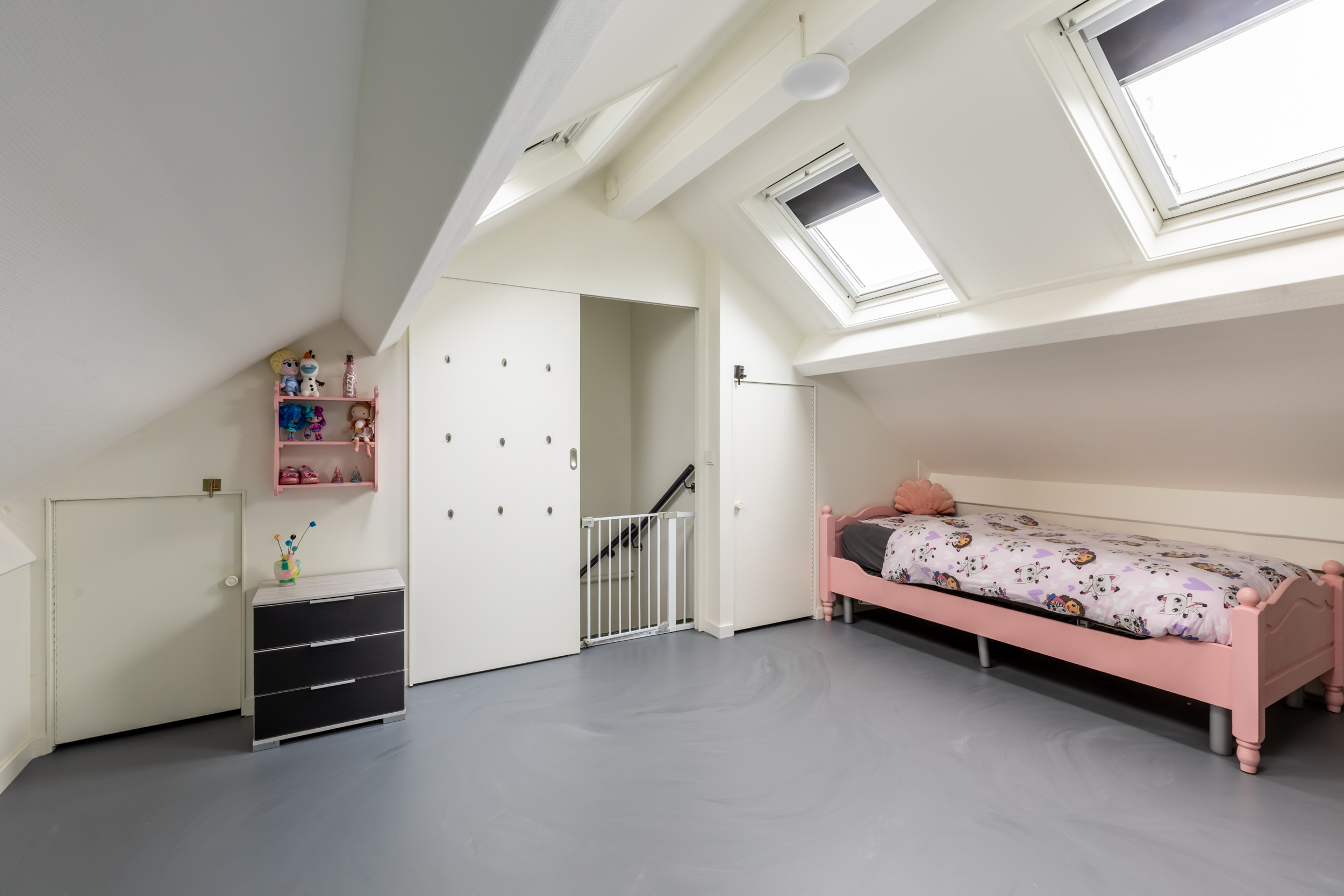 Via een vaste trap bereikt u de bovenste verdieping, waar zich een royale 4e slaapkamer bevindt. Dankzij maar liefst vier dakvensters wordt de ruimte rijkelijk voorzien van daglicht, wat zorgt voor een lichte en open sfeer. De kamer is netjes en verzorgd afgewerkt met gietvloer en strakke wanden, waardoor deze direct gebruiksklaar is. Achter de knieschotten is volop praktische bergruimte aanwezig, ideaal voor het netjes opbergen van seizoensspullen. In een vaste kast is de opstelling van de cv-ketel (hybride 2023) geplaatst, keurig uit het zicht en functioneel geïntegreerd in de ruimte.