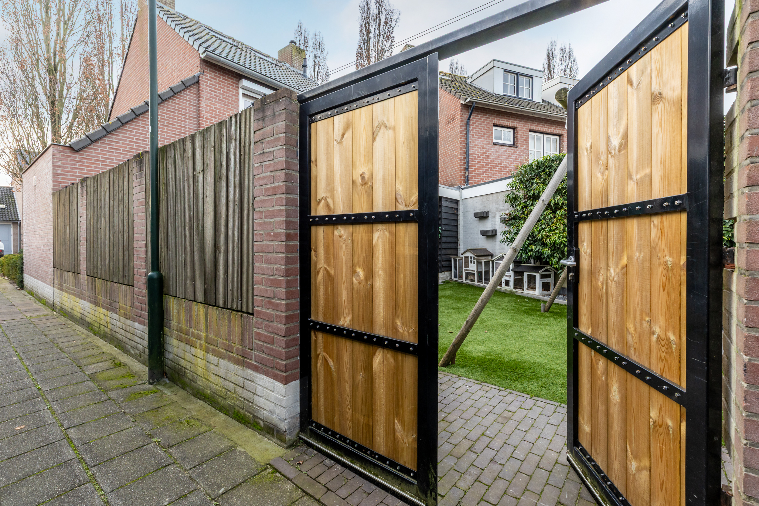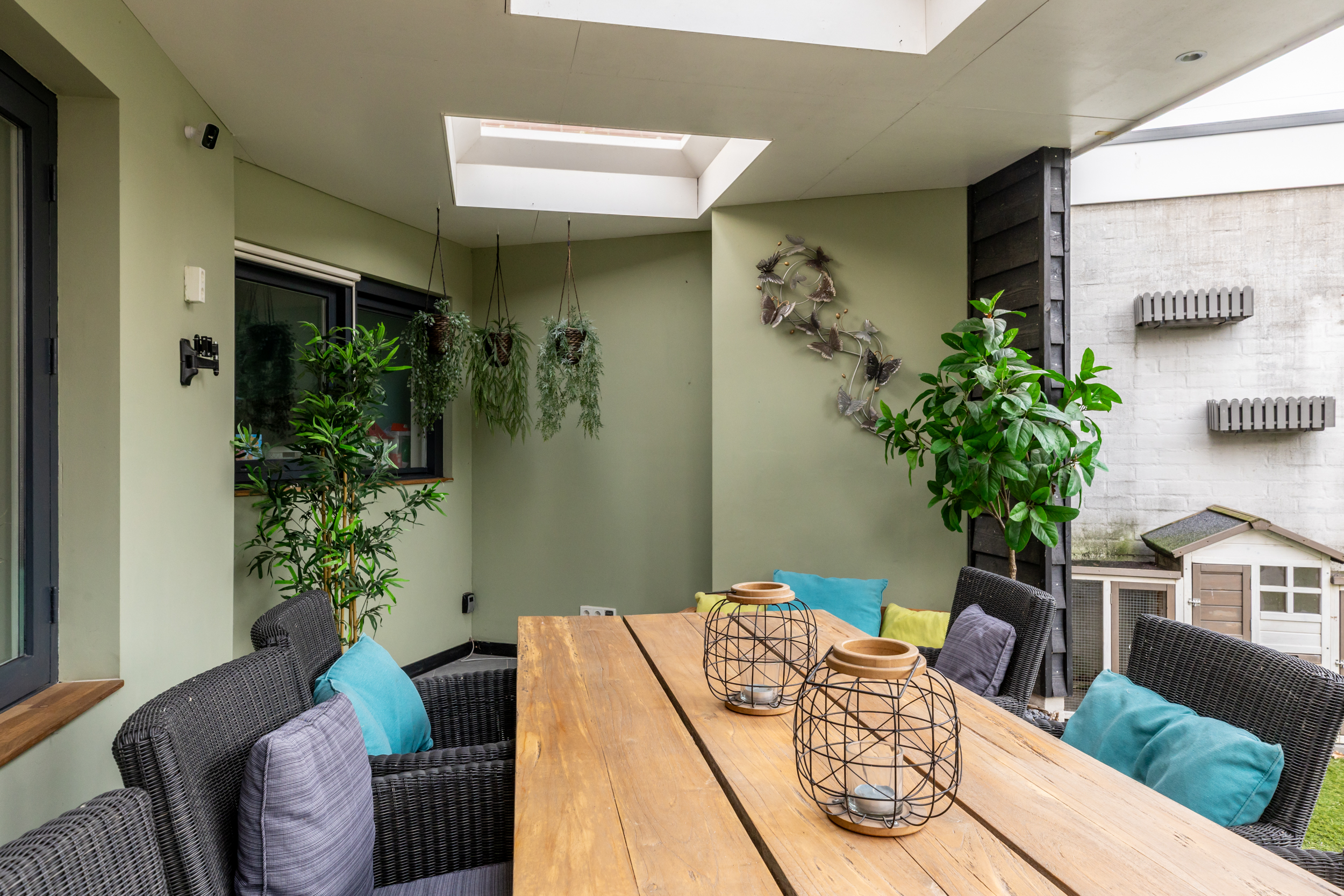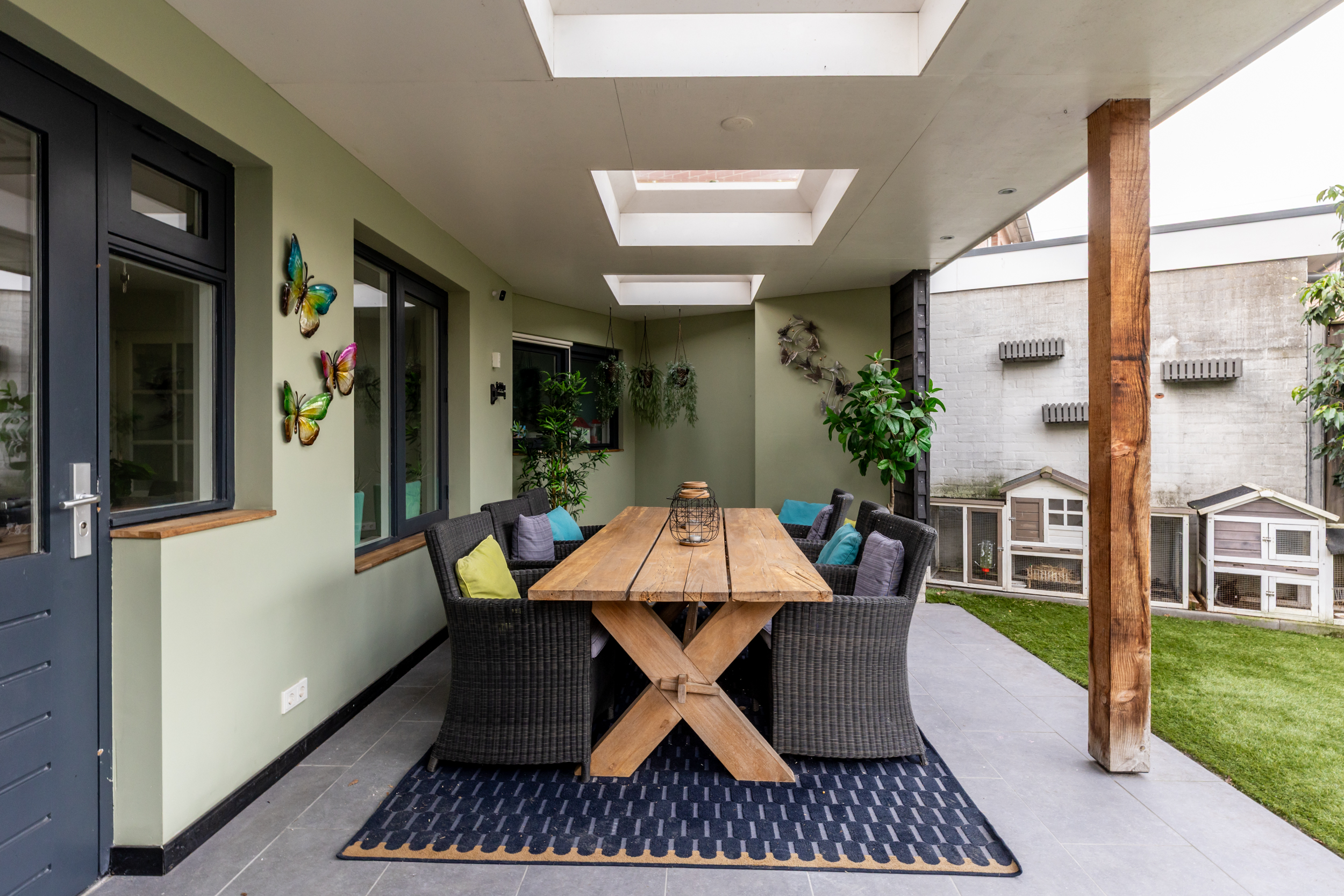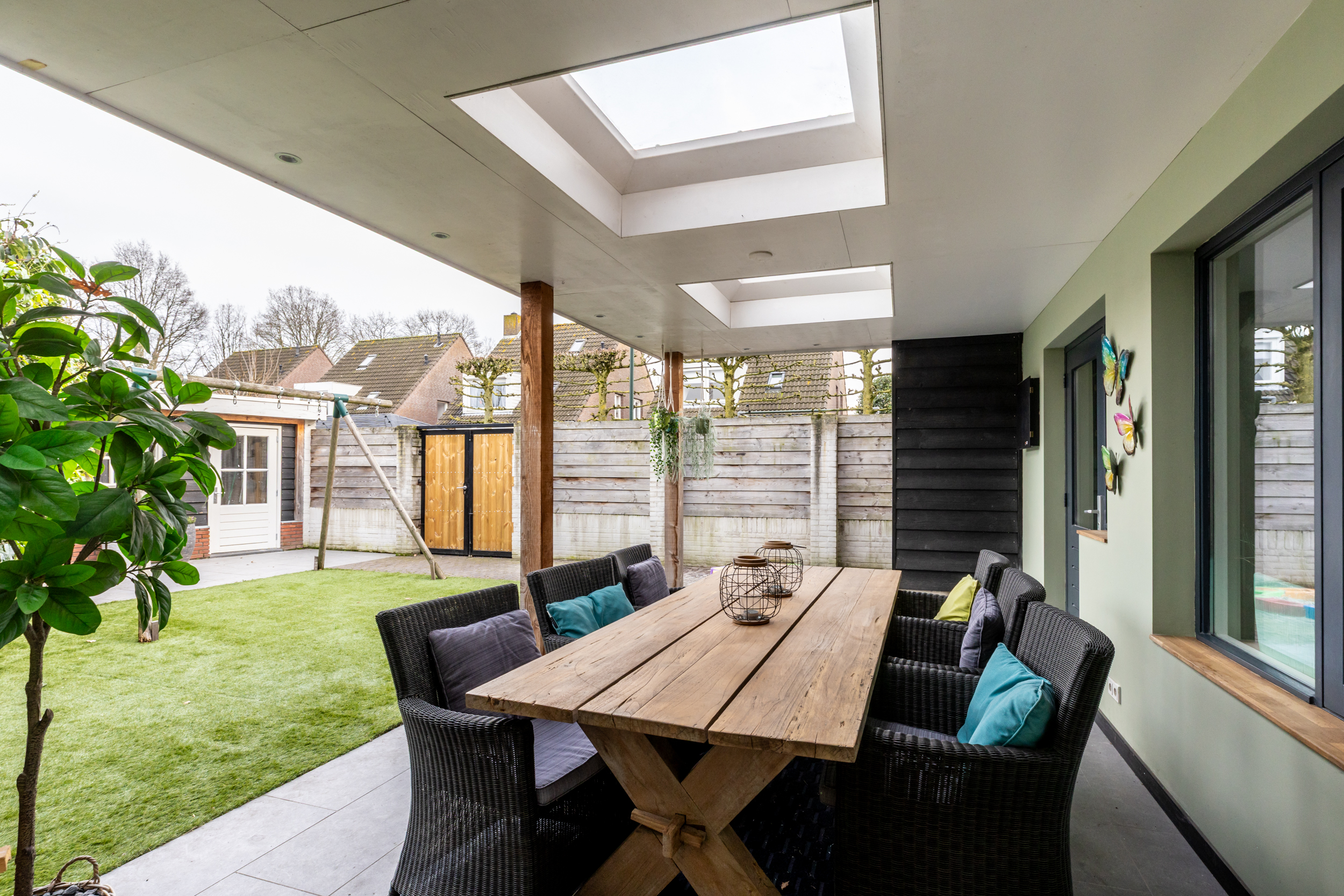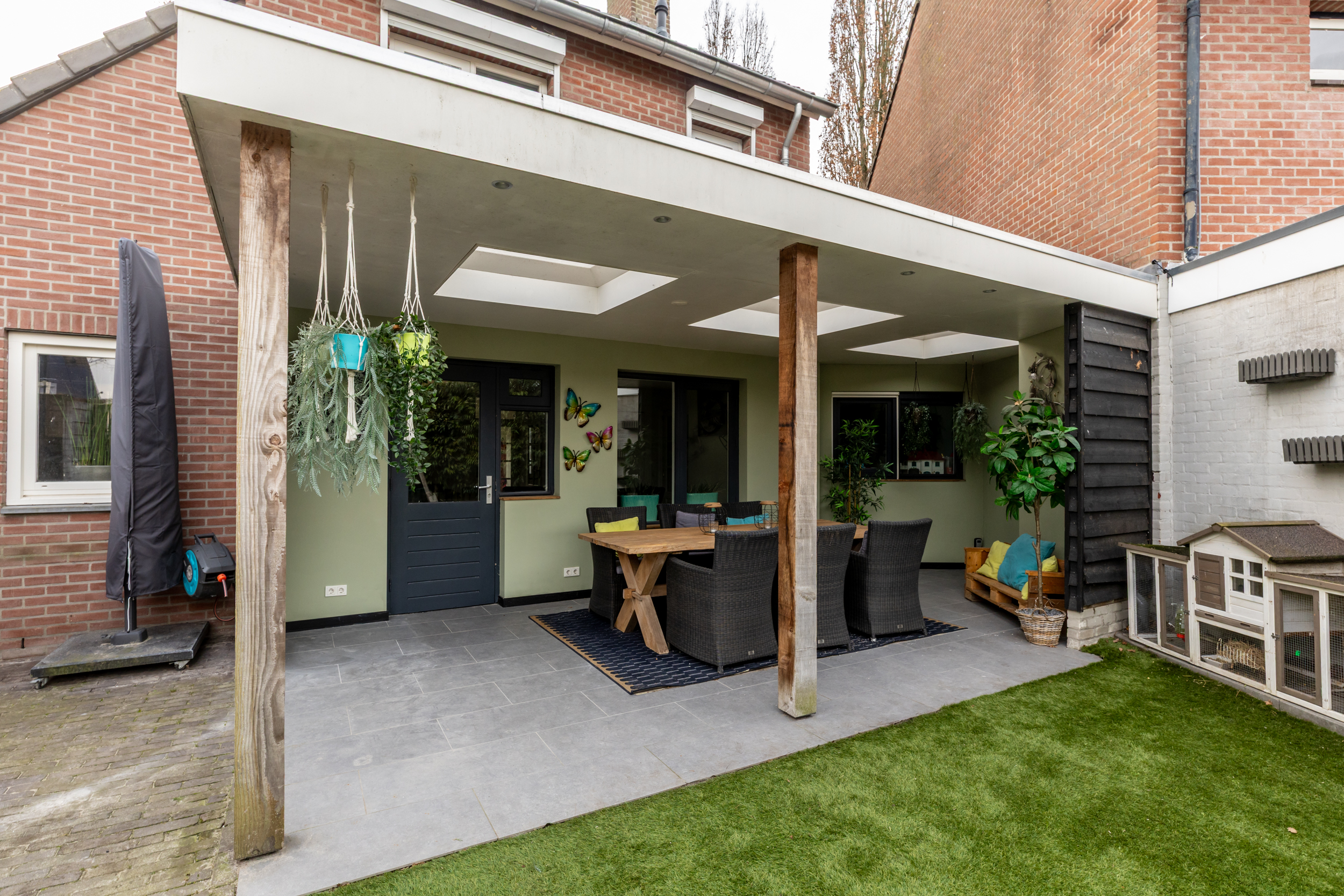 Aan de achterzijde van de woning is een fraaie overkapping gerealiseerd, met nieuwe dakbedekking (2024), die het buitenleven naar een hoger niveau tilt. Dankzij de lichtkoepels valt er veel natuurlijk daglicht binnen en is dit een plek waar u het hele jaar door kunt genieten. De overkapping vormt een verlengstuk van de woonkamer en maakt het buitenleven bijzonder aangenaam. Achterin de tuin bevindt zich een praktische bering en aan de zijkant een extra brede en vernieuwde tuinpoort.