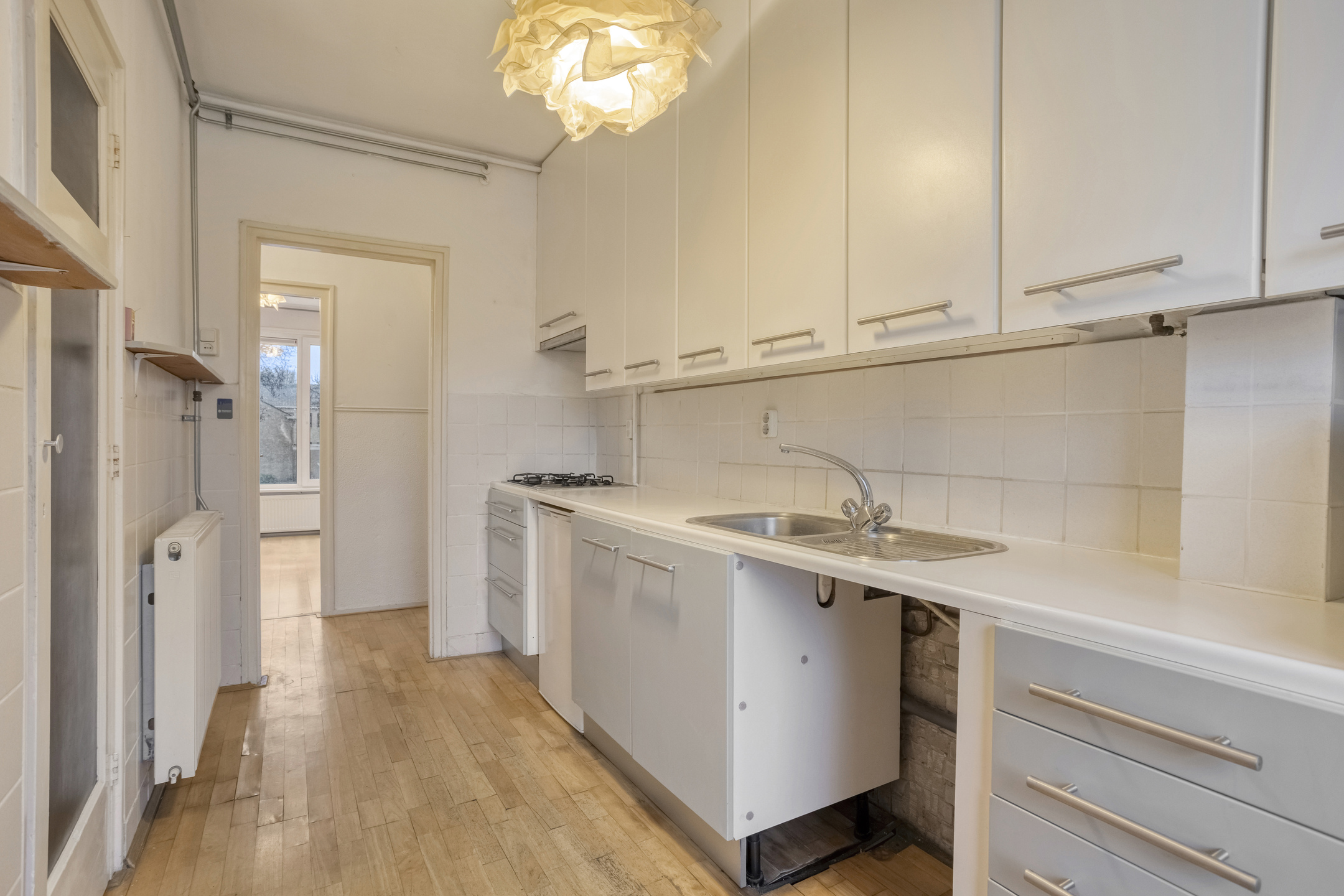 De afgesloten keuken is voorzien van een ruim en neutraal keukenblok. Er is een inbouwkast, ideaal voor extra bergruimte. In de keuken is ook de aansluiting van de wasmachine en de opstelling van de CV-ketel. Vanuit de keuken bereikt u het heerlijke balkon en de badkamer. De badkamer is neutraal betegeld en voorzien van een wastafel en een douche.
