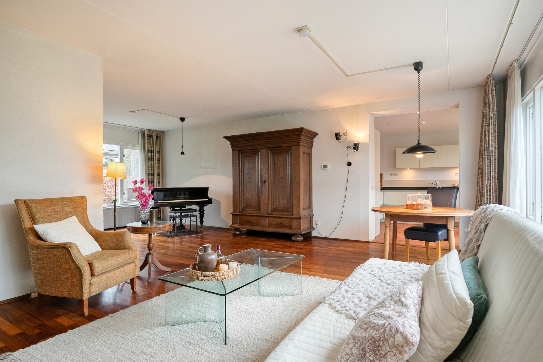 Bij binnenkomst treft u een ruime entreehal met stenen vloer, meterkast en een toilet. De royale woonkamer is licht en sfeervol en voorzien van grote raampartijen met dubbel glas, houten kozijnen, radiatoren en een gezellige houtkachel. In de woonkamer ligt een houten vloer en is er naast een fijne zithoek ook ruimte voor een extra eethoek, wat zorgt voor een speelse en functionele indeling.