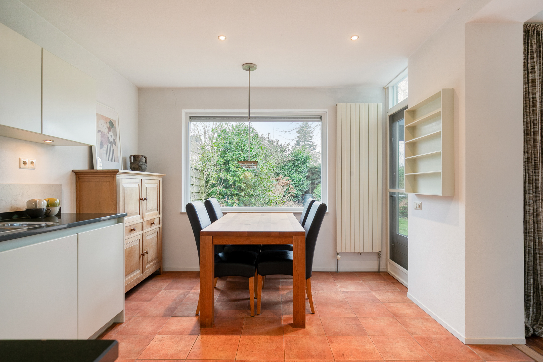 De keuken is later gemoderniseerd, waardoor een volwaardige woonkeuken is ontstaan. Deze is voorzien van een praktische tegelvloer en diverse inbouwapparatuur, waaronder een Miele inductiekookplaat, Siemens combi - oven, 1,5 spoelbak, ingebouwde vaatwasser en afzuigkap. Vanuit de keuken bereikt u de bijkeuken met wasgoedaansluiting en vaste kast. Aansluitend is er een doorgang naar de garage, die is voorzien van elektra en water.