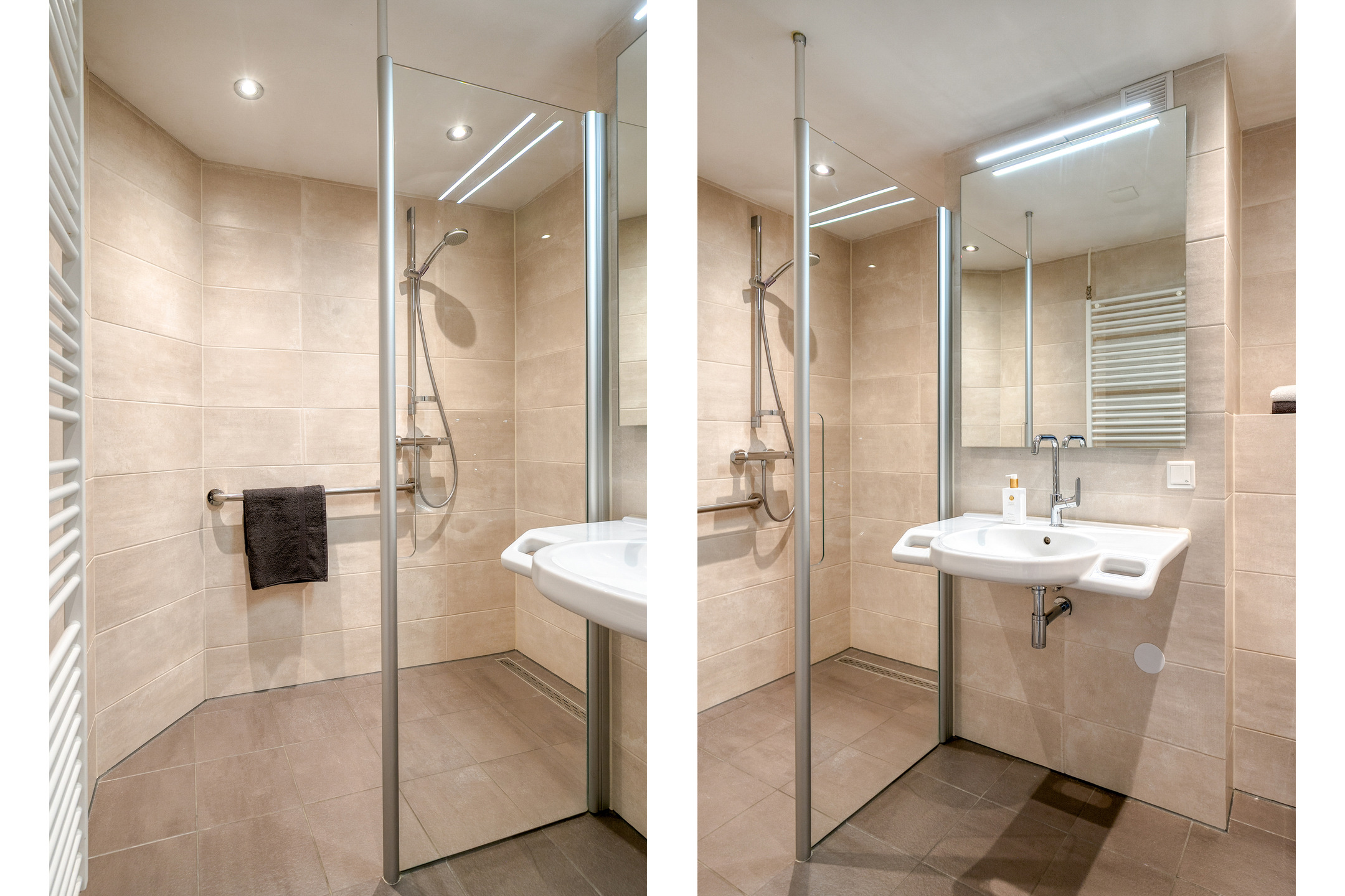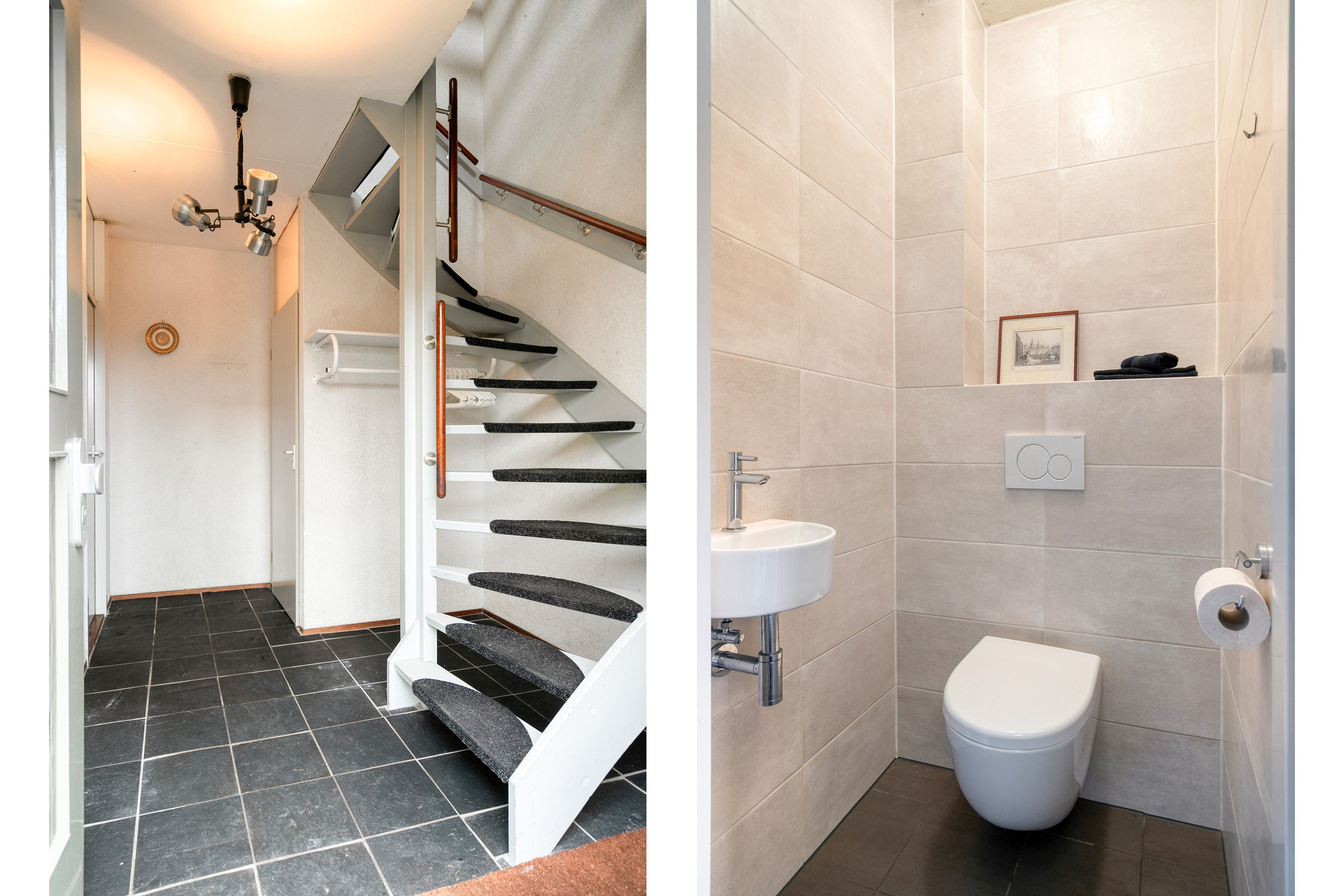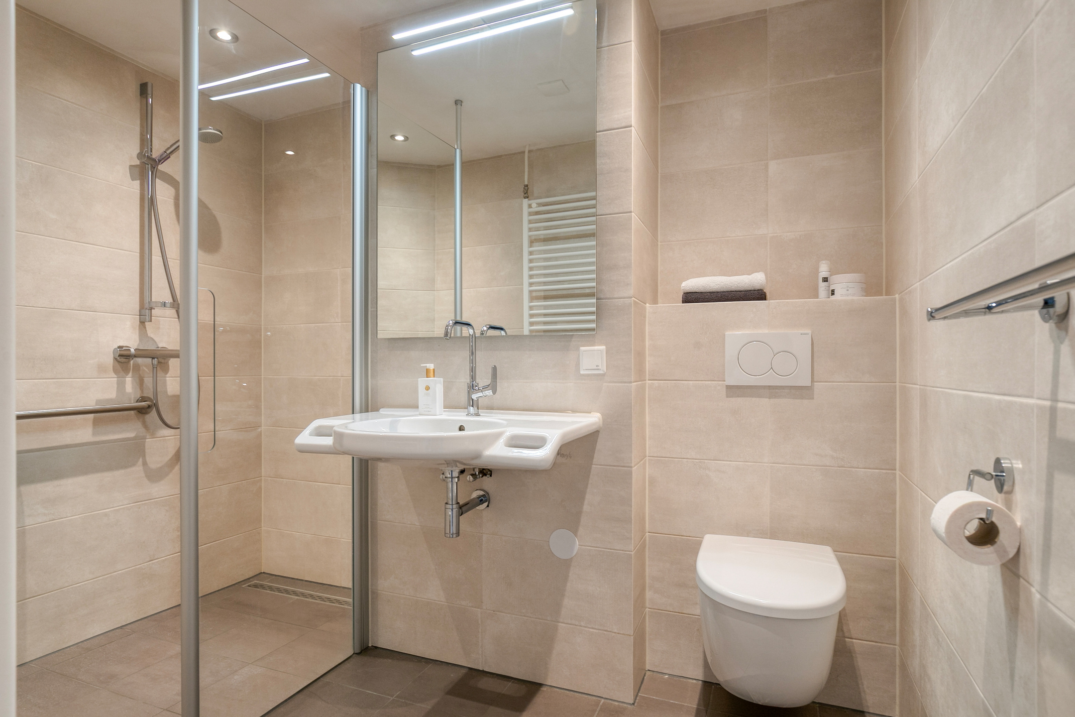 De badkamer is gemoderniseerd en voorzien van een schuifdeur. De ruimte is praktisch ingericht met een toilet, wastafel, inloopdouche en designradiator.