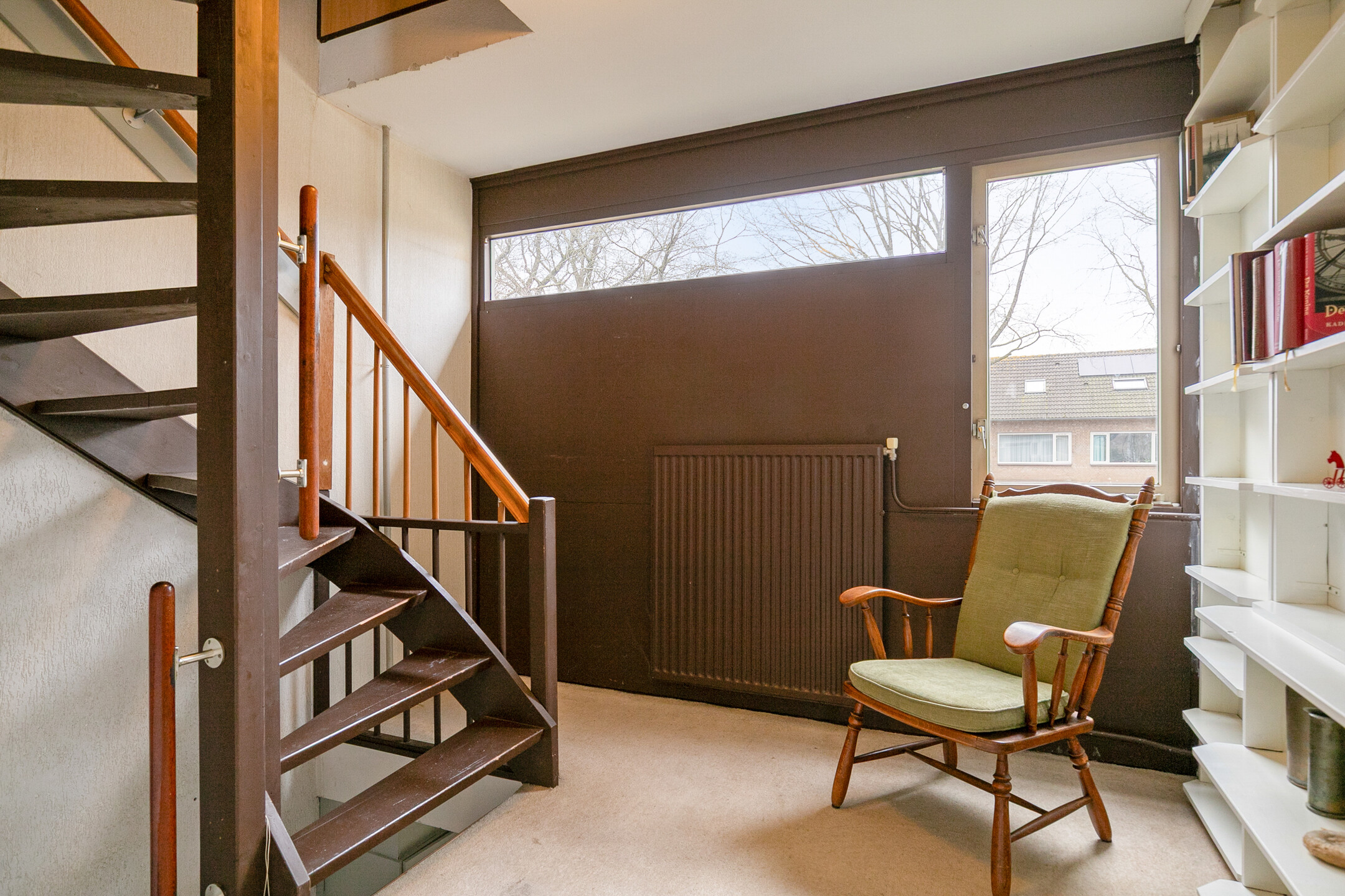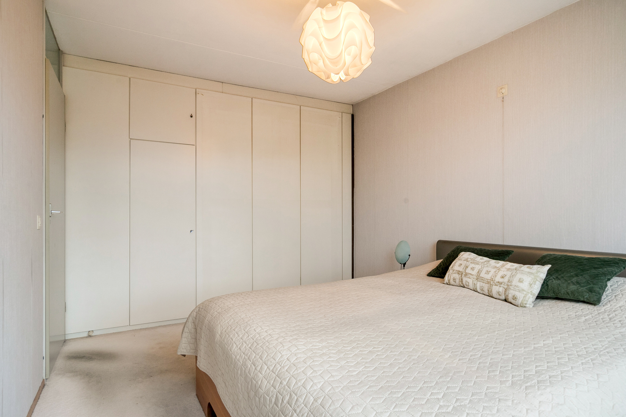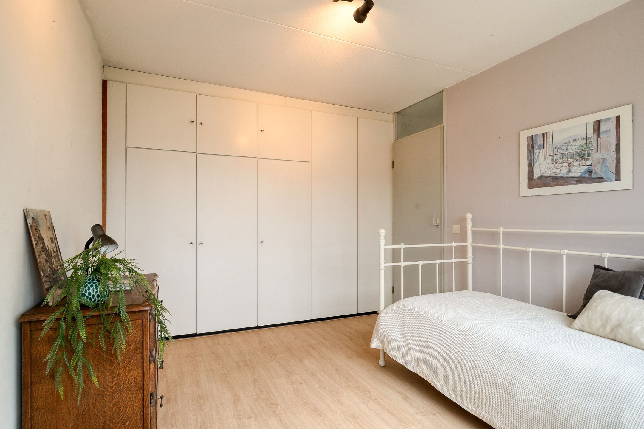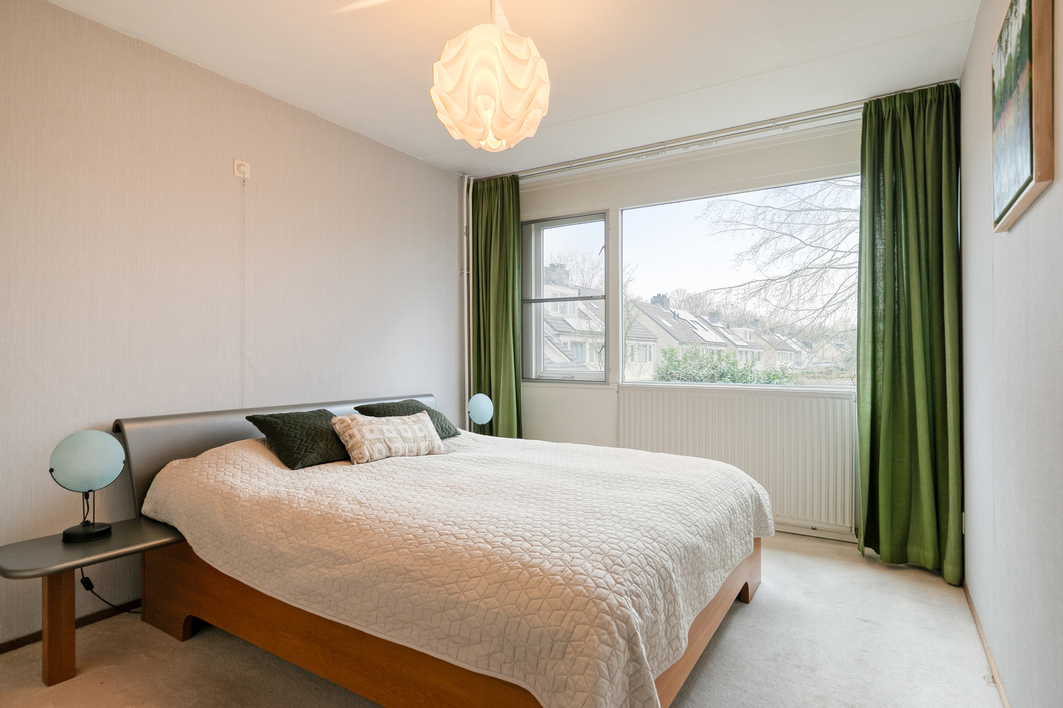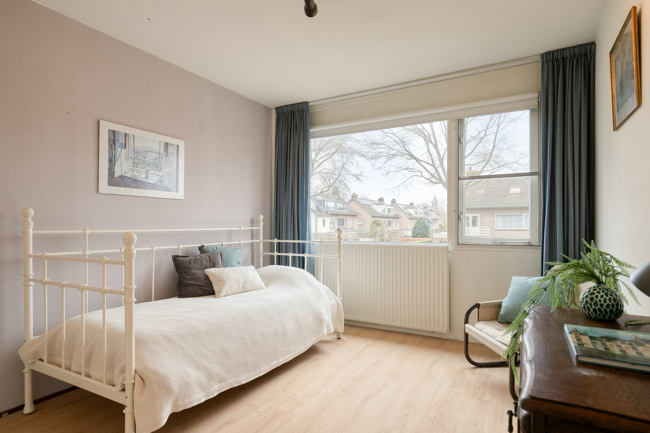 Overloop met een multifunctionele bibliotheekruimte met boekenkasten. Deze ruimte is ook uitstekend in te delen als speelkamer, hobbyruimte of kantoorkamer. Vanuit deze ruimte is er toegang tot de hal met toegang tot drie ruime slaapkamers en de badkamer. Slaapkamer aan de voorzijde is voorzien van laminaat, slaapkamer aan de achterzijde van vloerbedekking en kleine slaapkamer aan de achterzijde voorzien van zeil. Twee slaapkamers, waaronder de royale hoofdslaapkamer, bieden uitzicht op de tuin. Alle kamers beschikken over radiatoren en enkel glas. De royale hoofdslaapkamer heeft een kastenwand die indeelbaar is naar wens.