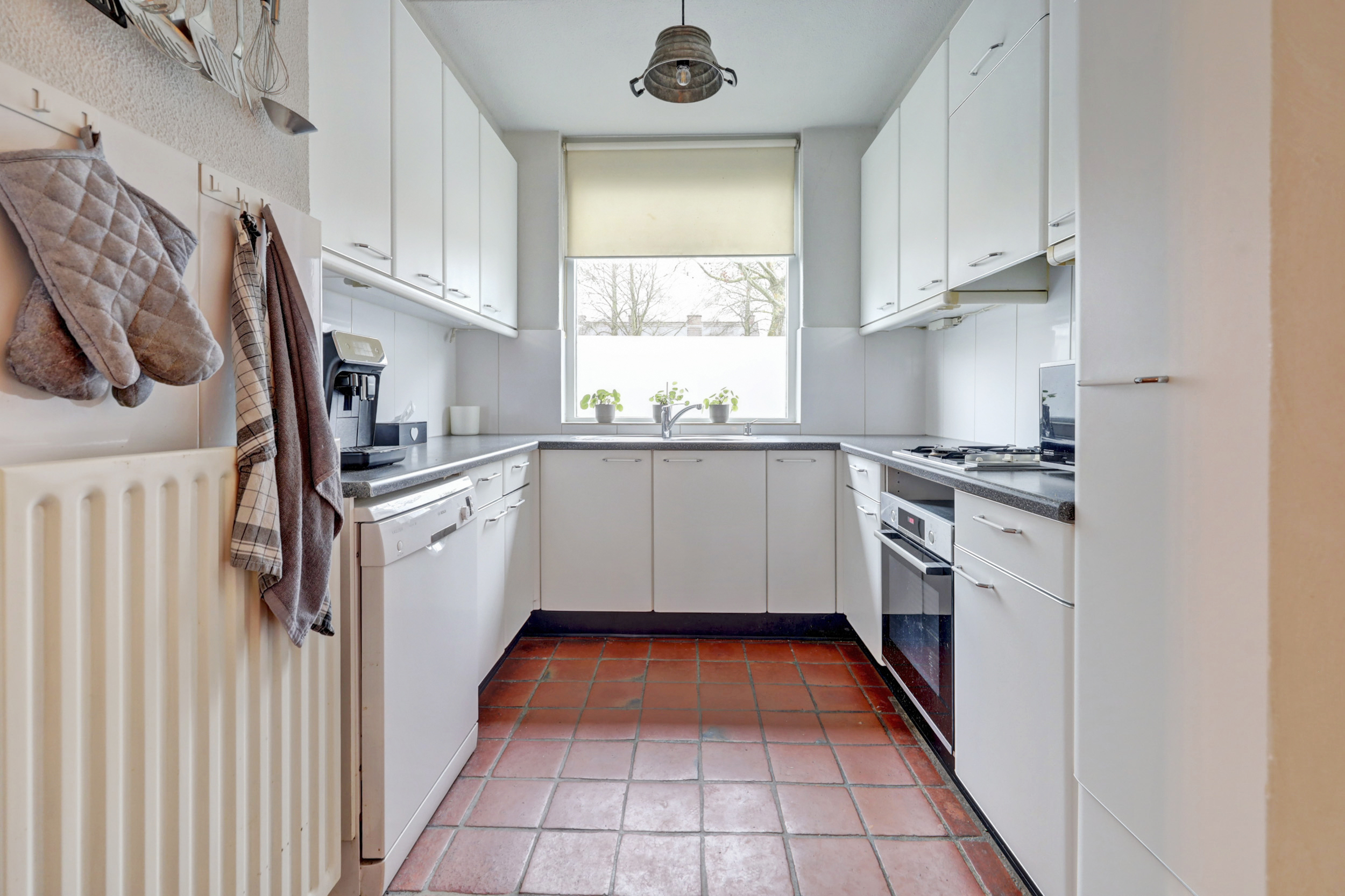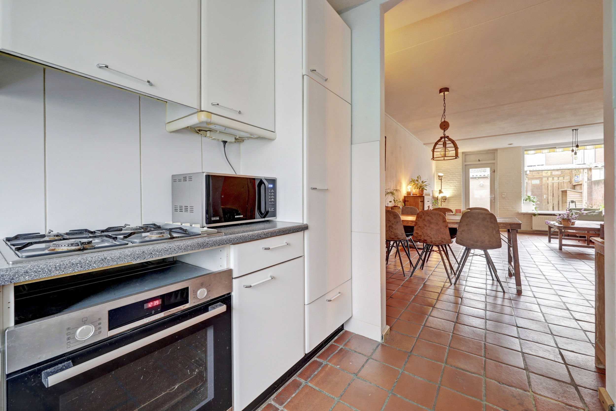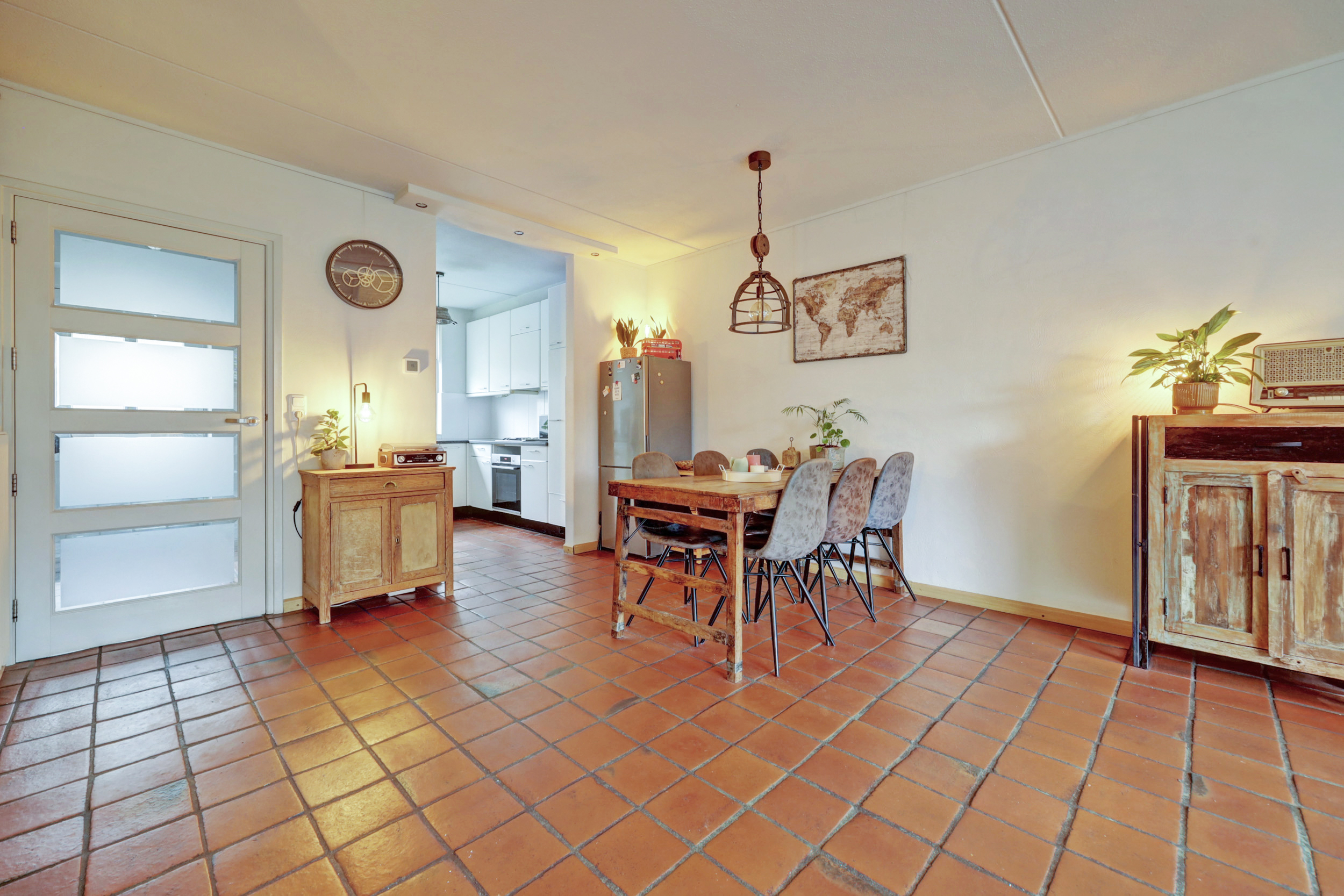 We betreden de woning via de voordeur en komen terecht in de entreehal. Vanuit hier hebben we toegang tot de meterkast, de toiletruimte, de trap naar de eerste verdieping en de woonkamer. De woonkamer is uitgebouwd en daardoor ruim genoeg voor een gezellige zithoek en een eettafel. Dankzij de indeling is dit een prettige leefruimte voor het hele gezin. Aan de voorzijde van de woning bevindt zich de open keuken. Deze is voorzien van diverse inbouwapparatuur zoals een heteluchtoven, 4-pits gasfornuis, vaatwasser en een koelkast.