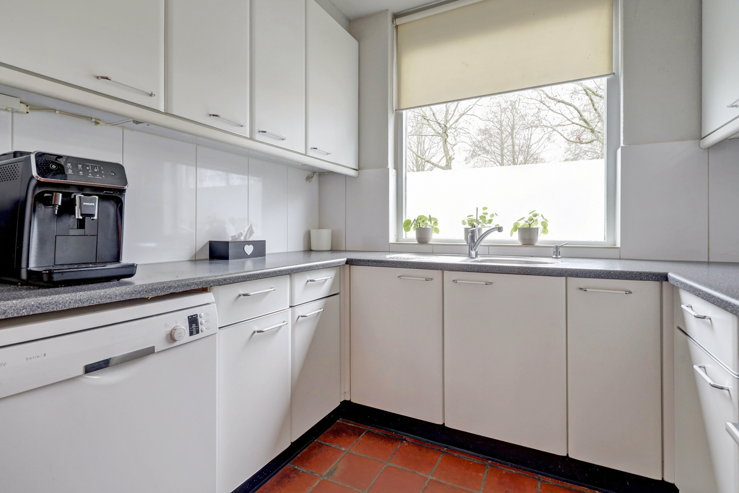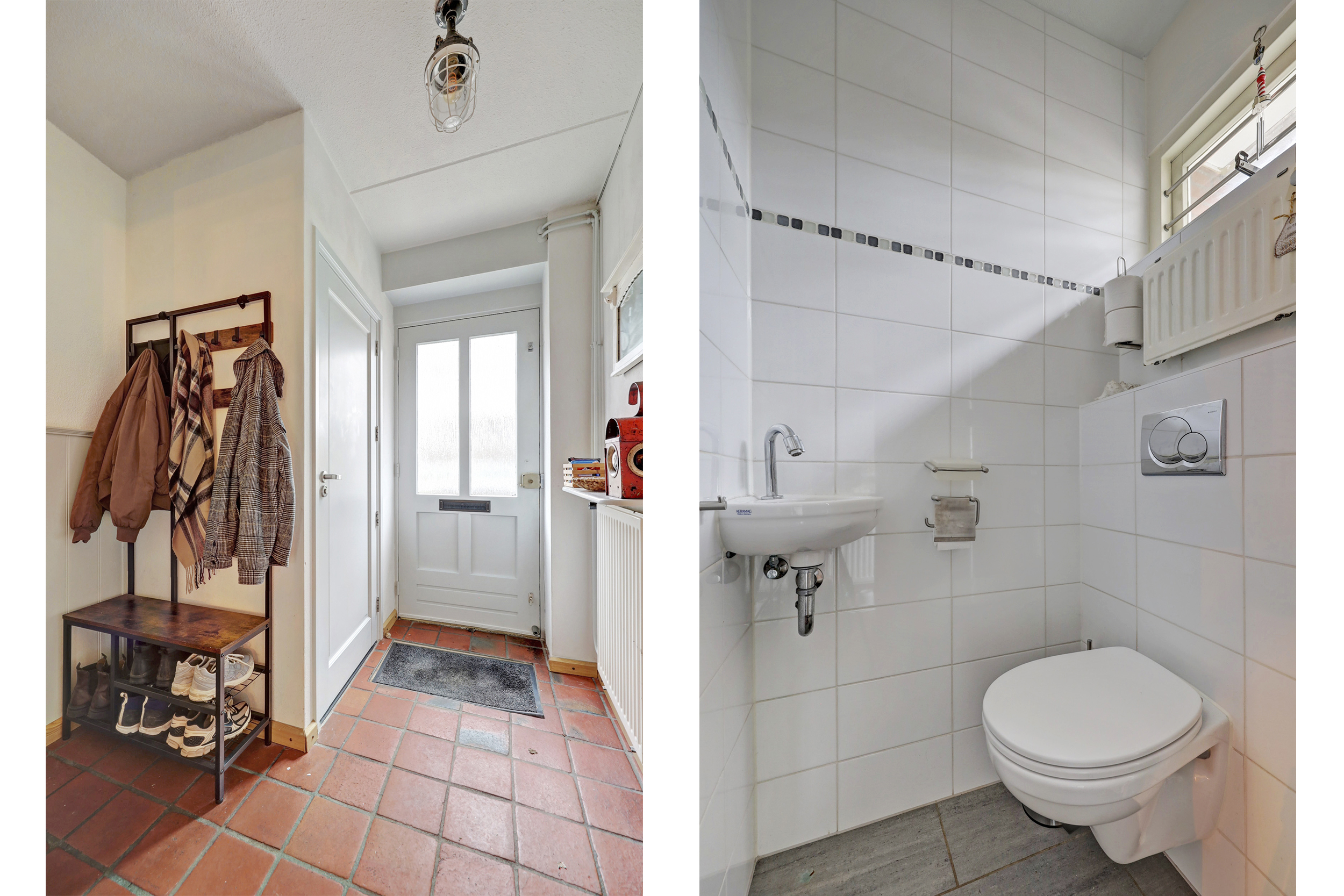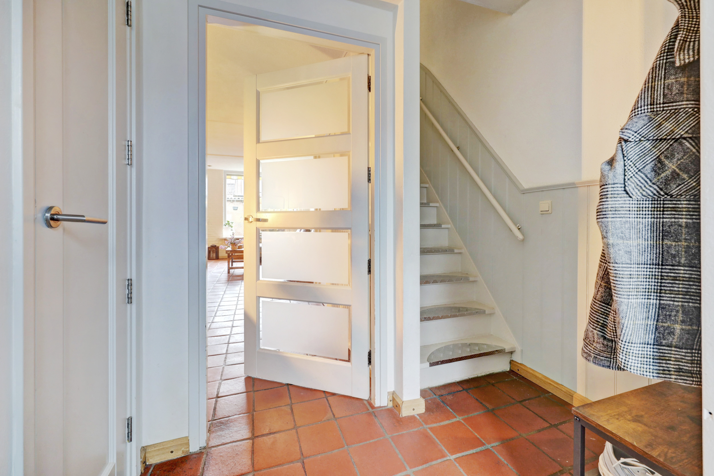 We betreden de woning via de voordeur en komen terecht in de entreehal. Vanuit hier hebben we toegang tot de meterkast, de toiletruimte, de trap naar de eerste verdieping en de woonkamer. De woonkamer is uitgebouwd en daardoor ruim genoeg voor een gezellige zithoek en een eettafel. Dankzij de indeling is dit een prettige leefruimte voor het hele gezin. Aan de voorzijde van de woning bevindt zich de open keuken. Deze is voorzien van diverse inbouwapparatuur zoals een heteluchtoven, 4-pits gasfornuis, vaatwasser en een koelkast.