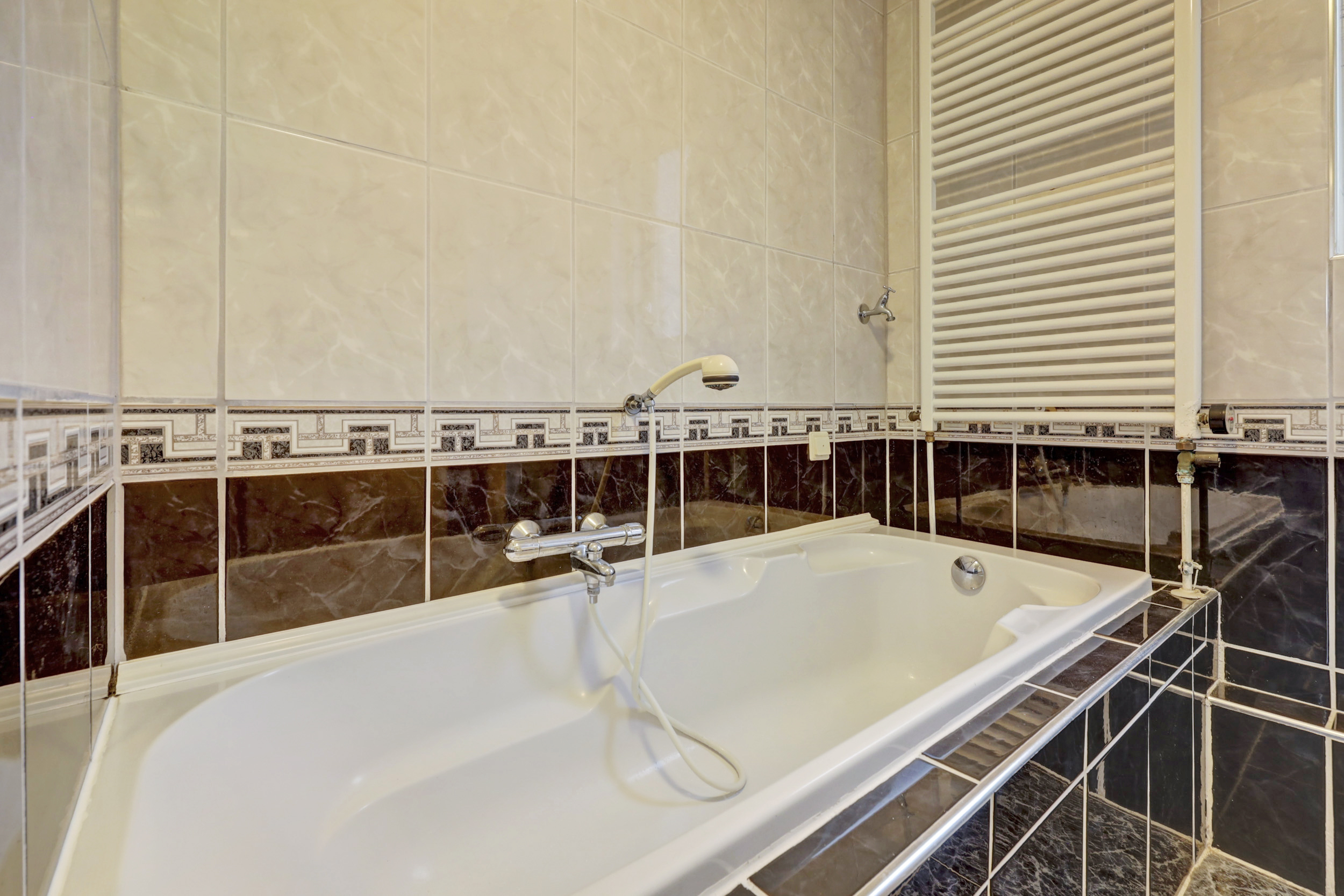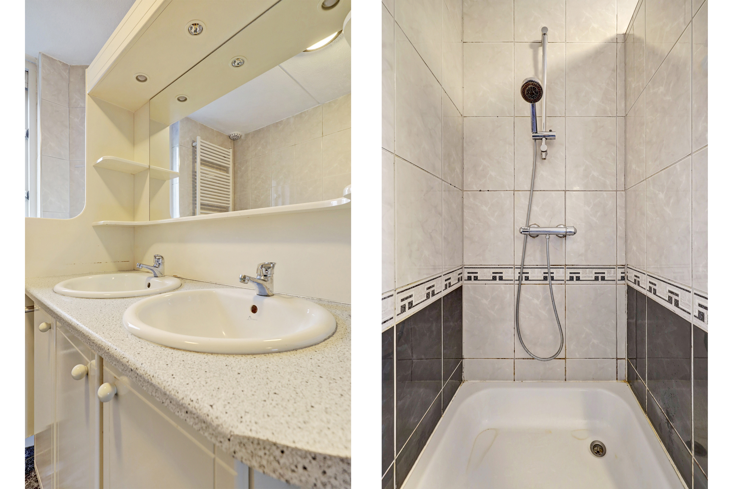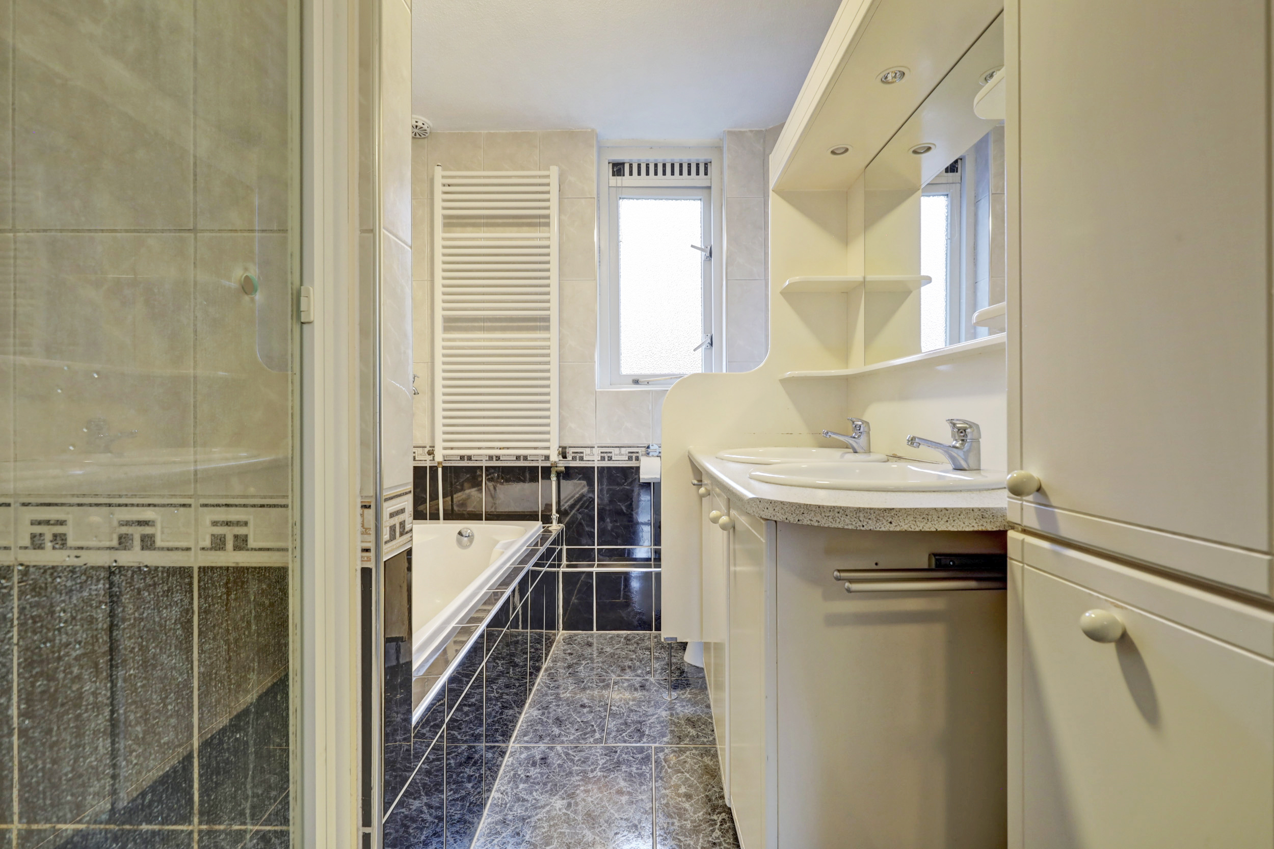 - Ligbad, toilet, douche, dubbele wastafel en wastafelmeubel