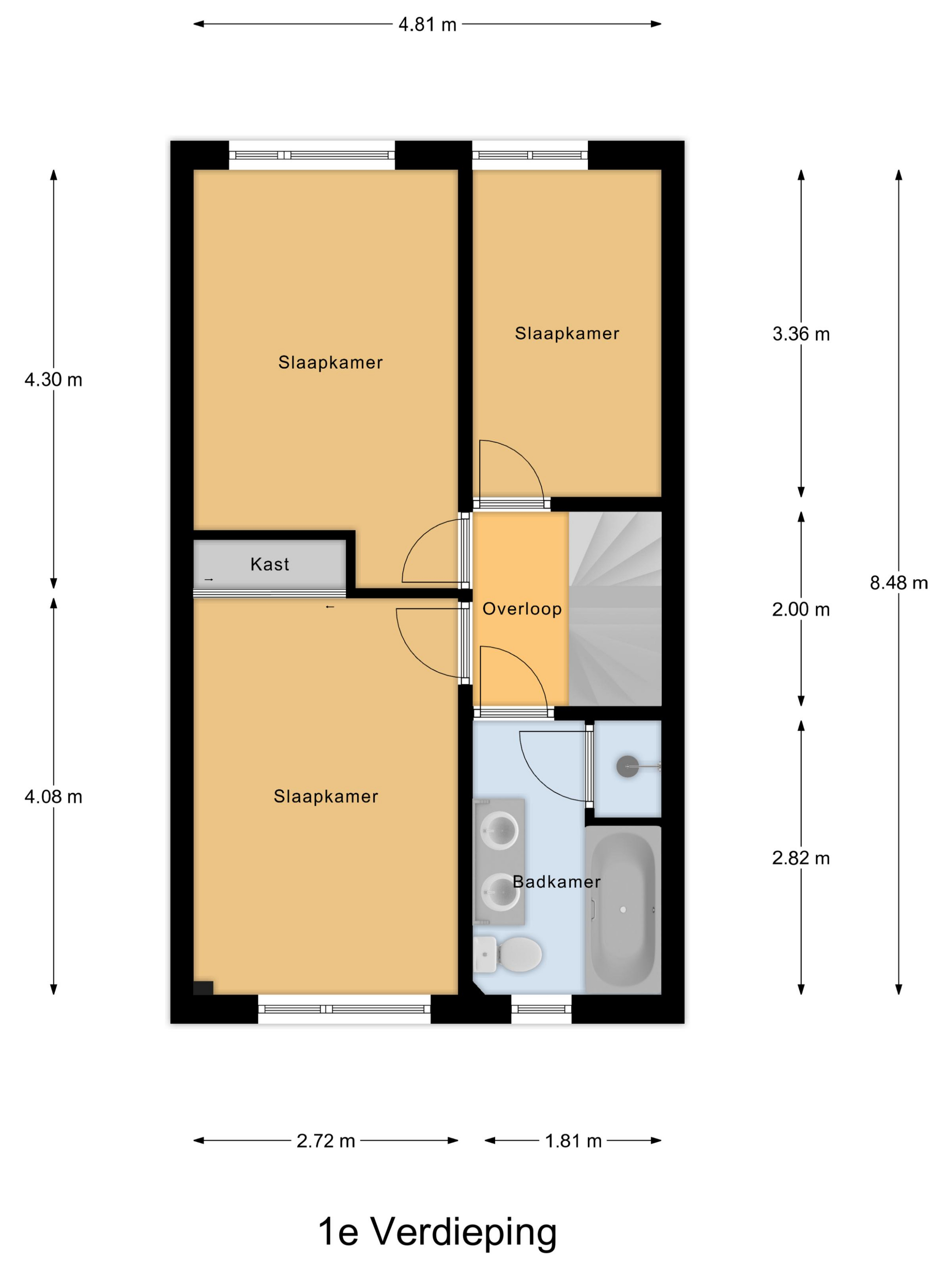 Via de trap in de entreehal bereiken we de eerste verdieping. Hier komen we uit op een overloop met toegang tot drie slaapkamers en de badkamer. Aan de voorzijde van de woning bevindt zich de hoofdslaapkamer, groot genoeg voor een tweepersoonsbed en voorzien van een inbouwkast. De twee slaapkamers aan de achterzijde zijn veelzijdig in te richten als kinderkamer, hobbyruimte of kantoor. De badkamer is compleet uitgerust met een toilet, ligbad, douche en een dubbele wastafel met meubel. Deze verdieping vormt een uitstekende basis voor een gezin.