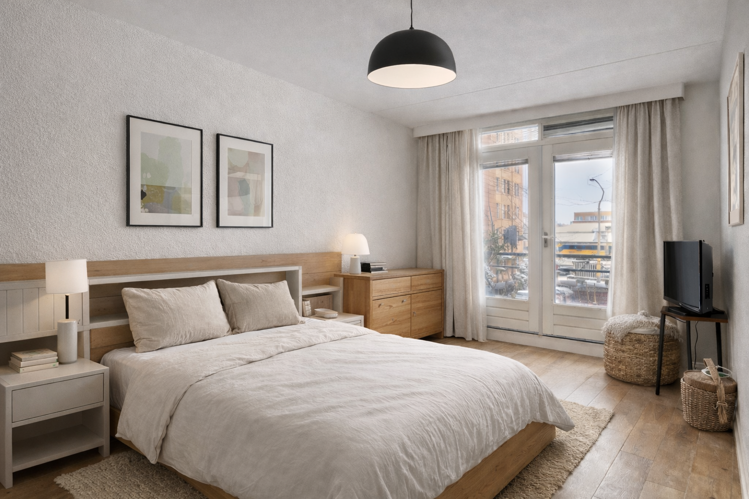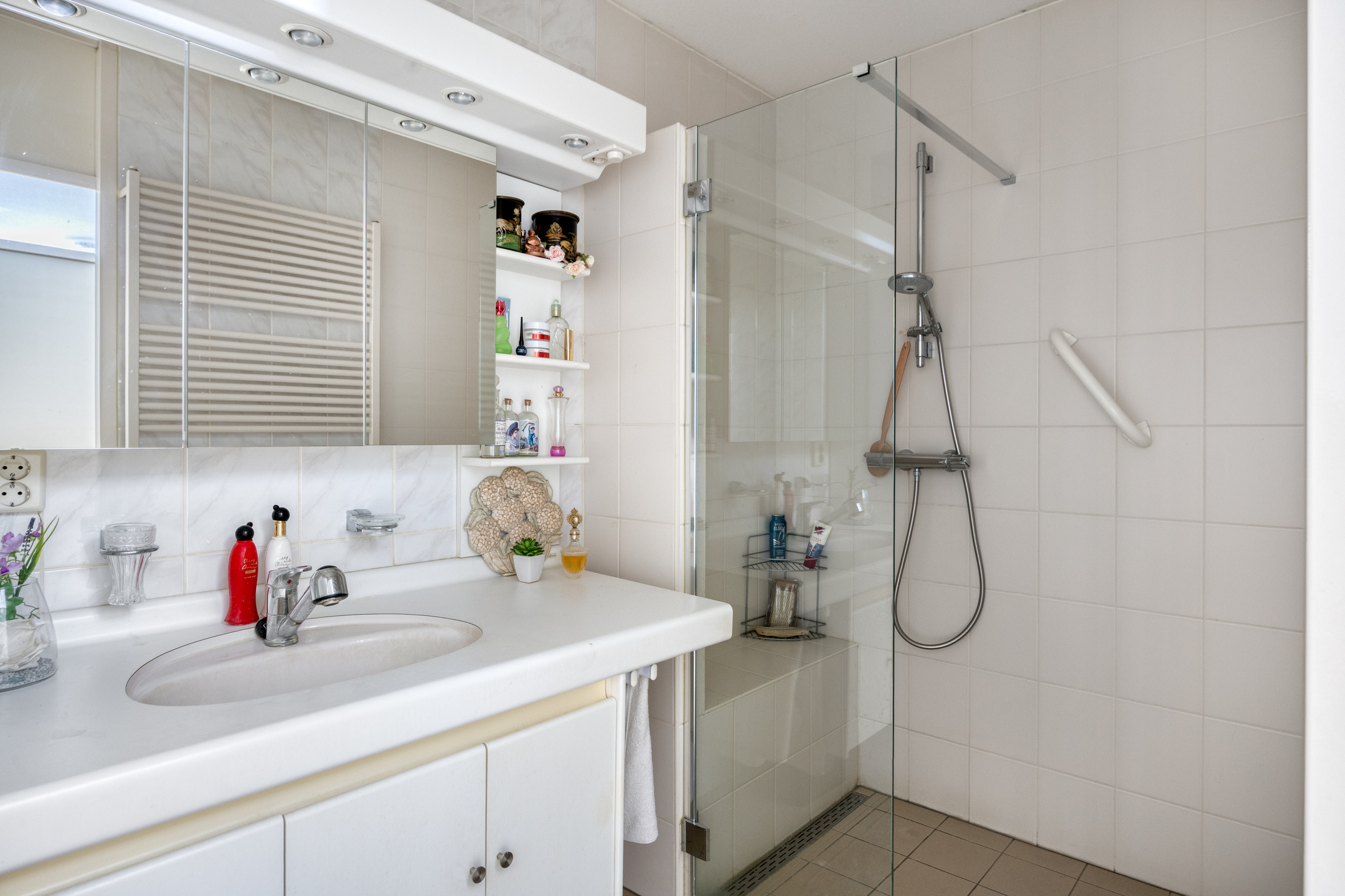 Het appartement beschikt over twee ruime slaapkamers. Beide slaapkamers bieden directe toegang tot het balkon, wat zorgt voor een prettige verbinding tussen binnen en buiten. De kamers zijn goed van formaat en geschikt als slaap-, werk- of logeerkamer. De badkamer is uitgevoerd in een lichte kleurstelling en voorzien van een inloopdouche en wastafelmeubel. De separate toiletruimte is eveneens netjes afgewerkt en voorzien van een fonteintje. Vanuit de hal bereikt u tevens de inpandige berging/technische ruimte met aansluitingen voor de wasapparatuur en extra bergruimte.