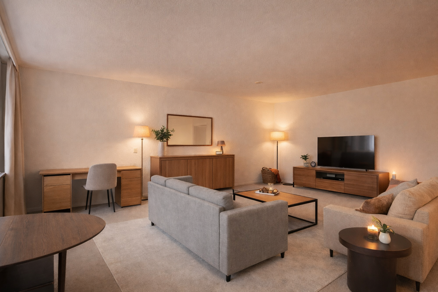 - U heeft de beschikking over een riante living met ruime keuken, twee slaapkamers, een eigen parkeerplaats en berging.