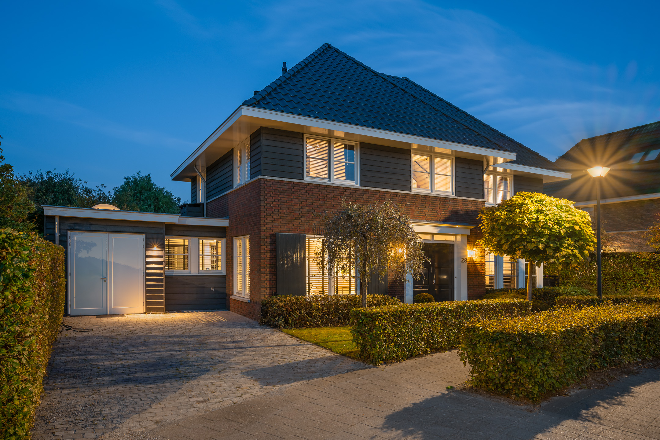 Ook de voortuin is met evenveel aandacht ontworpen en aangelegd. De stijlvolle beplanting, het verzorgde lijnenspel en de royale oprit dragen bij aan de statige uitstraling van de villa en maken het totaalplaatje compleet.