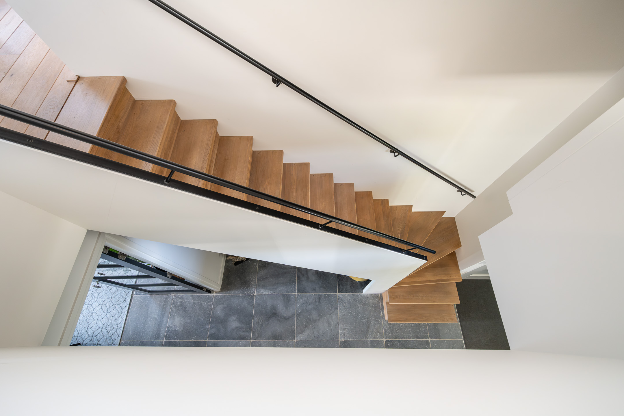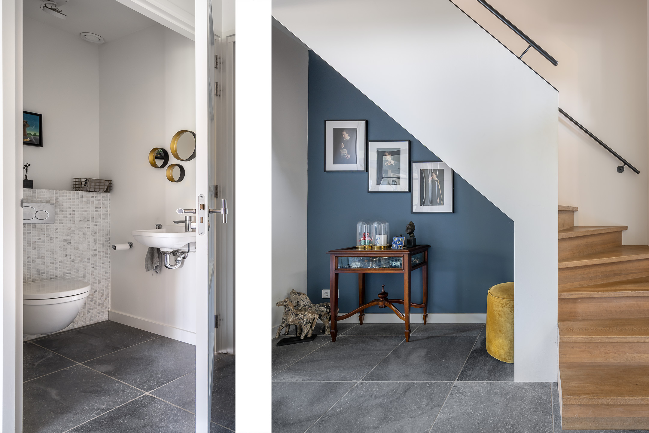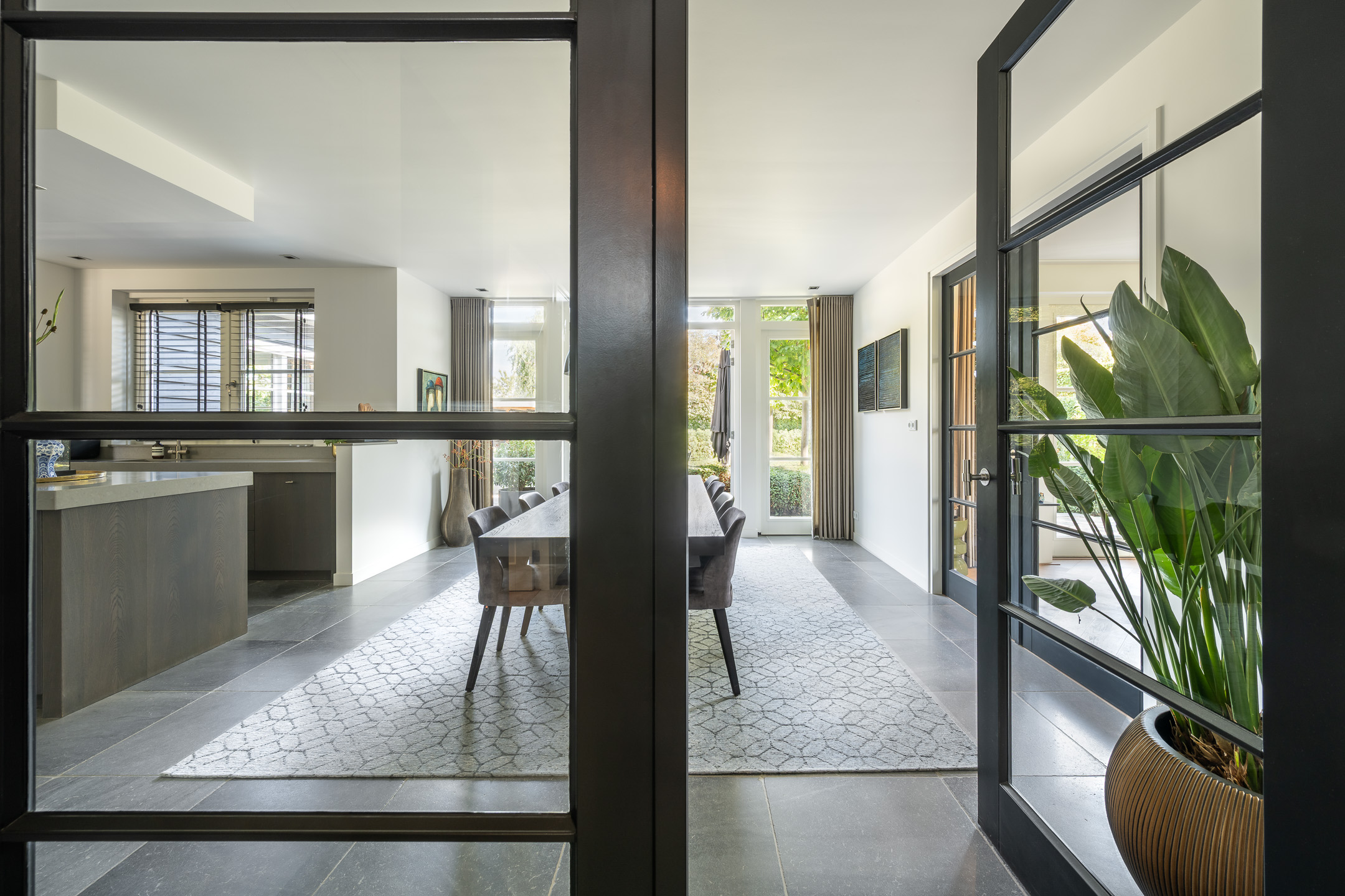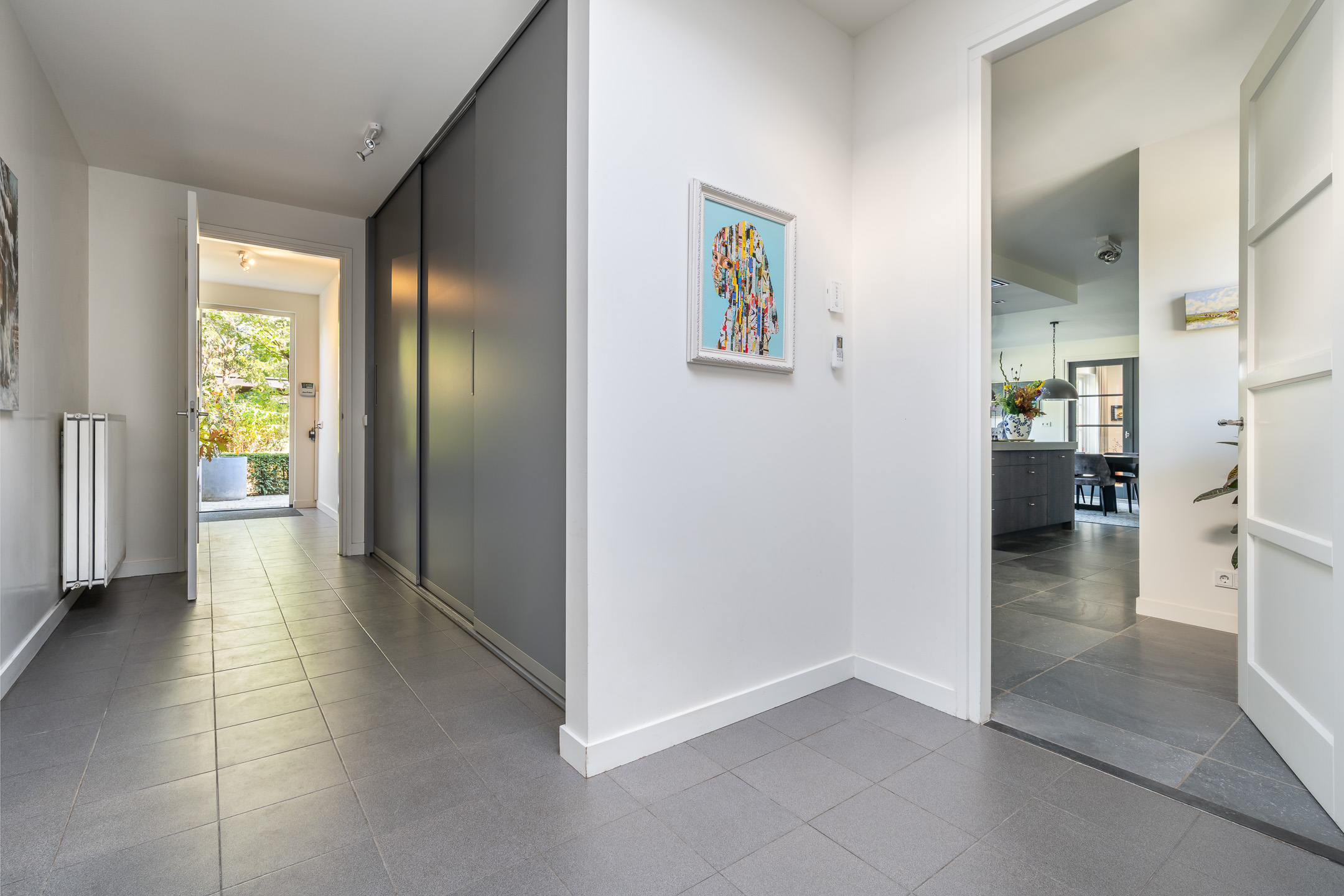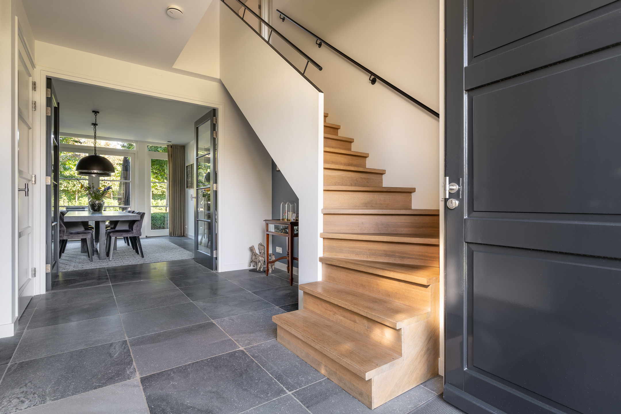 Via de royale entree met dubbele deuren betreedt u de indrukwekkende hal, die direct de toon zet voor de rest van de woning. Deze open hal met vide voelt ruimtelijk en licht dankzij de hoge plafonds en grote raampartijen die het daglicht overvloedig binnenlaten. De natuurstenen vloer loopt elegant door richting de woonkamer, waar hij subtiel wordt afgewisseld met een warme houten vloer. De combinatie van deze materialen zorgt voor een harmonieuze balans tussen robuuste luxe en natuurlijke warmte. De fraaie trap vormt een stijlvol middelpunt in de hal en benadrukt het open karakter van deze prachtige ruimte. In de hal bevinden zich tevens de meterkast en het fraai afgewerkte toilet. Links van de entree ligt een prachtig, licht kantoor met op maat gemaakte kastenwand en een houten vloer, een stijlvolle en rustige werkruimte die perfect aansluit bij de sfeer van de woning.